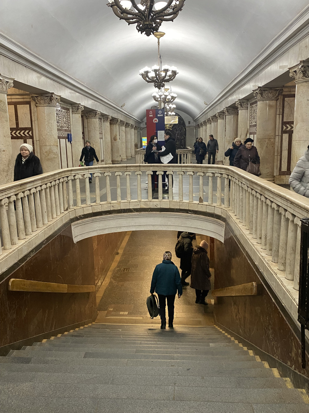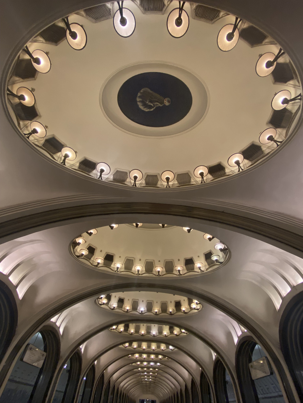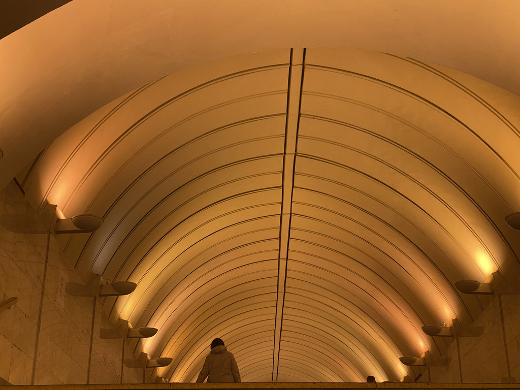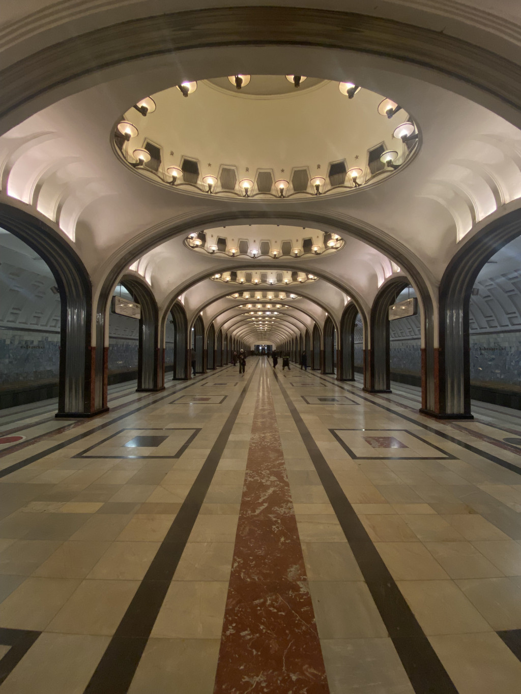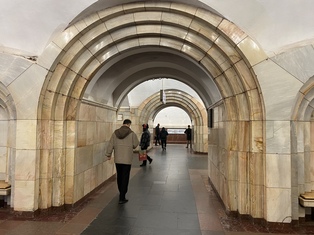 莫斯科地铁被公认为世界上最漂亮的地铁,可谓艺术圣殿,地铁站里有雕塑、壁画、时装、灯影、艺术装置等各种艺术表现,风格各异,美轮美奂。莫斯科地铁于1935年开通,运营路线长度为全球第五大,除了通行功能,还考虑了战时的防护要求,可供400余万居民掩蔽之用。地铁票分单次、一天、三天、三十天等多种票型,单次票乘坐65卢布,不论进出站点,一天票乘坐315卢布,不计次数乘坐,票可以在自助机上购买,刷卡和现金都可以。今天既然是地铁主题游,我们就买了一天票,从一号线的索科尔尼基站进站,沿着5号线的站点游览。共青团站是莫斯科地铁中最富丽堂皇的站,月台上的拱门、吊灯,顶上繁复的石膏装饰线条和壁画,浓浓的巴洛克风格,站厅里还立有一尊列宁的雕像。白俄罗斯站的顶上铺满白色的石膏浮雕图案,中间嵌着一些表现人民生活的彩石马赛克壁画,地板图案是白俄罗斯传统装修风格。基辅站的墙上排列着许多壁画,以乌克兰的独特风情为背景,表现了顿河的哥萨克、乌克兰姑娘的舞蹈,以及克里米亚和黑海的迷人景致。胜利公园站一度是世界上最深的地铁,深达97米,搭乘一条长达126米的自动扶梯,犹如进入时光隧道,需要3分钟左右到达月台,胜利公园站的大理石立体装饰是特色,大理石的装饰表现了人民文体、休闲等日常活动,雕刻栩栩如生。十月站的名字是为了纪念附近的十月广场,装饰风格致力于表现在卫国战争中战胜法西斯侵略者的胜利主题,在车站的尽头,有一个后殿,在帝国风格的仪式围栏后,顶面是代表天空的蓝色。保罗列兹站,是一座大理石打造的梦幻城堡,墙面、地面、栏杆、扶手都是厚重的大理石,对称的巴洛克柱、墙上镂空的几何造型装饰、顶部壁龛中苏联时期主题的铜制浮雕画,都给人一种历史的厚重感。马雅可夫斯基站是为了纪念苏联诗人马雅可夫斯基而命名,它的的建筑风格被归入当时的“斯大林式新古典主义”,以简约大气的墙柱式结构取代传统的塔柱式结构,并以金属和石材混搭的方式,将当时流行的装饰艺术风格推到极致。月台两侧的每座大理石拱门都镶着不锈钢。月台地面中心铺设一长条红色大理石,犹若红毯。地铁站最吸引人的地方是天花板,在若干灯饰围成的各个圆形凹顶里,中间镶嵌着苏联名画家杰伊涅卡的马赛克壁画,一个圆凹顶内一幅,共有31幅,该设计方案于1938年在纽约国际展上获得大奖,使“马雅可夫斯基”站成为世界级的地铁站。