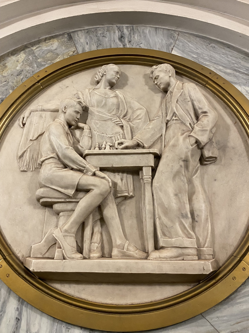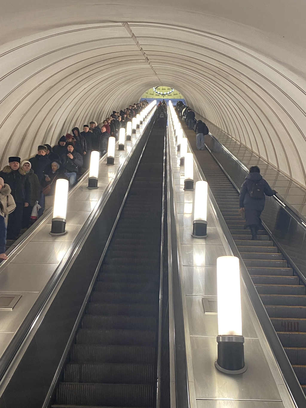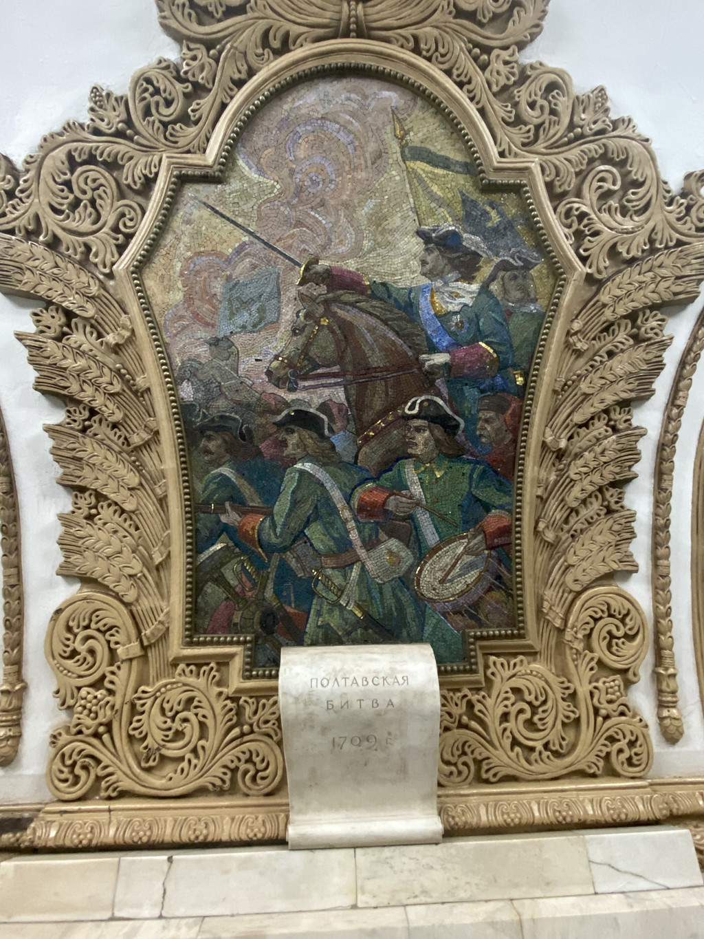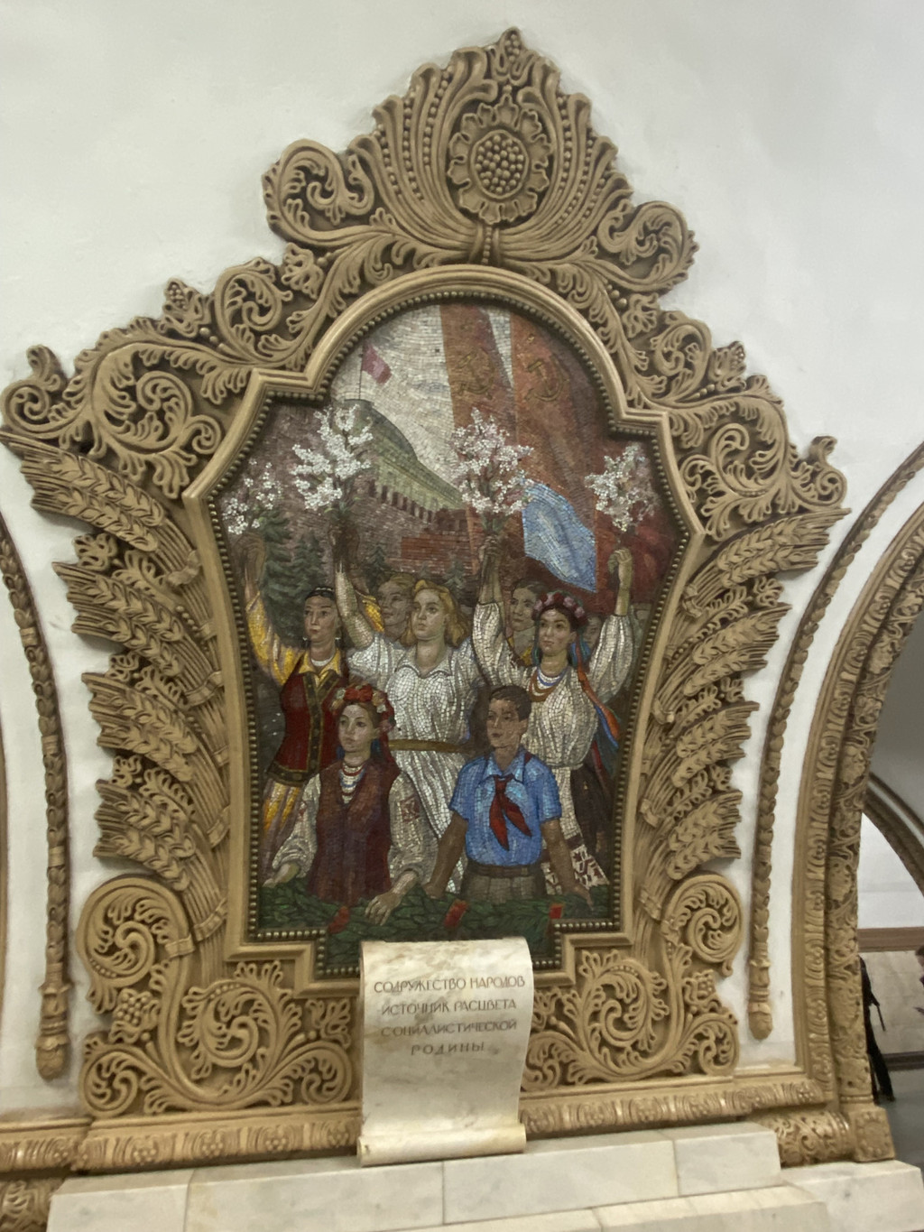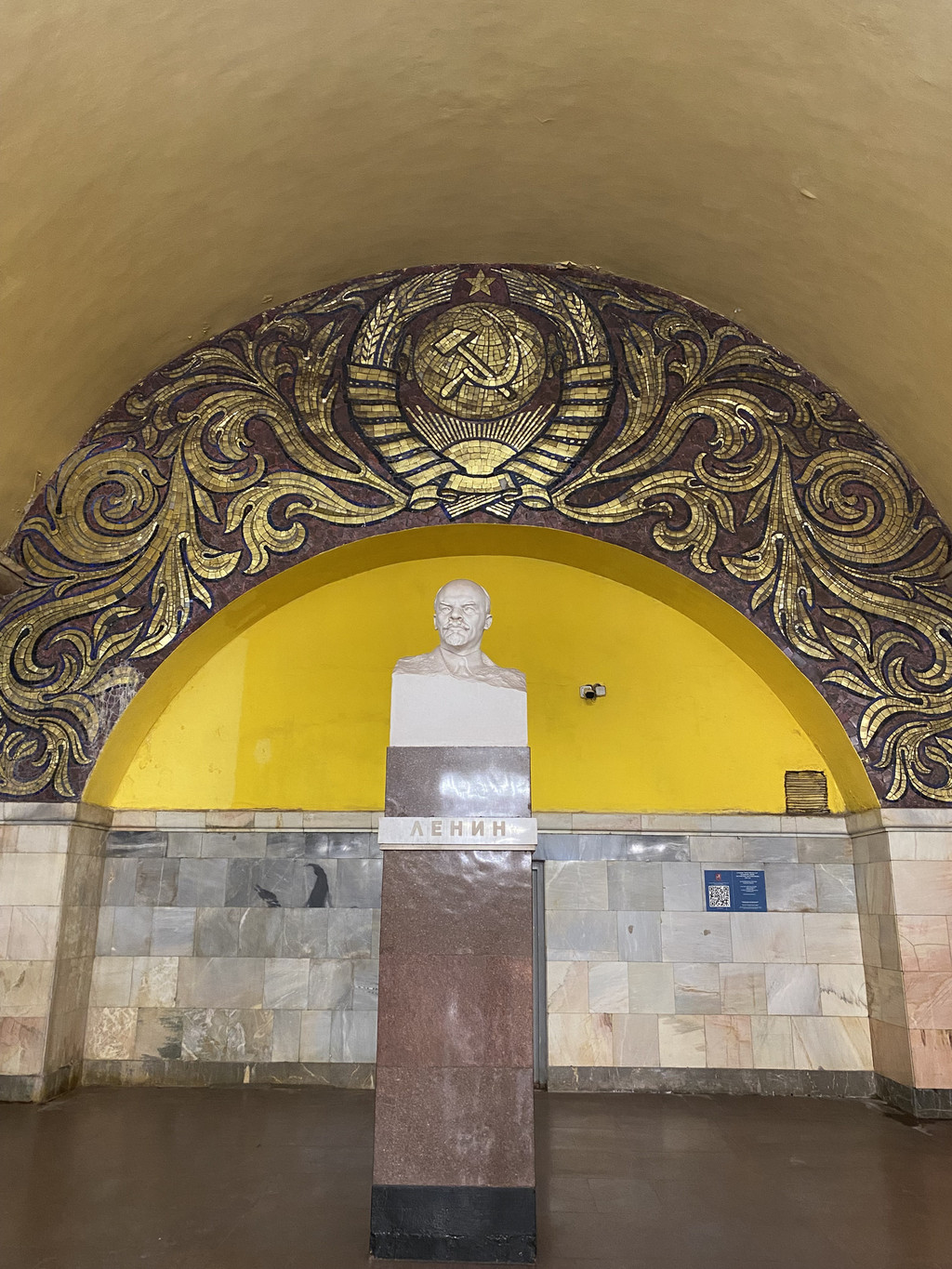 莫斯科地铁被公认为世界上最漂亮的地铁,可谓艺术圣殿,地铁站里有雕塑、壁画、时装、灯影、艺术装置等各种艺术表现,风格各异,美轮美奂。莫斯科地铁于1935年开通,运营路线长度为全球第五大,除了通行功能,还考虑了战时的防护要求,可供400余万居民掩蔽之用。地铁票分单次、一天、三天、三十天等多种票型,单次票乘坐65卢布,不论进出站点,一天票乘坐315卢布,不计次数乘坐,票可以在自助机上购买,刷卡和现金都可以。今天既然是地铁主题游,我们就买了一天票,从一号线的索科尔尼基站进站,沿着5号线的站点游览。共青团站是莫斯科地铁中最富丽堂皇的站,月台上的拱门、吊灯,顶上繁复的石膏装饰线条和壁画,浓浓的巴洛克风格,站厅里还立有一尊列宁的雕像。白俄罗斯站的顶上铺满白色的石膏浮雕图案,中间嵌着一些表现人民生活的彩石马赛克壁画,地板图案是白俄罗斯传统装修风格。基辅站的墙上排列着许多壁画,以乌克兰的独特风情为背景,表现了顿河的哥萨克、乌克兰姑娘的舞蹈,以及克里米亚和黑海的迷人景致。胜利公园站一度是世界上最深的地铁,深达97米,搭乘一条长达126米的自动扶梯,犹如进入时光隧道,需要3分钟左右到达月台,胜利公园站的大理石立体装饰是特色,大理石的装饰表现了人民文体、休闲等日常活动,雕刻栩栩如生。十月站的名字是为了纪念附近的十月广场,装饰风格致力于表现在卫国战争中战胜法西斯侵略者的胜利主题,在车站的尽头,有一个后殿,在帝国风格的仪式围栏后,顶面是代表天空的蓝色。保罗列兹站,是一座大理石打造的梦幻城堡,墙面、地面、栏杆、扶手都是厚重的大理石,对称的巴洛克柱、墙上镂空的几何造型装饰、顶部壁龛中苏联时期主题的铜制浮雕画,都给人一种历史的厚重感。马雅可夫斯基站是为了纪念苏联诗人马雅可夫斯基而命名,它的的建筑风格被归入当时的“斯大林式新古典主义”,以简约大气的墙柱式结构取代传统的塔柱式结构,并以金属和石材混搭的方式,将当时流行的装饰艺术风格推到极致。月台两侧的每座大理石拱门都镶着不锈钢。月台地面中心铺设一长条红色大理石,犹若红毯。地铁站最吸引人的地方是天花板,在若干灯饰围成的各个圆形凹顶里,中间镶嵌着苏联名画家杰伊涅卡的马赛克壁画,一个圆凹顶内一幅,共有31幅,该设计方案于1938年在纽约国际展上获得大奖,使“马雅可夫斯基”站成为世界级的地铁站。