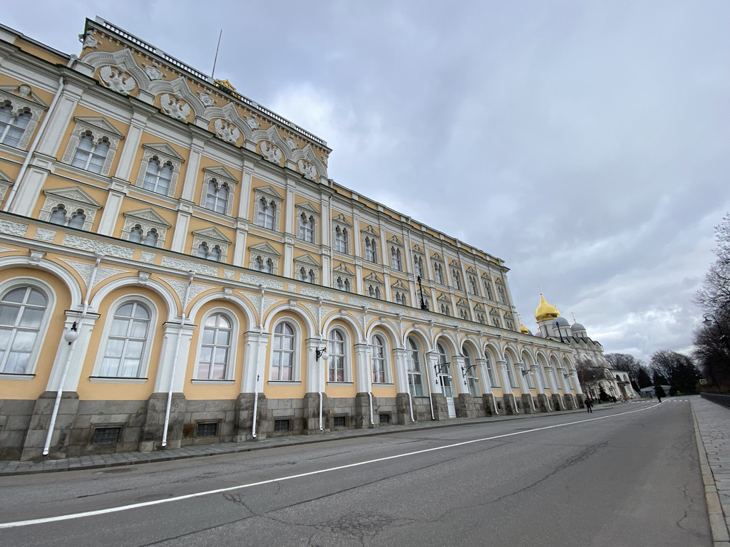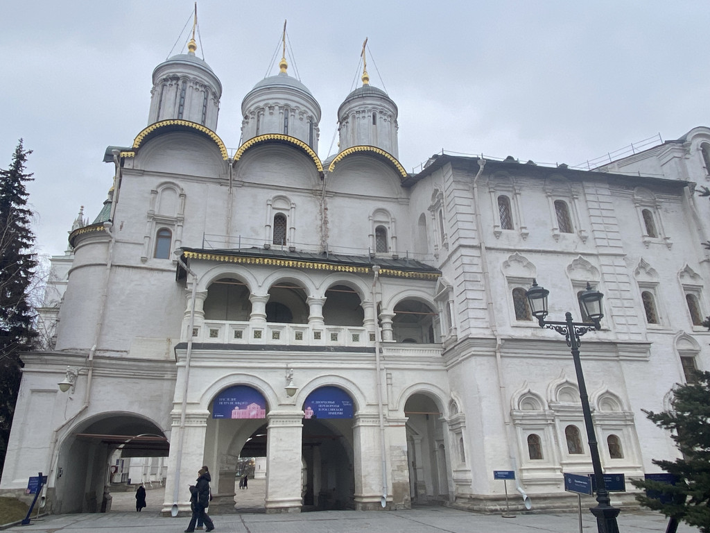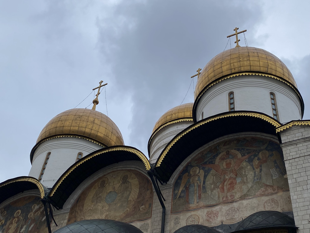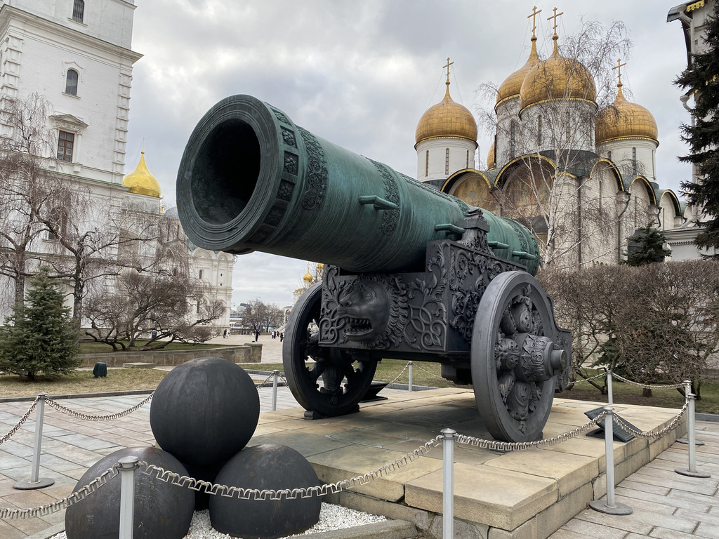 2/3红场旁边的克里姆林宫是一组建筑群,“克里姆林”在俄语中意为“内城”,这一建筑群位于博罗维茨基山岗上,东北与红场相连。曾是沙皇的居所之一,现在是俄罗斯总统府的所在地,俄罗斯联邦的象征,集行政、军事、宗教、文化于一体的堡垒综合体。从亚历山大花园可进入售票处,买宫殿群和军械馆的联票,安检后经过一骑街的城楼进入景区。可以看见在宫殿群的入口处矗立着一尊沙皇大炮,被誉为“ЦАРЬ-ПУШКА”,它重达40吨,是吉尼斯世界纪录上最大的榴弹炮。青铜炮筒上精心装饰的浮雕,包括图案、铭文以及沙皇费奥多尔一世的骑马像,都彰显了其非凡的历史地位。炮前整齐地堆放着四个空心球形生铁炮弹,每个都重达2吨,它不仅是对俄罗斯辉煌历史的一种见证,更是对国家强大军事实力的一种象征。