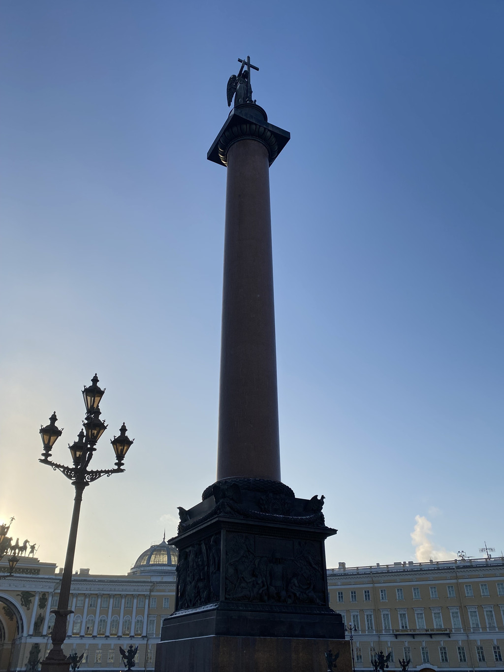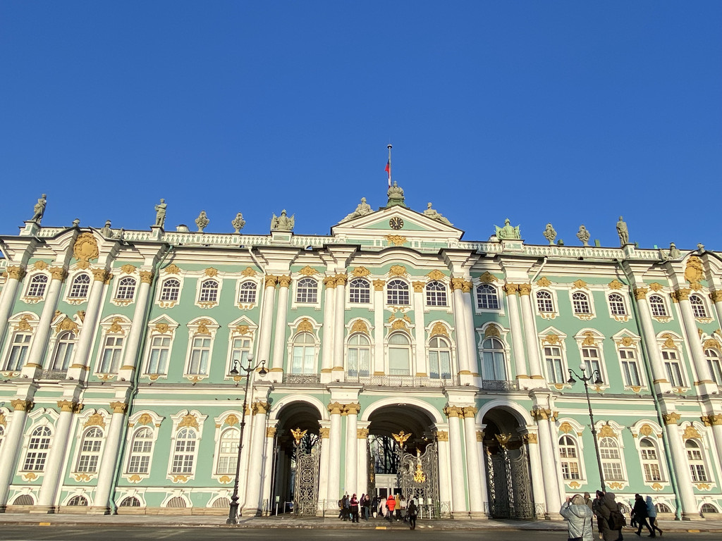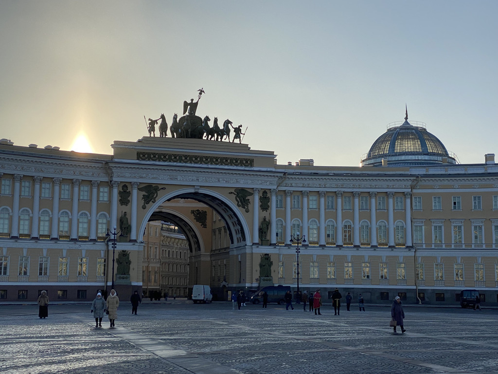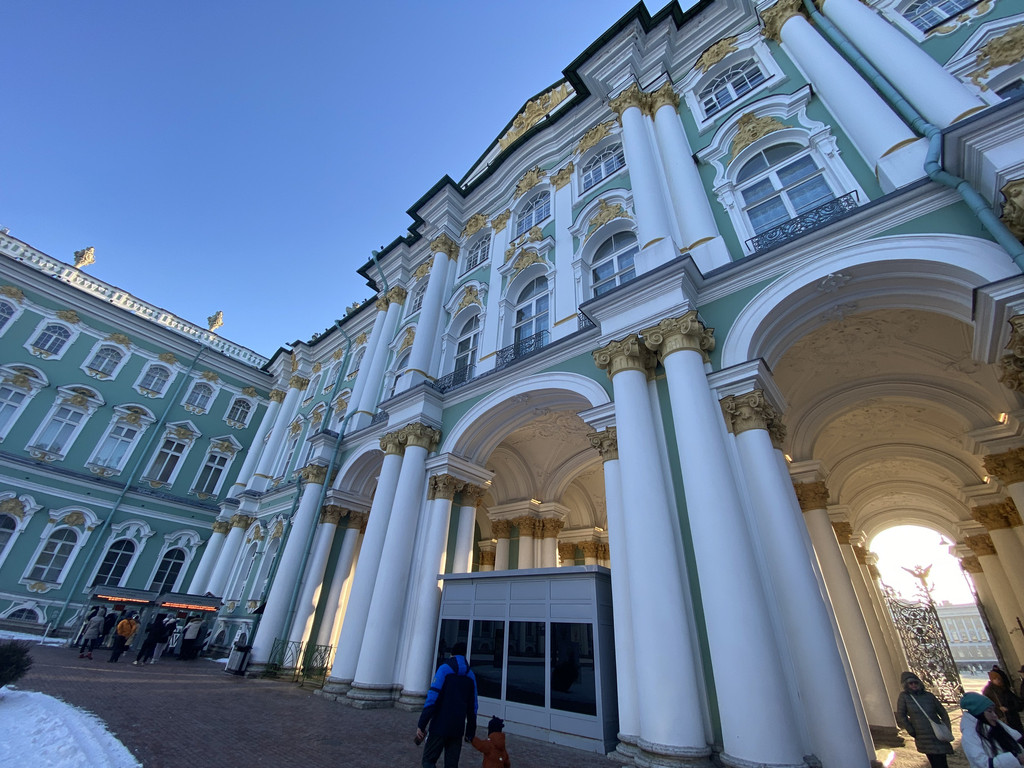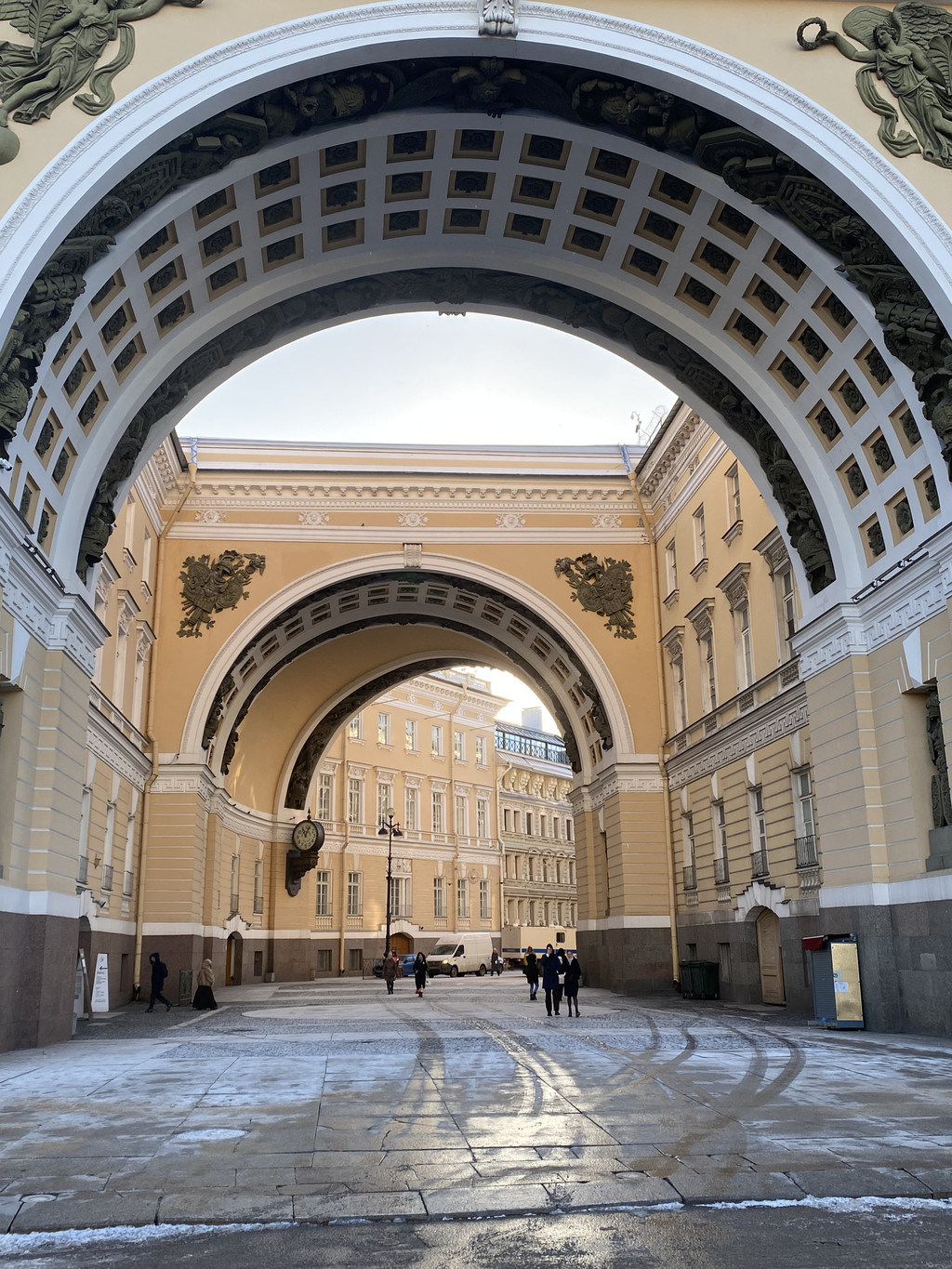 2/4圣彼得堡的纬度更北,天气明显比莫斯科冷,一早出门,地上积着厚厚的白雪,门口的小河也结着冰,即使大晴天,天上也淅淅沥沥飘着雪籽。圣彼得堡位于俄罗斯西北部,波罗的海沿岸,涅瓦河口,是俄罗斯第二大城市,世界上人口超过百万的城市中位置最北的一个,又被称为俄罗斯的“北方首都”。由于地处欧洲大陆深处,所以建筑、文化、生活等与欧洲更类似,感觉就是一个和罗马、米兰、巴黎一样的西欧城市,在去往冬宫的路上,咖啡馆、面包房、酒吧比比皆是。今天主要游览的项目就是冬宫。门口的冬宫广场非常开阔,所有建筑物是在不同时代、不同建筑师用不同风格建造的。广场南面的建筑是1829年建造的旧参谋总部大楼,呈现出优美的半圆形,在其拱门之上,一尊胜利女神正驾驭着战车。广场的中央,是沙皇尼古拉为了纪念其兄战胜拿破仑,树立了一根亚历山大纪念柱,高47.5米,直径4米,重600 吨,用整块花岗石制成,不用任何支撑,只靠自身重量屹立在基石上,它的顶尖上是手持十字架的天使,天使双脚踩着一条蛇,这是战胜敌人的象征。