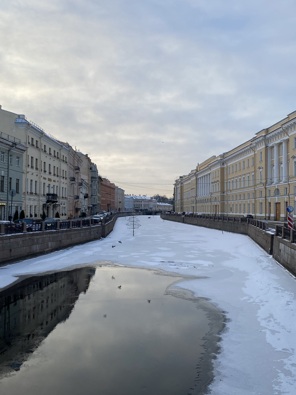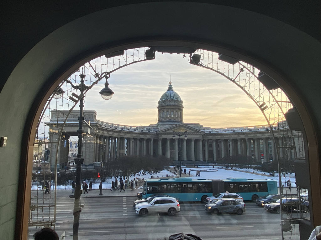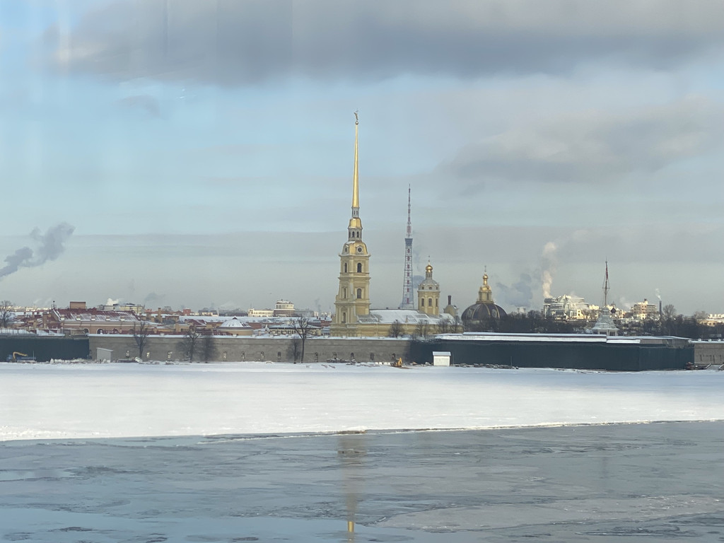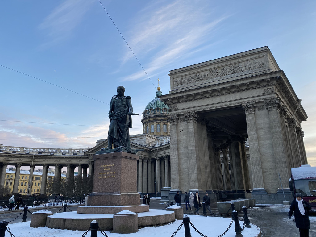 2/4圣彼得堡的纬度更北,天气明显比莫斯科冷,一早出门,地上积着厚厚的白雪,门口的小河也结着冰,即使大晴天,天上也淅淅沥沥飘着雪籽。圣彼得堡位于俄罗斯西北部,波罗的海沿岸,涅瓦河口,是俄罗斯第二大城市,世界上人口超过百万的城市中位置最北的一个,又被称为俄罗斯的“北方首都”。由于地处欧洲大陆深处,所以建筑、文化、生活等与欧洲更类似,感觉就是一个和罗马、米兰、巴黎一样的西欧城市,在去往冬宫的路上,咖啡馆、面包房、酒吧比比皆是。今天主要游览的项目就是冬宫。门口的冬宫广场非常开阔,所有建筑物是在不同时代、不同建筑师用不同风格建造的。广场南面的建筑是1829年建造的旧参谋总部大楼,呈现出优美的半圆形,在其拱门之上,一尊胜利女神正驾驭着战车。广场的中央,是沙皇尼古拉为了纪念其兄战胜拿破仑,树立了一根亚历山大纪念柱,高47.5米,直径4米,重600 吨,用整块花岗石制成,不用任何支撑,只靠自身重量屹立在基石上,它的顶尖上是手持十字架的天使,天使双脚踩着一条蛇,这是战胜敌人的象征。