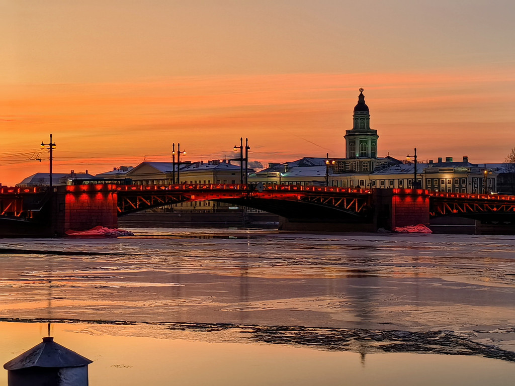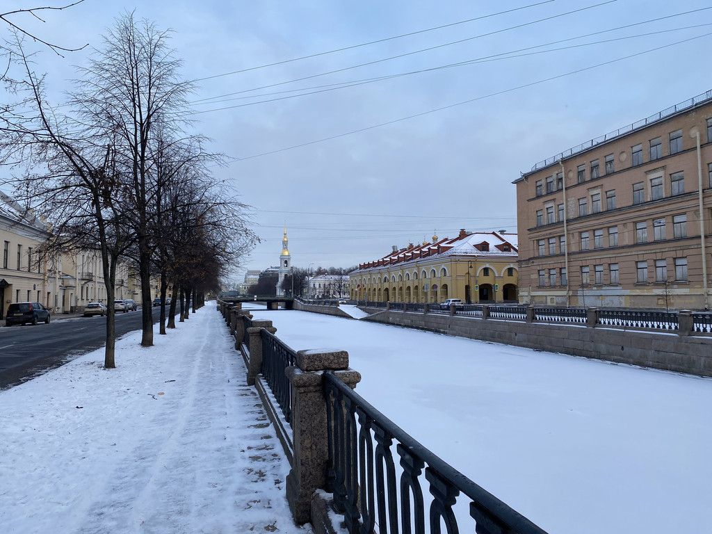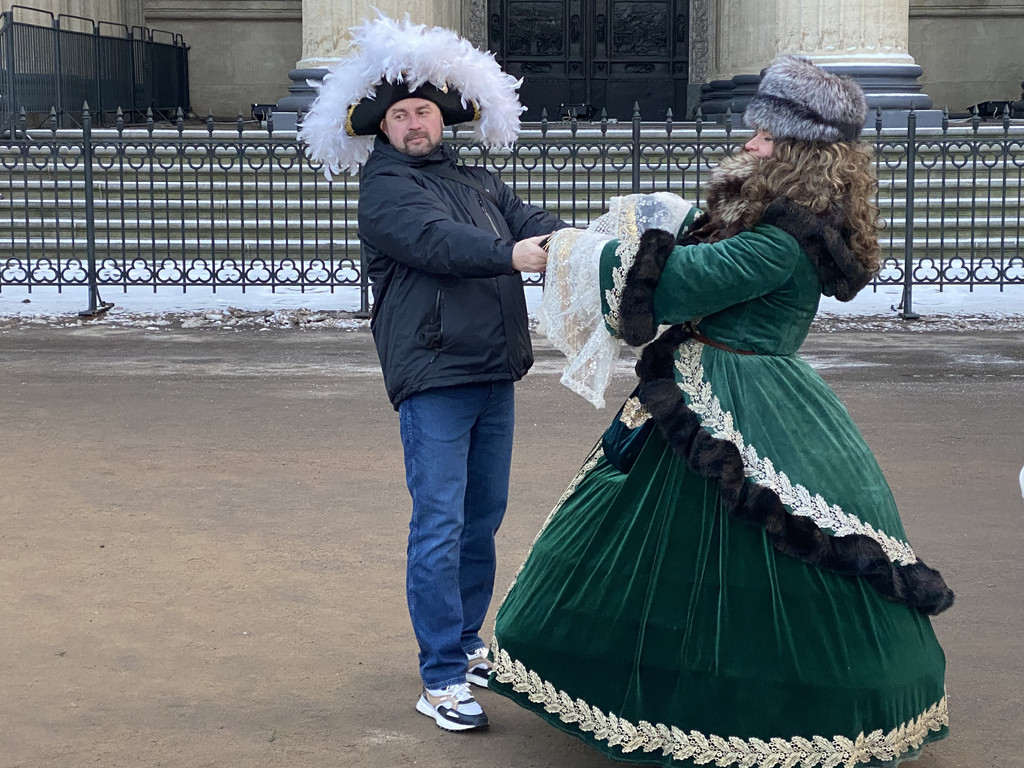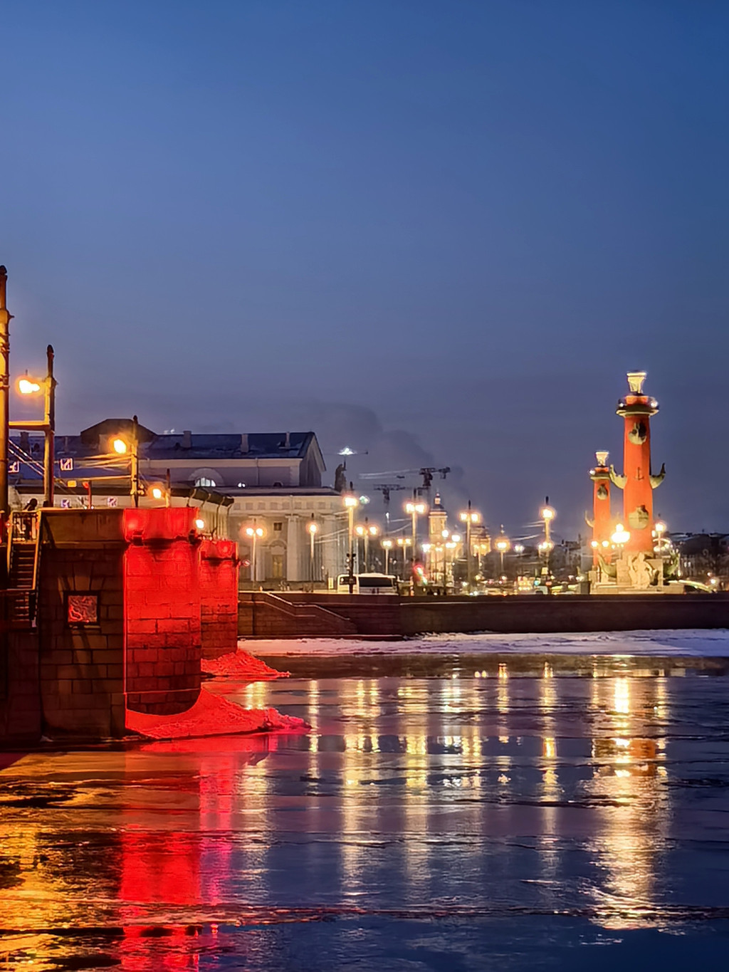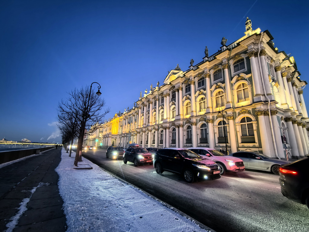 2/4圣彼得堡的纬度更北,天气明显比莫斯科冷,一早出门,地上积着厚厚的白雪,门口的小河也结着冰,即使大晴天,天上也淅淅沥沥飘着雪籽。圣彼得堡位于俄罗斯西北部,波罗的海沿岸,涅瓦河口,是俄罗斯第二大城市,世界上人口超过百万的城市中位置最北的一个,又被称为俄罗斯的“北方首都”。由于地处欧洲大陆深处,所以建筑、文化、生活等与欧洲更类似,感觉就是一个和罗马、米兰、巴黎一样的西欧城市,在去往冬宫的路上,咖啡馆、面包房、酒吧比比皆是。今天主要游览的项目就是冬宫。门口的冬宫广场非常开阔,所有建筑物是在不同时代、不同建筑师用不同风格建造的。广场南面的建筑是1829年建造的旧参谋总部大楼,呈现出优美的半圆形,在其拱门之上,一尊胜利女神正驾驭着战车。广场的中央,是沙皇尼古拉为了纪念其兄战胜拿破仑,树立了一根亚历山大纪念柱,高47.5米,直径4米,重600 吨,用整块花岗石制成,不用任何支撑,只靠自身重量屹立在基石上,它的顶尖上是手持十字架的天使,天使双脚踩着一条蛇,这是战胜敌人的象征。