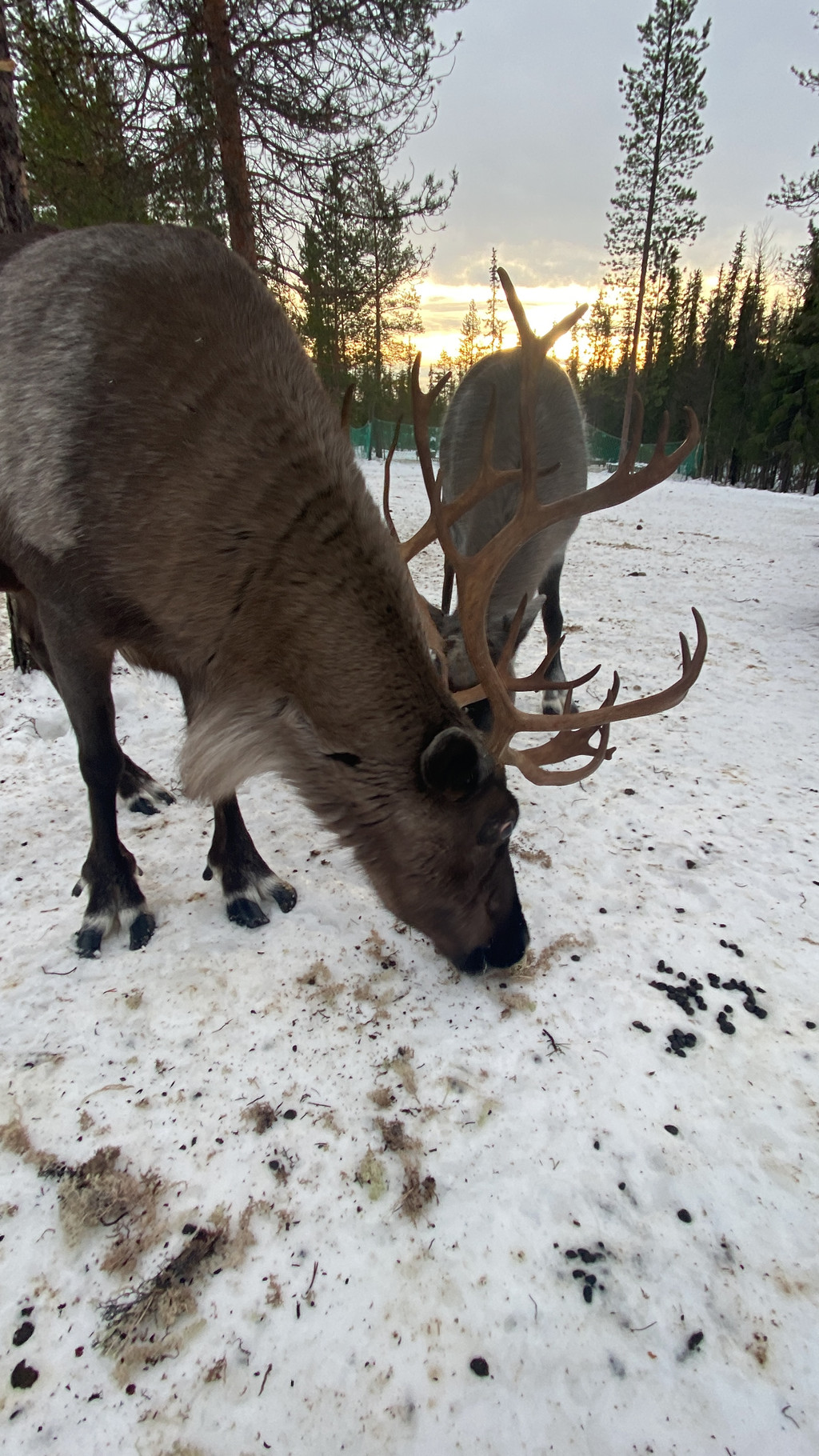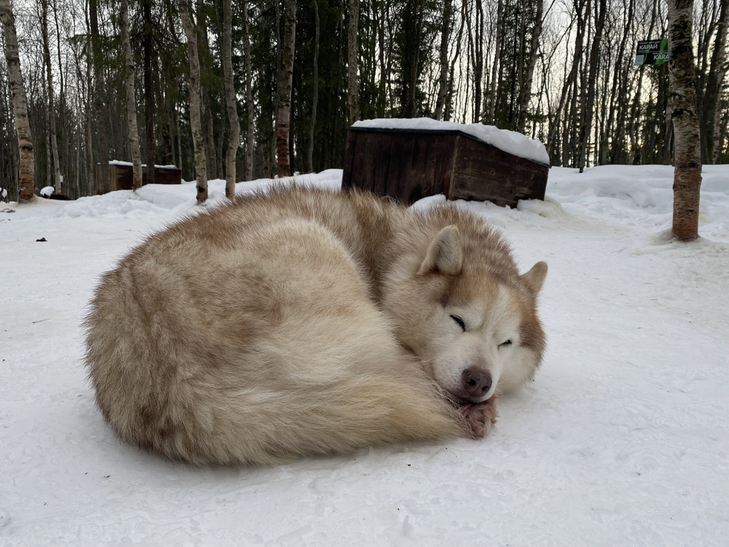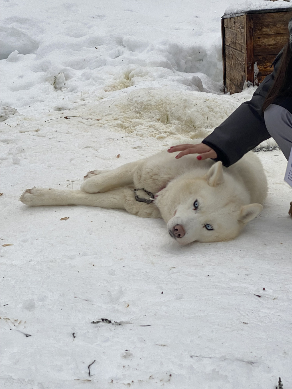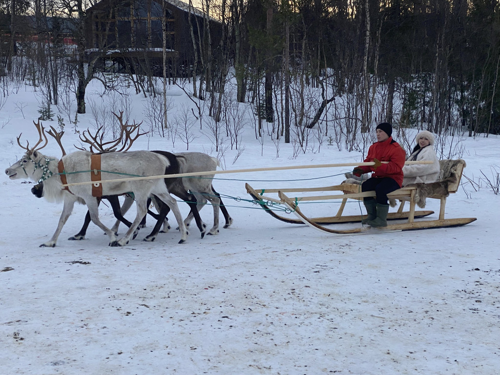 因为订了12点钟的入园,我们直接驱车赶去北极光公园。在摩尔曼斯克可以体验狗拉雪橇、驯鹿拉雪橇,以及雪地摩托等项目的有萨米村、冻土公园、老小哈士奇公园,以及北极光公园等几个点。相对而言,北极光公园距离市区不远,价格适中,所以我们选择了北极光。说是公园,其实就是一个营地,去售票点报了小某书上联系的预订人信息,先体验的是驯鹿拉雪橇,雪橇由四头驯鹿拉着,最多可以两位游客横坐在雪橇上,前面有一工作人员拿一根棒子不断捅驯鹿的屁股,让它们绕着既定的线路跑起来,就这样跑了两圈算是完成。第二个项目是参观哈士奇、阿拉斯加犬等雪橇犬的休憩地,哈士奇又称西伯利亚雪橇犬,是世界最古老的犬种,属于中型犬。哈士奇属于服从度不太高的犬,憨态可掬,眼睛显得很小,而且有时莫明其妙地做出一些不让人理解的笨事、坏事,所以也被称作“二哈”,但其实哈士奇非常聪明,在冰天雪地里,哈士奇作为拉雪橇的头犬,要在快速前行中能迅速预判前方路况并随机应变,以保护主人安全。而且哈士奇性情温顺友善,极少有攻击性行为。在这片林地里,有大约十多条雪橇犬趴在狗屋前,以哈士奇为主,毛色从黑、黑白相间、纯白都有,眼睛一般为棕色和蓝色。你可以尽情撸它们,或者给它们拍照,它们似乎不为所动,静静地趴着或者蜷缩着打着盹,这也体现了它们温顺的性格。离开雪橇犬的休憩地后,就是驯鹿喂食项目了。一位年长的工作人员拿了一个装满苔藓地衣的桶,让我们各自取一些,驯鹿一看到,就纷涌上来,伸出舌头来舔舐我们手上的“美食”,但对落在地上的食物又不愿低头再吃。驯鹿又成为“角鹿”,角的分枝繁复是其外观上的重要特征,长角分枝繁复,毛色有黑、白、灰相间,毛并不长,毛皮较硬。驯鹿生活在北极地带,善于在复杂地形中穿行,驮运能力好,被誉为“林海之舟”。驯鹿似乎很保护它们的角,不轻易让人触碰,有两头鹿角有缺损,甚至还没有角。它们进食量也很惊人,满满一桶的饲料很快一抢而空。最后一个体验项目是雪地摩托,在穿了厚外套、裤子、防风面罩和头盔裹得严严实实后,教练教我们驾驶方式,雪地摩托和普通摩托差不多,只不过把轮子换成了雪橇,最多可以两人驾乘,左手刹车,右手油门,教练要求油门慢慢加,尽可能不要使用急刹,利用雪地的摩擦力慢慢减速。简单教好后,教练带队出发,八辆车形成的车队一字前行,车距在15米左右,保持好速度和队形。速度加上去后,风开始大起来,刚开始地形起起伏伏,颠得厉害,在穿过一片树林后,豁然开朗,出现一望无际的雪地,我们依次停车在这里休息拍照。下午两点多左右,夕阳照在白茫茫的雪地上,泛着金光,眼界所及,没有其他任何造物、没有丝毫声音,似乎到了世界的尽头。我们在雪地里躺平、侧卧、打雪仗,也忘记了时间和空间。拗着各种造型拍照后就返程了,全部行程大概45分钟,感觉还是挺刺激的,最关键是看到了夕阳下美得不可方物的雪世界。尽兴后打车回城,在路上看到了漫天的火烧云,尘世浸染,无边无际。