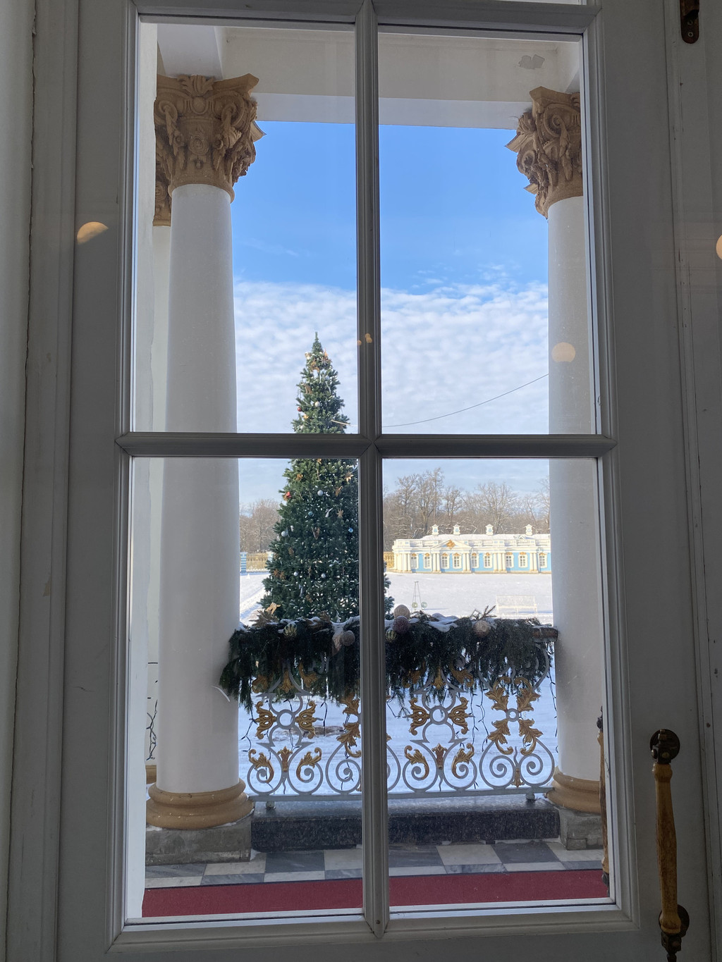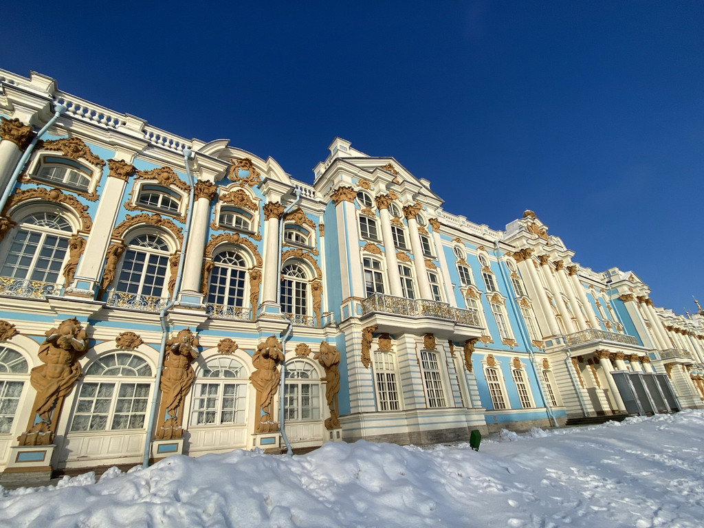 2/5游客来圣彼得堡一般要去三个地方:冬宫、夏宫和叶宫。夏宫在东郊芬兰湾的森林里,距离市区很远,且夏宫以喷泉、草坪、花卉而闻名,更适合在夏天游玩,所以,这次没安排夏宫行程,而去了叶宫。叶宫即叶卡捷琳娜宫,沙皇彼得一世1717年在彼得堡以南约30公里,为他的妻子、皇后叶卡捷林娜而建的消夏别墅,不久这里便被称为皇村。此后经过多次改扩建,尤其是经设计了冬宫的意大利建筑师拉斯特雷利改造后,最后完工的宫殿长达306米,超过了俄罗斯巴洛克时期的所有建筑。叶卡捷林娜二世统治期间,皇村成为日益强大的俄罗斯灿烂文化的缩影。叶宫的门票是在官网上购买的,票价1100卢布/人。从圣彼得堡市驱车过去约45分钟左右。作为皇村,外面的花园很大很开阔,只是在冬季,都被厚厚的雪盖住了。叶宫的建筑呈天蓝色,造型丰富的雕塑和凹凸有致的结构使数百米长的建筑丝毫不显得单调呆板。