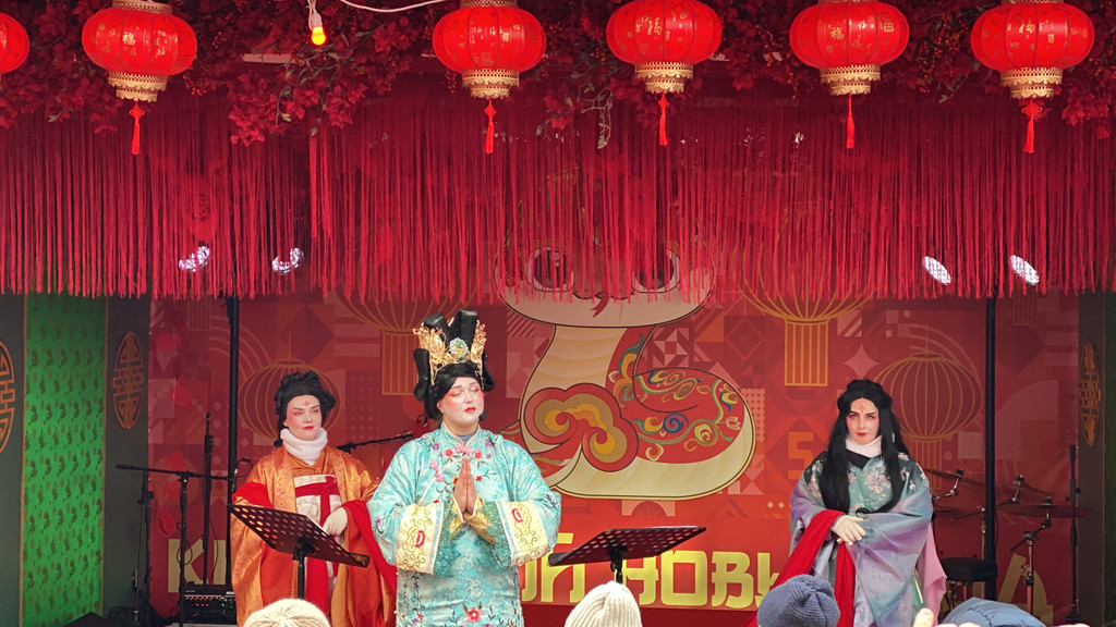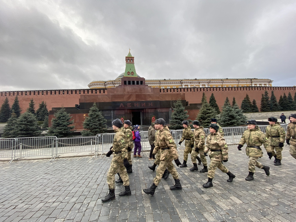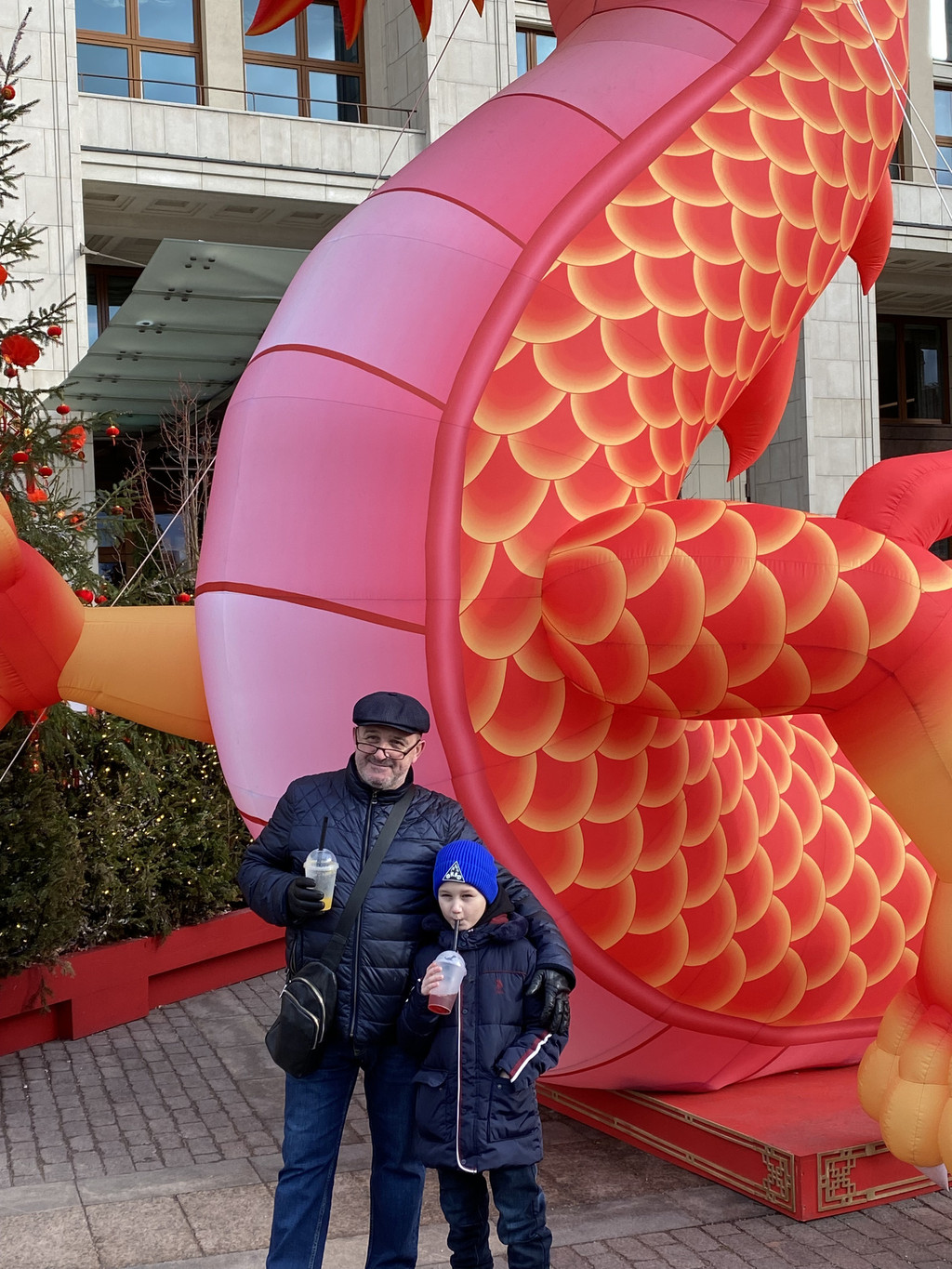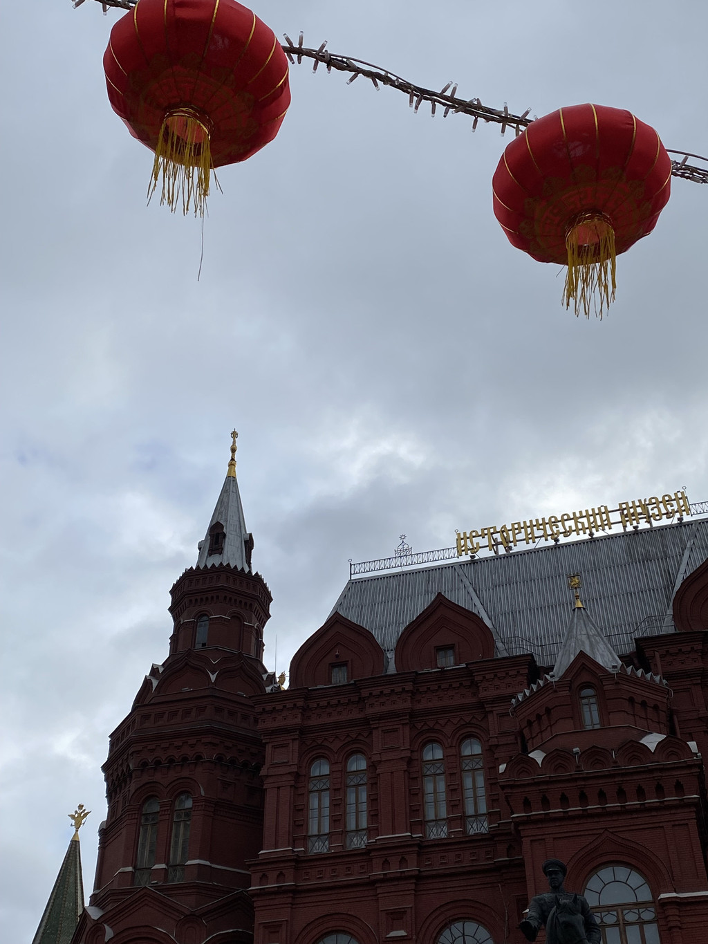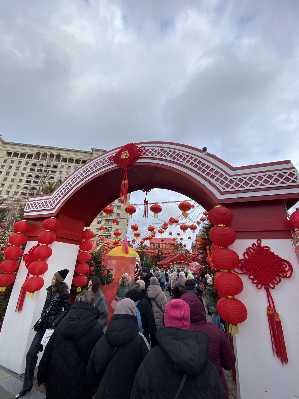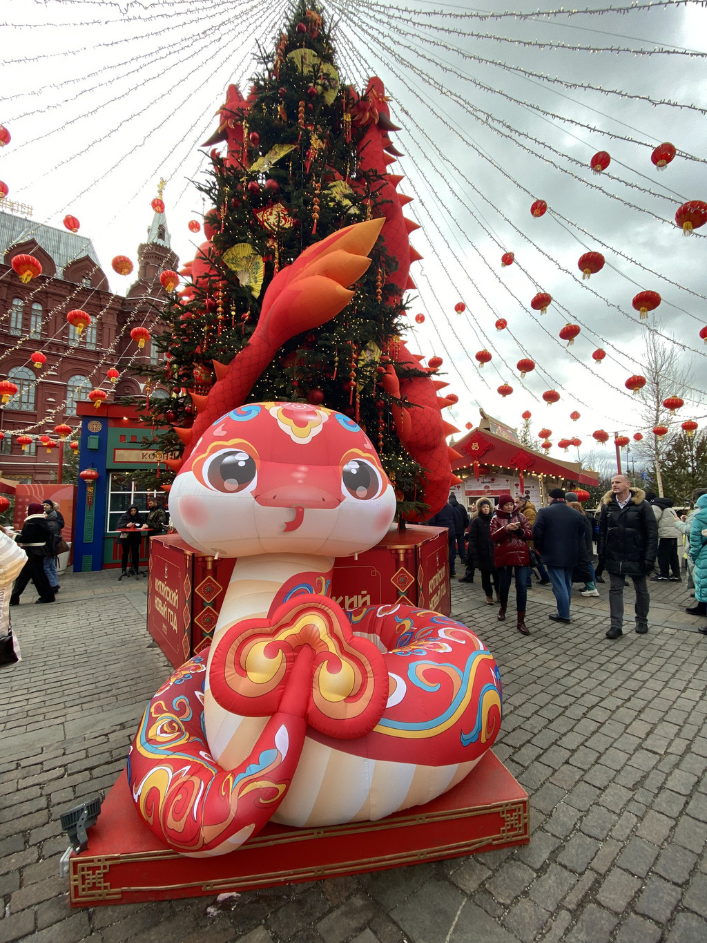 沿着红墙继续往北走,即国家历史博物馆的北向,西侧是庄严肃穆的无名烈士墓,燃烧着常年不熄的火焰,东侧是一个搭建的市集,正逢中国农历新年,市集的主题许多与中国文化相关,有龙、蛇、熊猫等的卡通充气形象,市集内商贩云集,游客络绎不绝,热闹非凡,戏台上俄罗斯人扮演中国古装演戏,还有现场拉面、包饺子、烤羊肉的,类似中国的庙会,这与一侧庄重的烈士墓形成强烈的反差。
