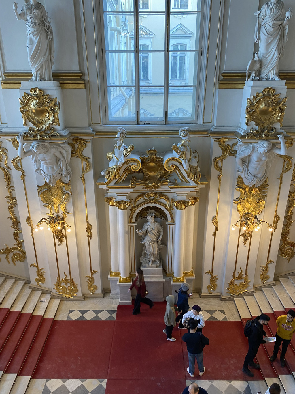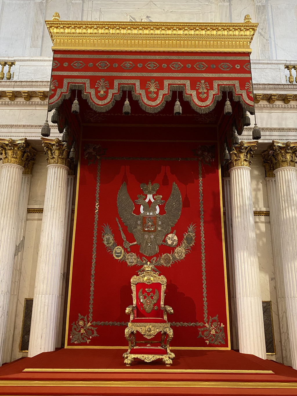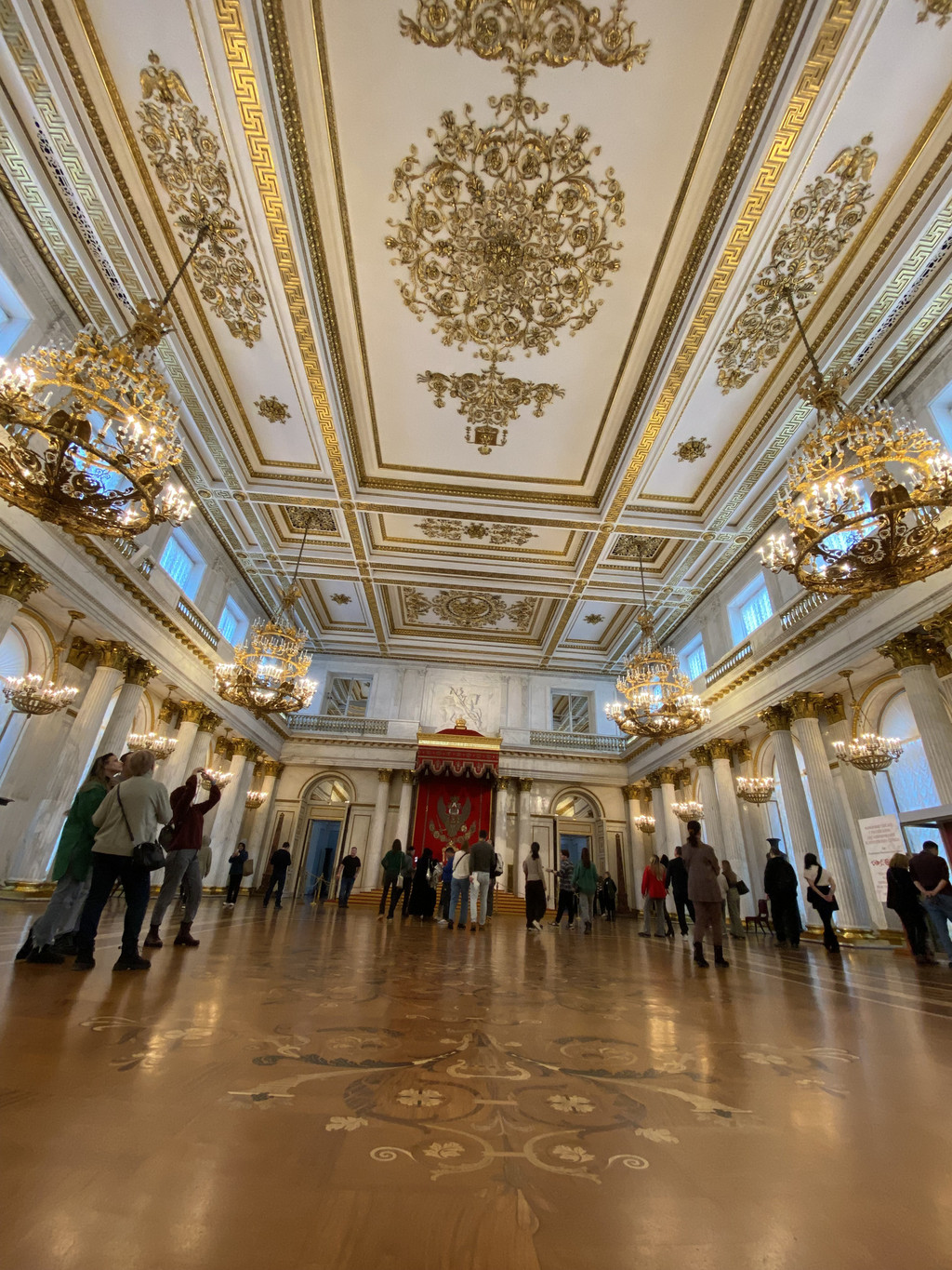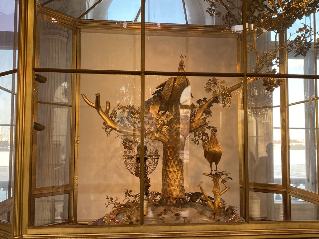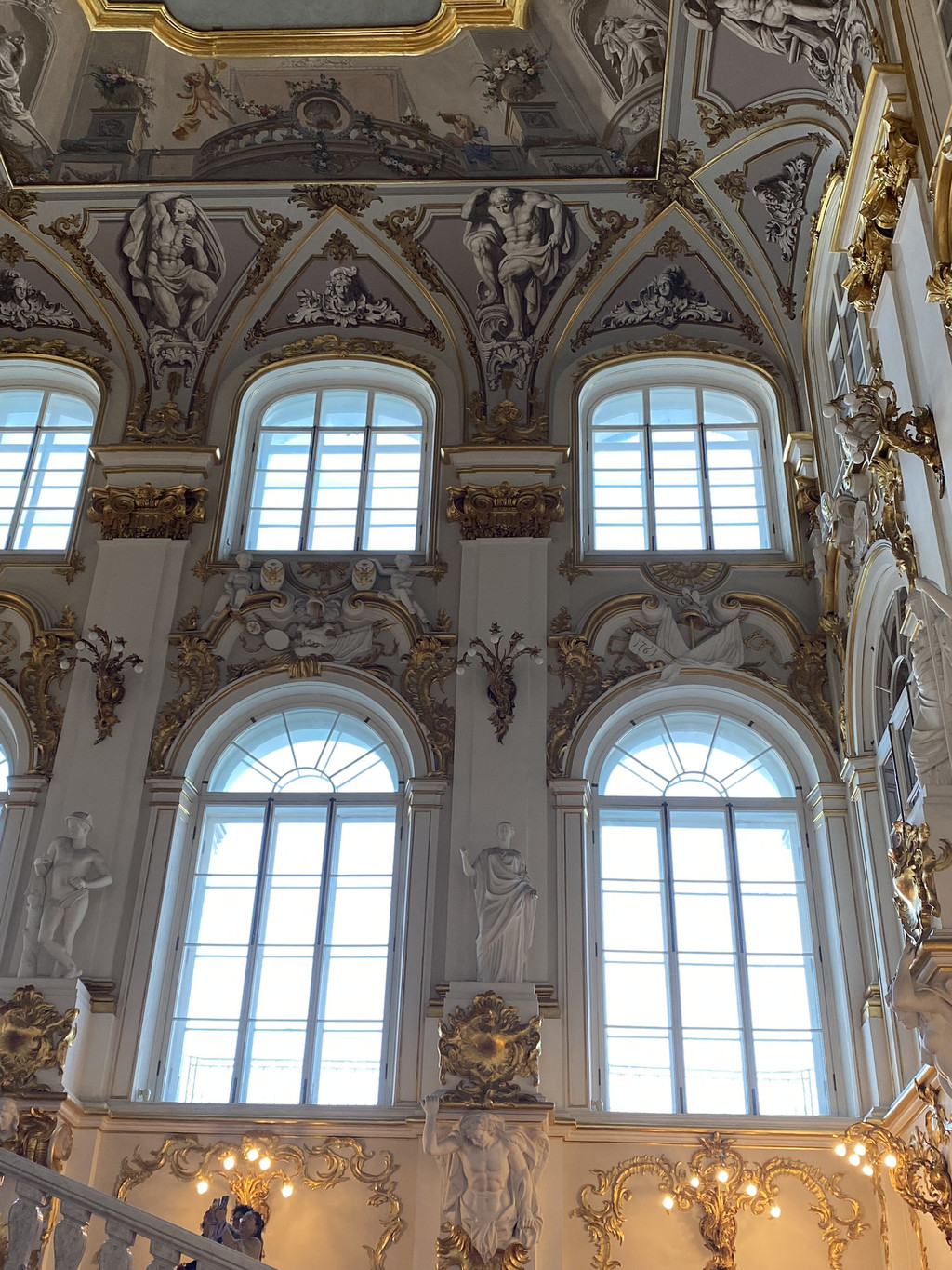 冬宫是昔日的沙皇皇宫,现为国立艾尔米塔什博物馆,是世界四大博物馆之一,也是门票最便宜的,相当于人民币40元。博物馆由五座巨大的建筑组成,有超过400个展厅,藏品数量惊人:370万余件艺术品,1.5万幅绘画,1.2万座雕塑,60余万幅线条画,还有100余万枚硬币。进入博物馆,先是存外套,租讲解器500卢布一人,扫票入场后先看到的是铺设红毯的约旦大厅,这是一网红拍照打卡地。里面还有两个厅内饰豪华,一是圣乔治大厅,这是冬宫的心脏所在,建于叶卡捷琳娜二世时期,用来举行最高等级的皇家仪式、招待会和御前会议等,正中央摆放着黄金宝座。二是彼得厅,则体现了帝俄风格的豪华装饰和沙皇时代的辉煌。这次冬宫参观,见到了几件镇馆之宝,其一是“孔雀钟”,上面有猫头鹰、孔雀、公鸡和松鼠四种动物,是18世纪英国钟表名匠詹姆斯考克斯所制造并献给叶卡捷琳娜二世。如果拧上发条,钟上的金树叶簌簌抖动,猫头鹰眨眼,孔雀开屏,公鸡啼叫,松鼠跳动。其二是达芬奇的两幅圣母像:《柏诺瓦的圣母》展现母爱的神圣,《圣母与圣婴》温柔而庄重。其三是米开朗基罗的雕塑——《蜷缩成一团的小男孩》,展现了男孩的痛苦与挣扎。其他的名画和雕塑不计其数,油画多在二楼,一般一个展厅以一位画家命名,如伦勃朗的254展厅,著名的展品有《达娜厄》、《浪子回头》《红衣老人》、《花神》;鲁本斯的247展厅,著名的展品有《维纳斯与阿顿尼斯》、《酒神巴克斯》;提香的221展厅,著名的展品有《忏悔的抹大拉》等。227展厅的拉斐尔长廊与梵蒂冈同款,有“天花板上的圣经”之称。雕塑展览则在一楼为主,出名的有朱庇特(宙斯)雕像,于18世纪在罗马郊外古罗马皇帝多米提安的居所遗址发现,是冬宫最大的古雕像之一,美惠三女神雕像(希腊神话中的光辉女神、激励女神和欢乐女神)是意大利新古典主义雕塑家卡诺瓦的代表作,以及维纳斯雕像(公元前一世纪在希腊米洛岛出土,是卢浮宫断臂维纳斯的“妹妹”)、伏尔泰的坐像等。一楼还有古埃及展,能看到木乃伊和法老石棺。三楼是远东馆,游客明显稀少,据说有中国敦煌的藏品,不过找了一圈也没发现。整个博物馆要全部兜完步行约20公里,如果在每件展品前逗留一分钟,全部看完需要五年。所以,对于时间有限的游客而言,即使走马观花也需要一整天。我们从上午10点多入馆参观,直到讲解器的电耗完后,才依依不舍地离馆,此时差不多已是晚上6点多。