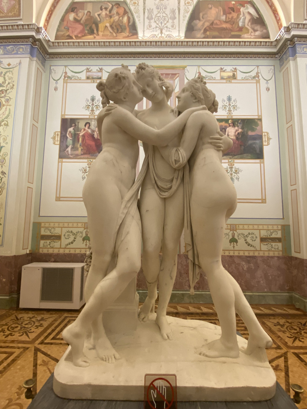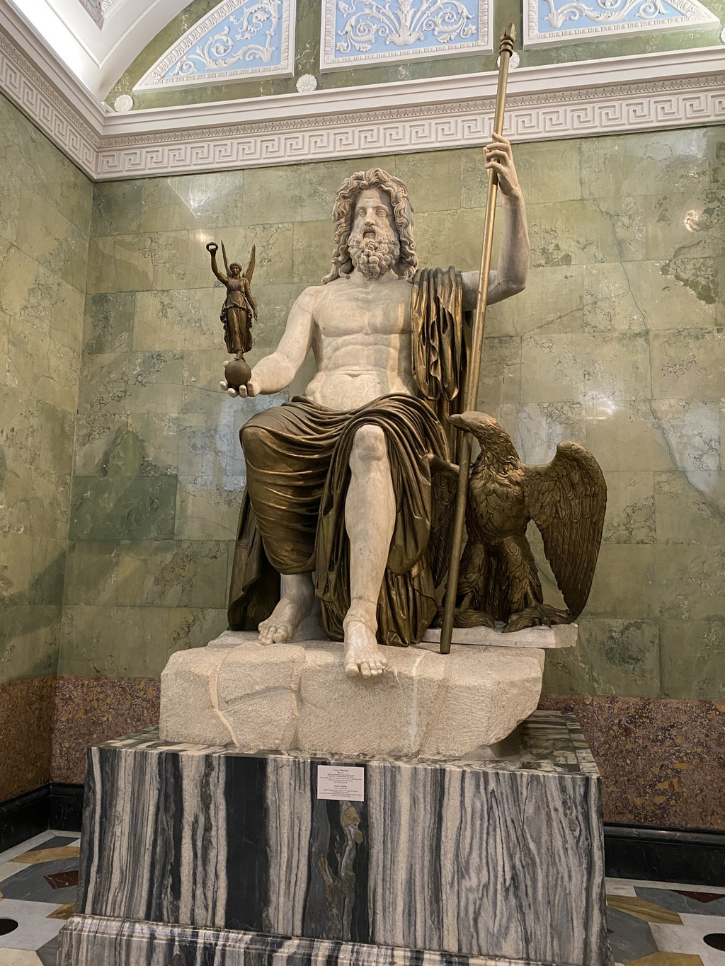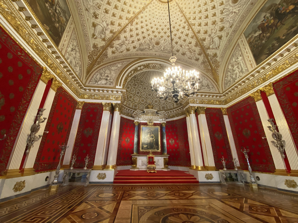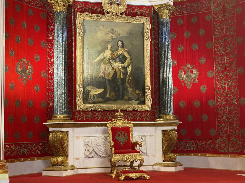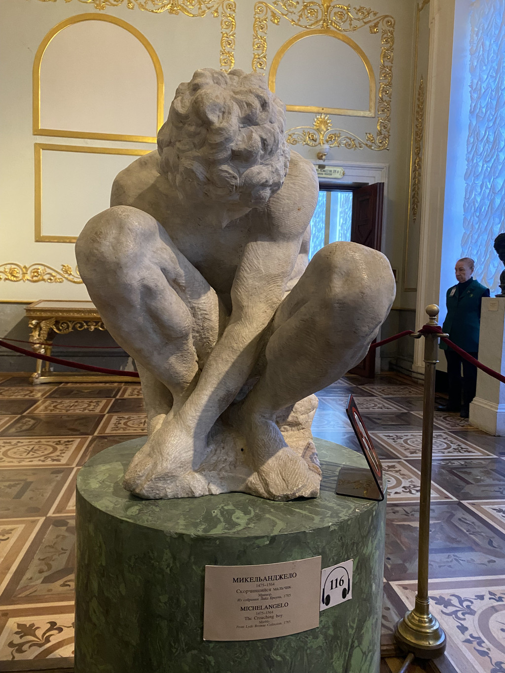 冬宫是昔日的沙皇皇宫,现为国立艾尔米塔什博物馆,是世界四大博物馆之一,也是门票最便宜的,相当于人民币40元。博物馆由五座巨大的建筑组成,有超过400个展厅,藏品数量惊人:370万余件艺术品,1.5万幅绘画,1.2万座雕塑,60余万幅线条画,还有100余万枚硬币。进入博物馆,先是存外套,租讲解器500卢布一人,扫票入场后先看到的是铺设红毯的约旦大厅,这是一网红拍照打卡地。里面还有两个厅内饰豪华,一是圣乔治大厅,这是冬宫的心脏所在,建于叶卡捷琳娜二世时期,用来举行最高等级的皇家仪式、招待会和御前会议等,正中央摆放着黄金宝座。二是彼得厅,则体现了帝俄风格的豪华装饰和沙皇时代的辉煌。这次冬宫参观,见到了几件镇馆之宝,其一是“孔雀钟”,上面有猫头鹰、孔雀、公鸡和松鼠四种动物,是18世纪英国钟表名匠詹姆斯考克斯所制造并献给叶卡捷琳娜二世。如果拧上发条,钟上的金树叶簌簌抖动,猫头鹰眨眼,孔雀开屏,公鸡啼叫,松鼠跳动。其二是达芬奇的两幅圣母像:《柏诺瓦的圣母》展现母爱的神圣,《圣母与圣婴》温柔而庄重。其三是米开朗基罗的雕塑——《蜷缩成一团的小男孩》,展现了男孩的痛苦与挣扎。其他的名画和雕塑不计其数,油画多在二楼,一般一个展厅以一位画家命名,如伦勃朗的254展厅,著名的展品有《达娜厄》、《浪子回头》《红衣老人》、《花神》;鲁本斯的247展厅,著名的展品有《维纳斯与阿顿尼斯》、《酒神巴克斯》;提香的221展厅,著名的展品有《忏悔的抹大拉》等。227展厅的拉斐尔长廊与梵蒂冈同款,有“天花板上的圣经”之称。雕塑展览则在一楼为主,出名的有朱庇特(宙斯)雕像,于18世纪在罗马郊外古罗马皇帝多米提安的居所遗址发现,是冬宫最大的古雕像之一,美惠三女神雕像(希腊神话中的光辉女神、激励女神和欢乐女神)是意大利新古典主义雕塑家卡诺瓦的代表作,以及维纳斯雕像(公元前一世纪在希腊米洛岛出土,是卢浮宫断臂维纳斯的“妹妹”)、伏尔泰的坐像等。一楼还有古埃及展,能看到木乃伊和法老石棺。三楼是远东馆,游客明显稀少,据说有中国敦煌的藏品,不过找了一圈也没发现。整个博物馆要全部兜完步行约20公里,如果在每件展品前逗留一分钟,全部看完需要五年。所以,对于时间有限的游客而言,即使走马观花也需要一整天。我们从上午10点多入馆参观,直到讲解器的电耗完后,才依依不舍地离馆,此时差不多已是晚上6点多。