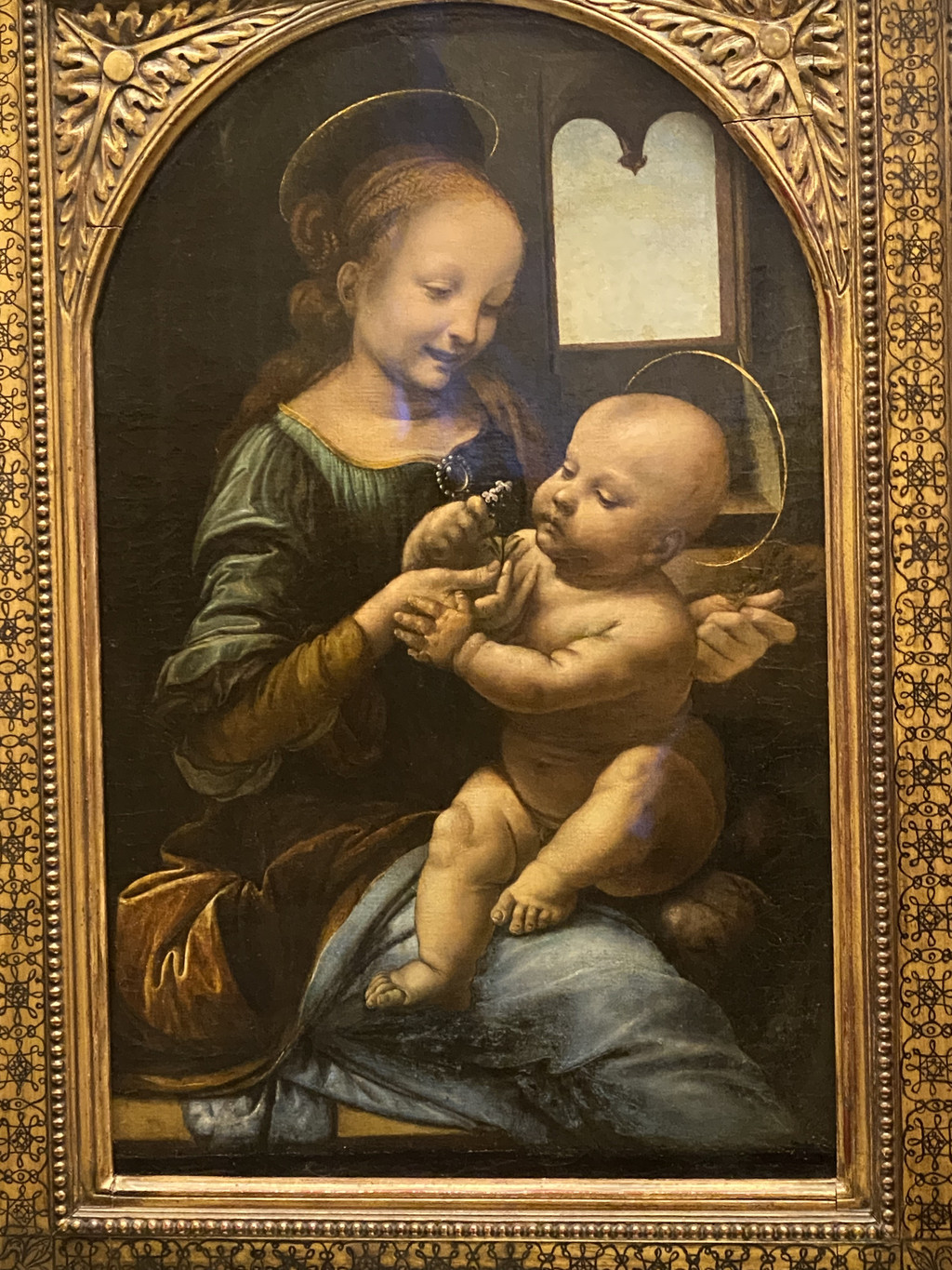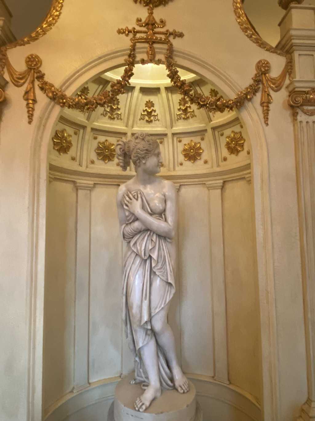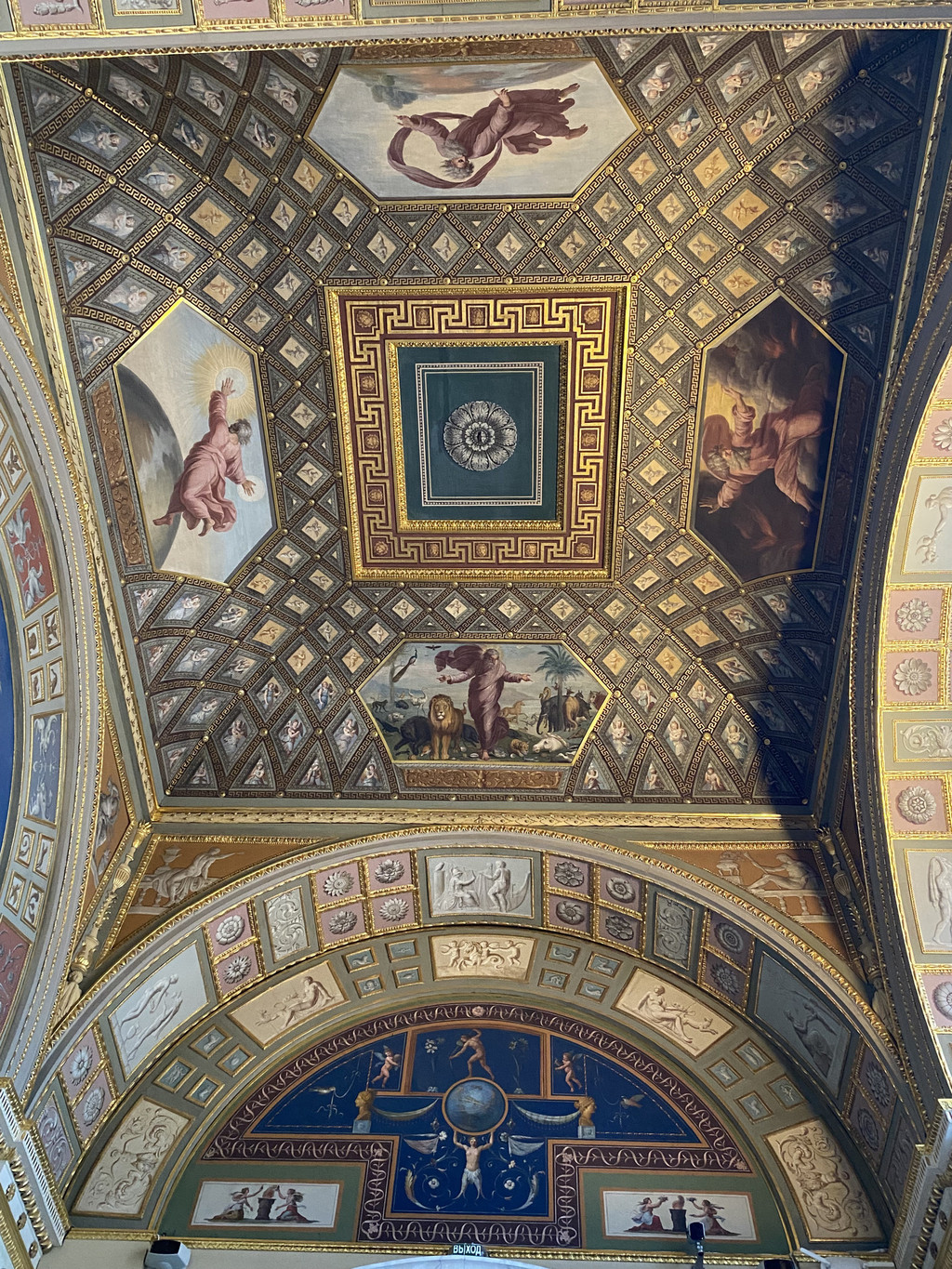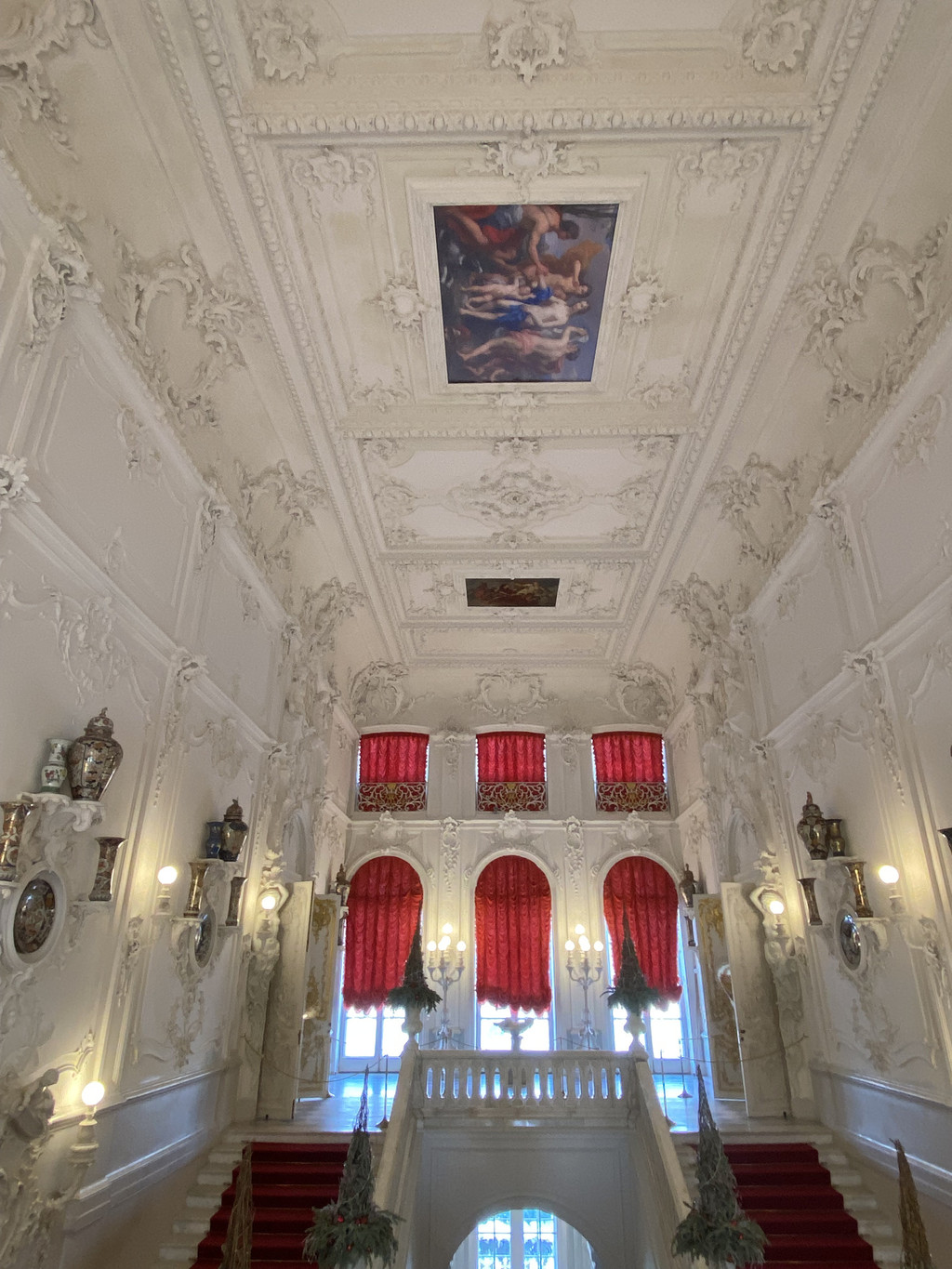 冬宫是昔日的沙皇皇宫,现为国立艾尔米塔什博物馆,是世界四大博物馆之一,也是门票最便宜的,相当于人民币40元。博物馆由五座巨大的建筑组成,有超过400个展厅,藏品数量惊人:370万余件艺术品,1.5万幅绘画,1.2万座雕塑,60余万幅线条画,还有100余万枚硬币。进入博物馆,先是存外套,租讲解器500卢布一人,扫票入场后先看到的是铺设红毯的约旦大厅,这是一网红拍照打卡地。里面还有两个厅内饰豪华,一是圣乔治大厅,这是冬宫的心脏所在,建于叶卡捷琳娜二世时期,用来举行最高等级的皇家仪式、招待会和御前会议等,正中央摆放着黄金宝座。二是彼得厅,则体现了帝俄风格的豪华装饰和沙皇时代的辉煌。这次冬宫参观,见到了几件镇馆之宝,其一是“孔雀钟”,上面有猫头鹰、孔雀、公鸡和松鼠四种动物,是18世纪英国钟表名匠詹姆斯考克斯所制造并献给叶卡捷琳娜二世。如果拧上发条,钟上的金树叶簌簌抖动,猫头鹰眨眼,孔雀开屏,公鸡啼叫,松鼠跳动。其二是达芬奇的两幅圣母像:《柏诺瓦的圣母》展现母爱的神圣,《圣母与圣婴》温柔而庄重。其三是米开朗基罗的雕塑——《蜷缩成一团的小男孩》,展现了男孩的痛苦与挣扎。其他的名画和雕塑不计其数,油画多在二楼,一般一个展厅以一位画家命名,如伦勃朗的254展厅,著名的展品有《达娜厄》、《浪子回头》《红衣老人》、《花神》;鲁本斯的247展厅,著名的展品有《维纳斯与阿顿尼斯》、《酒神巴克斯》;提香的221展厅,著名的展品有《忏悔的抹大拉》等。227展厅的拉斐尔长廊与梵蒂冈同款,有“天花板上的圣经”之称。雕塑展览则在一楼为主,出名的有朱庇特(宙斯)雕像,于18世纪在罗马郊外古罗马皇帝多米提安的居所遗址发现,是冬宫最大的古雕像之一,美惠三女神雕像(希腊神话中的光辉女神、激励女神和欢乐女神)是意大利新古典主义雕塑家卡诺瓦的代表作,以及维纳斯雕像(公元前一世纪在希腊米洛岛出土,是卢浮宫断臂维纳斯的“妹妹”)、伏尔泰的坐像等。一楼还有古埃及展,能看到木乃伊和法老石棺。三楼是远东馆,游客明显稀少,据说有中国敦煌的藏品,不过找了一圈也没发现。整个博物馆要全部兜完步行约20公里,如果在每件展品前逗留一分钟,全部看完需要五年。所以,对于时间有限的游客而言,即使走马观花也需要一整天。我们从上午10点多入馆参观,直到讲解器的电耗完后,才依依不舍地离馆,此时差不多已是晚上6点多。