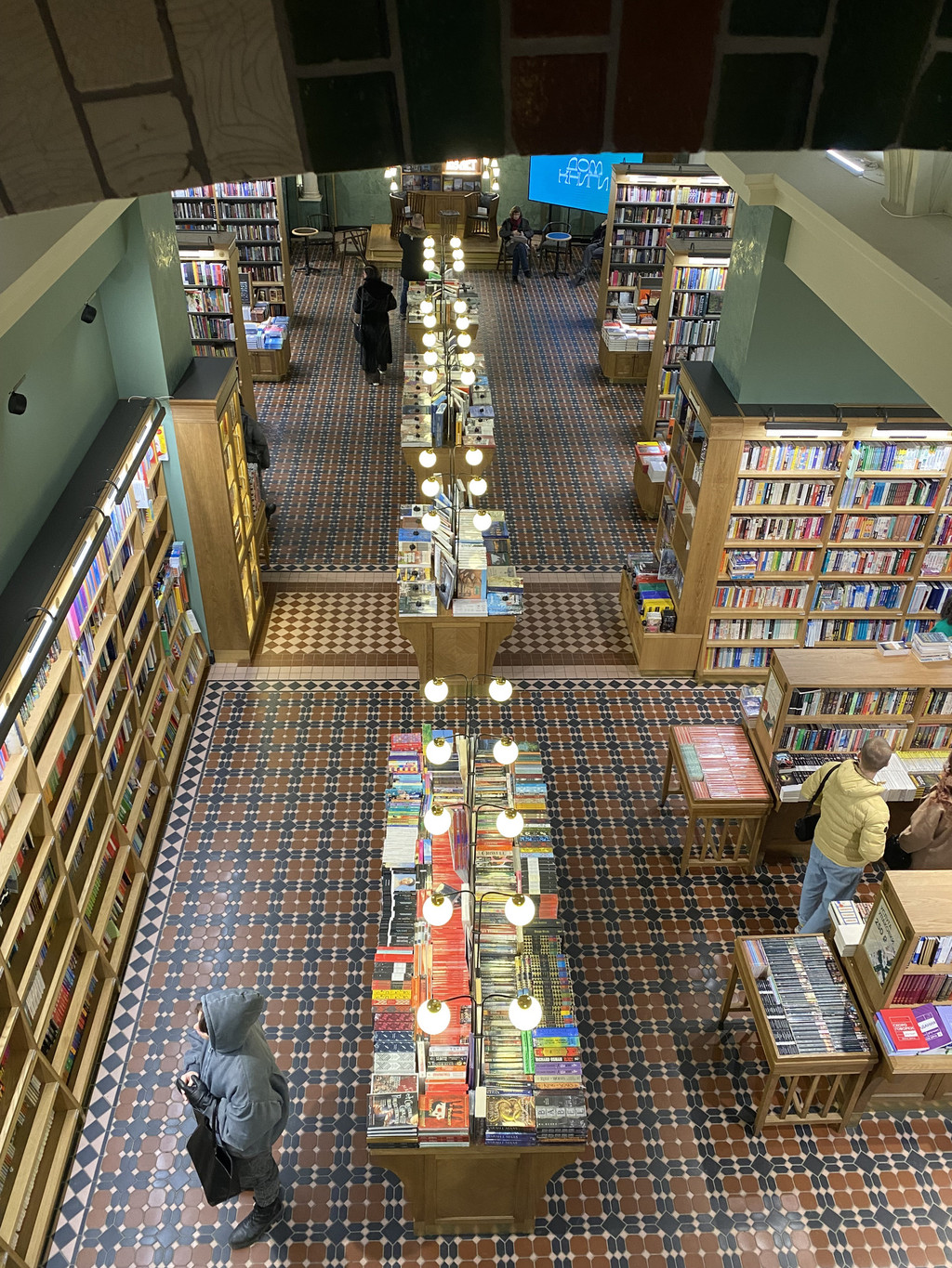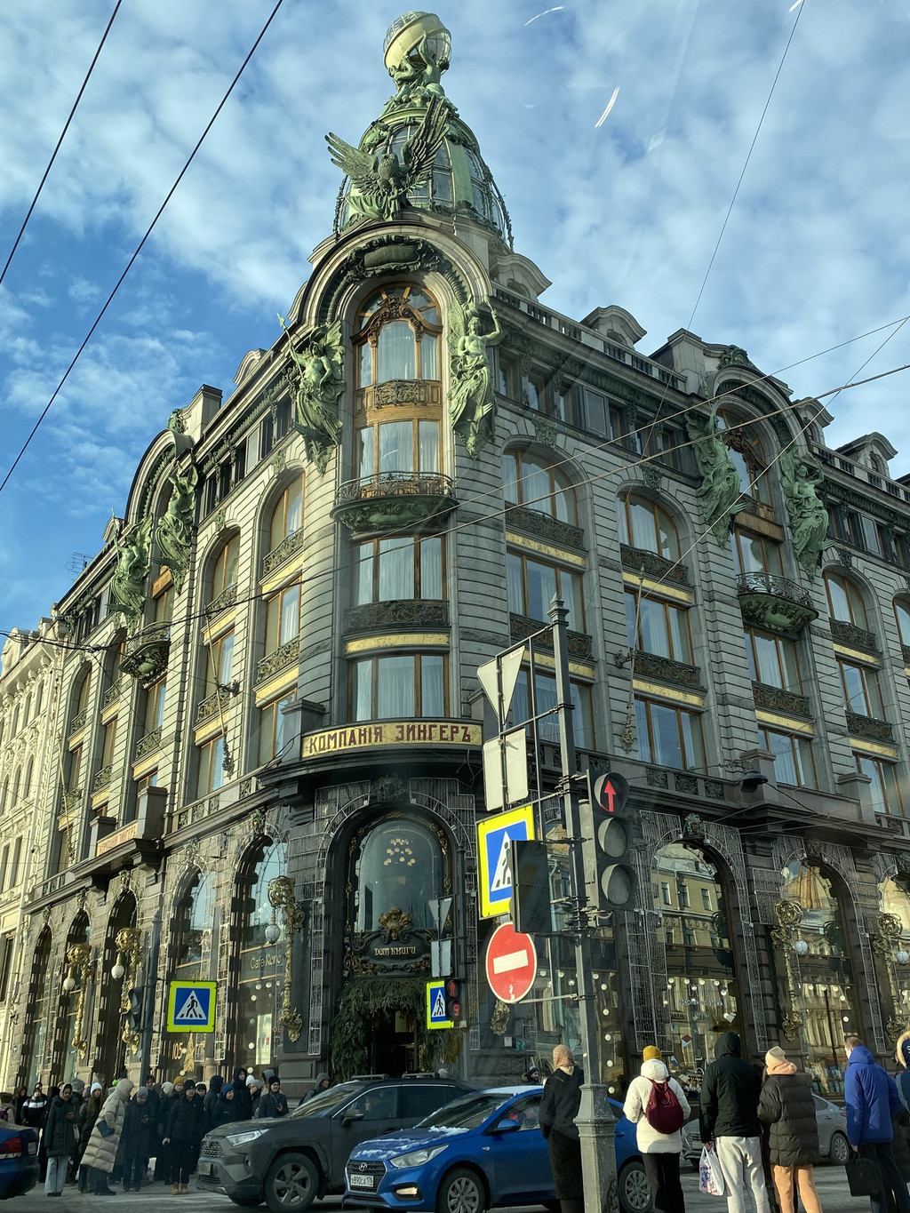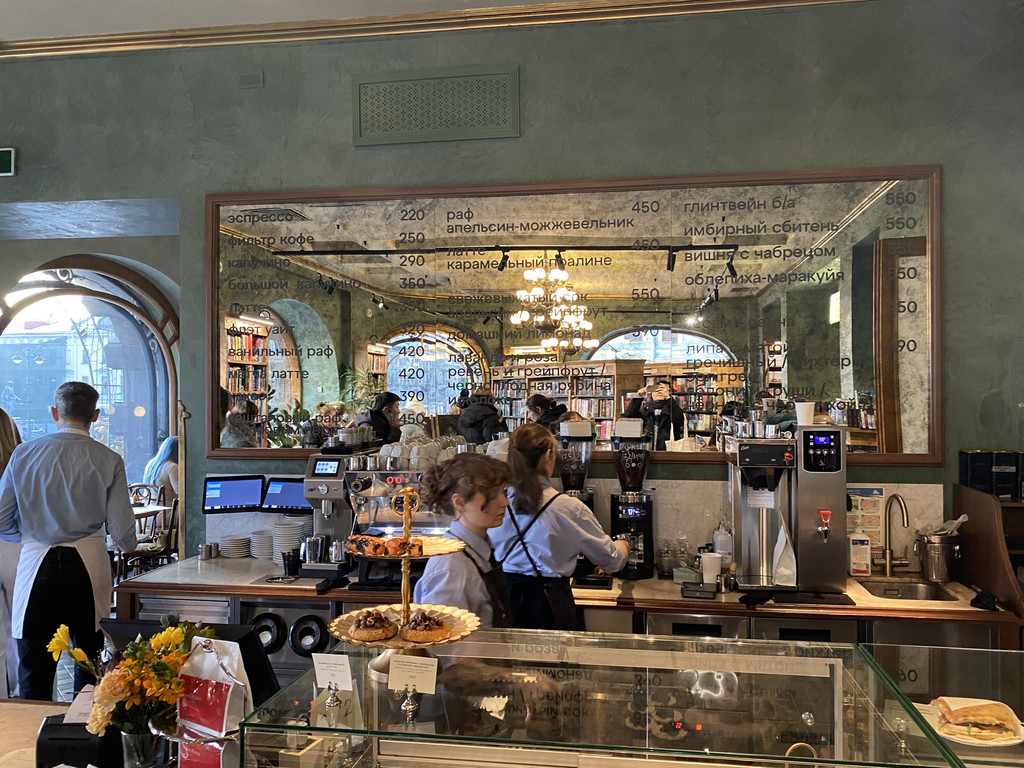 从叶宫返市后,我们直接去逛著名的百年书店,书店建于1902年到1904年期间,位于著名的涅瓦大街街角处, 一共六层,面积约7000平米。一楼除了书籍,主要出售各种文创产品,如杯子、冰箱贴、巧克力、书签、帆布袋、套娃等,价格也不贵,是伴手礼的理想选择,二楼有一咖啡屋,点杯咖啡,坐在拱形的大落地玻璃窗旁,可以一览喀山教堂全景,以及涅瓦河涅瓦街,尤其是面向喀山大教堂的玻璃窗畔,是网红打卡点。