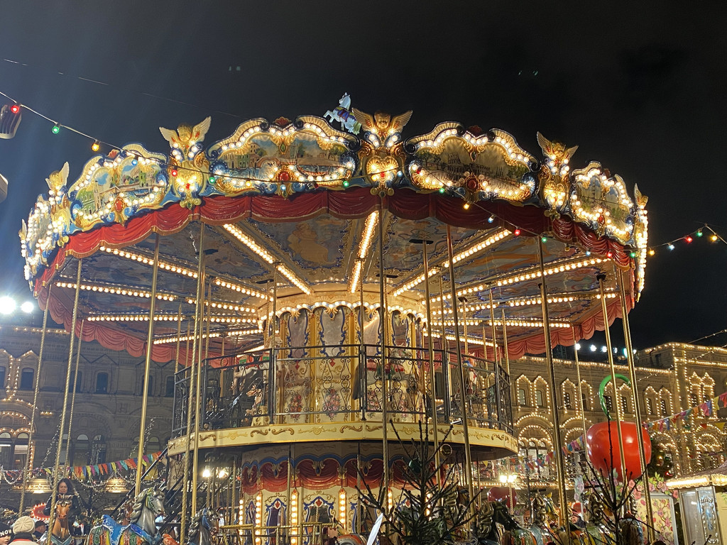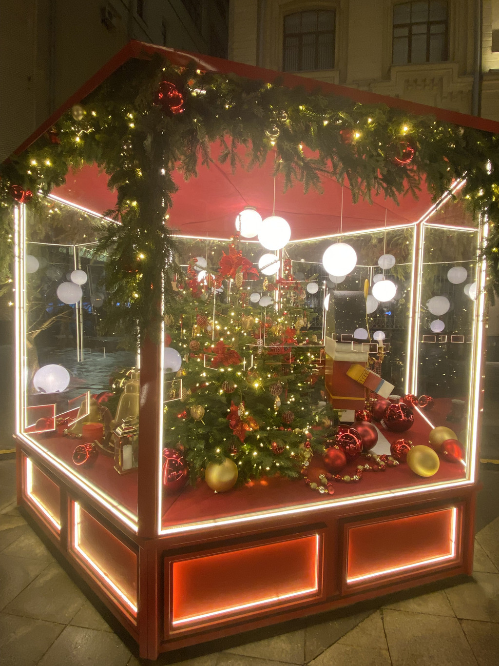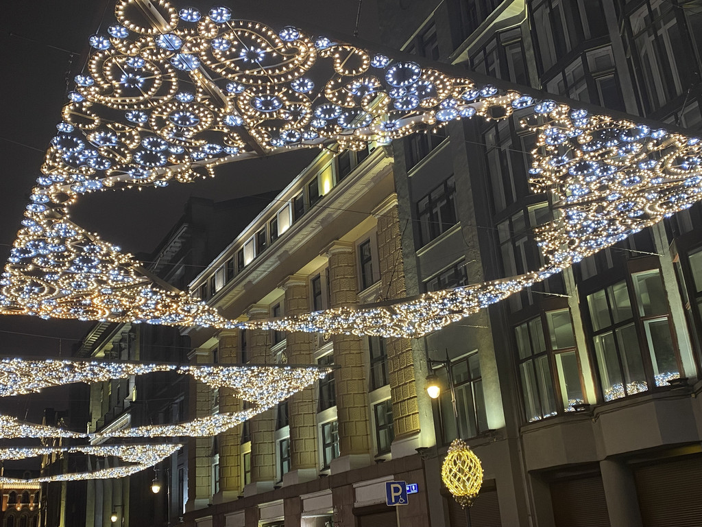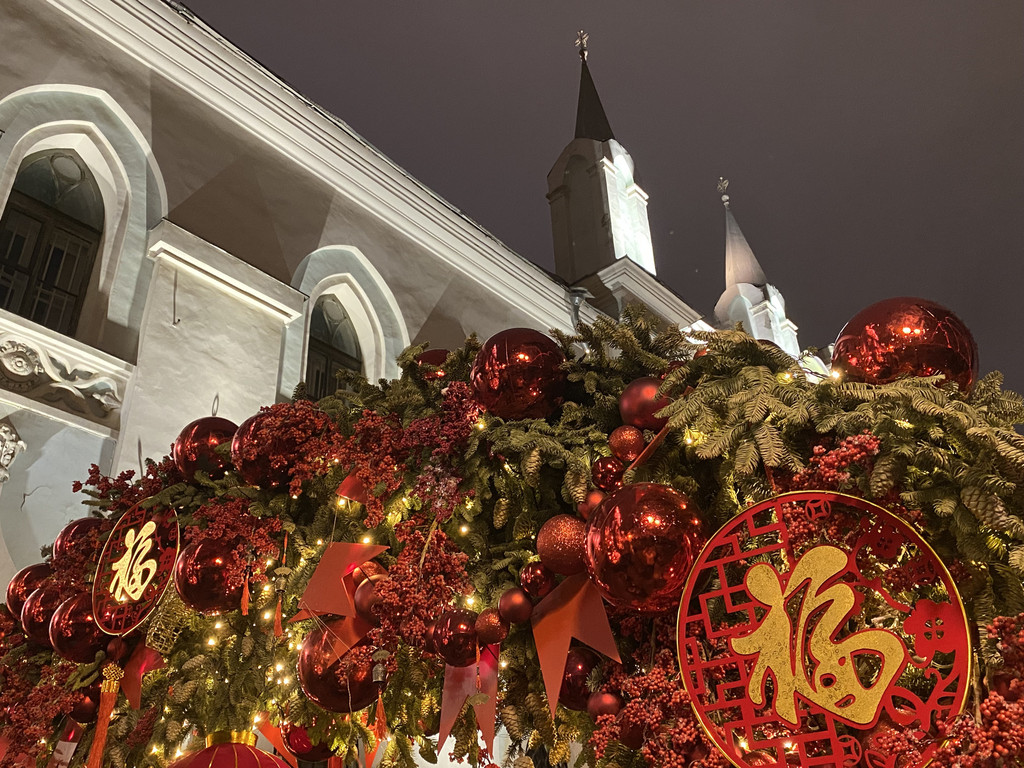 我们订的是红场附近的旅店,虽小小的,但挺有特色,类似芬兰桑拿木屋风格,楼层分布有艺术展示空间和温室花园。俄罗斯的旅馆一般都没有电梯,而且室内的暖气开的很热很闷,甚至需要开窗透气。抵达入住后,我们就前往红场逛逛。一路上华灯齐放,有圣诞主题的,也有中国春节的花灯,红场附近有条步行街,更是张灯结彩,街的中央做了景观小品和售货亭,虽然圣诞过去了一个多月,但是圣诞屋、圣诞花、圣诞老人等的装置还是摆放着,浓浓的圣诞氛围,古姆百货旁甚至还有溜冰场和旋转木马等游乐设施。