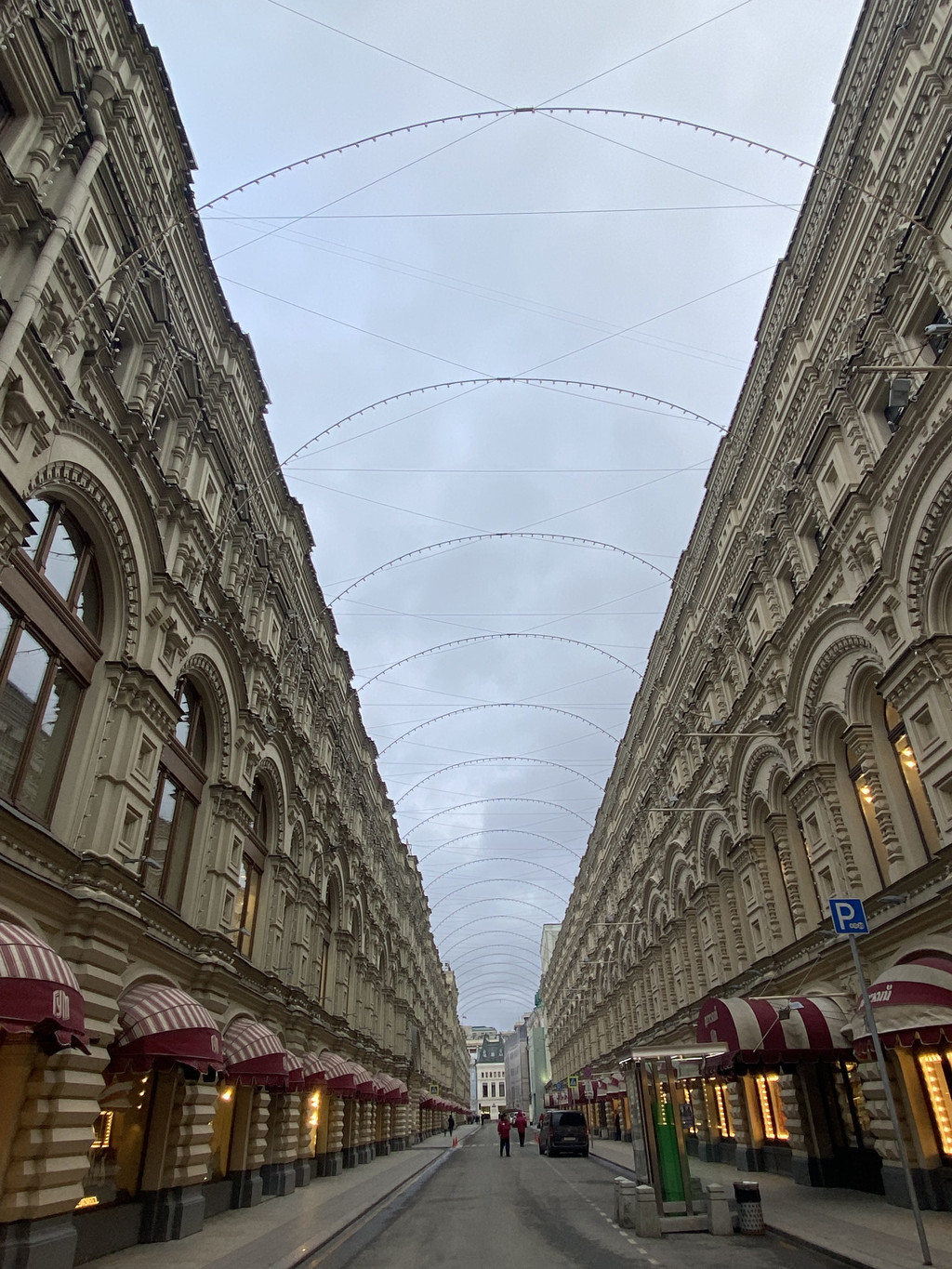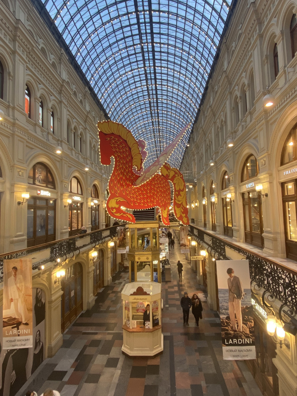 出了克里姆林宫,回到了红场,一路寻找网红冰激凌,一番搜索后,发现就在古姆百货里的通道上。古姆百货是莫斯科一个高档百货店,里面装修豪华,类似威尼斯人酒店的风格。百货店内店铺林立,不少是大牌奢牌,虽然受制裁,但是欧美大牌还有一些店开着。网红冰激淋Mopomehoe在一个小亭子内售卖,是那种甜筒,各种口味,其中甜瓜味很有特色,更关键的是价格很便宜。