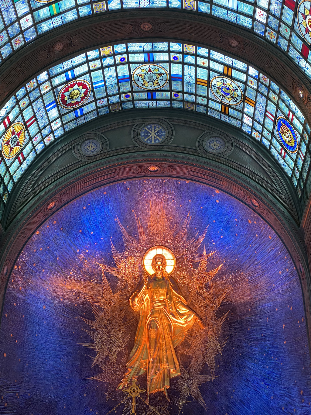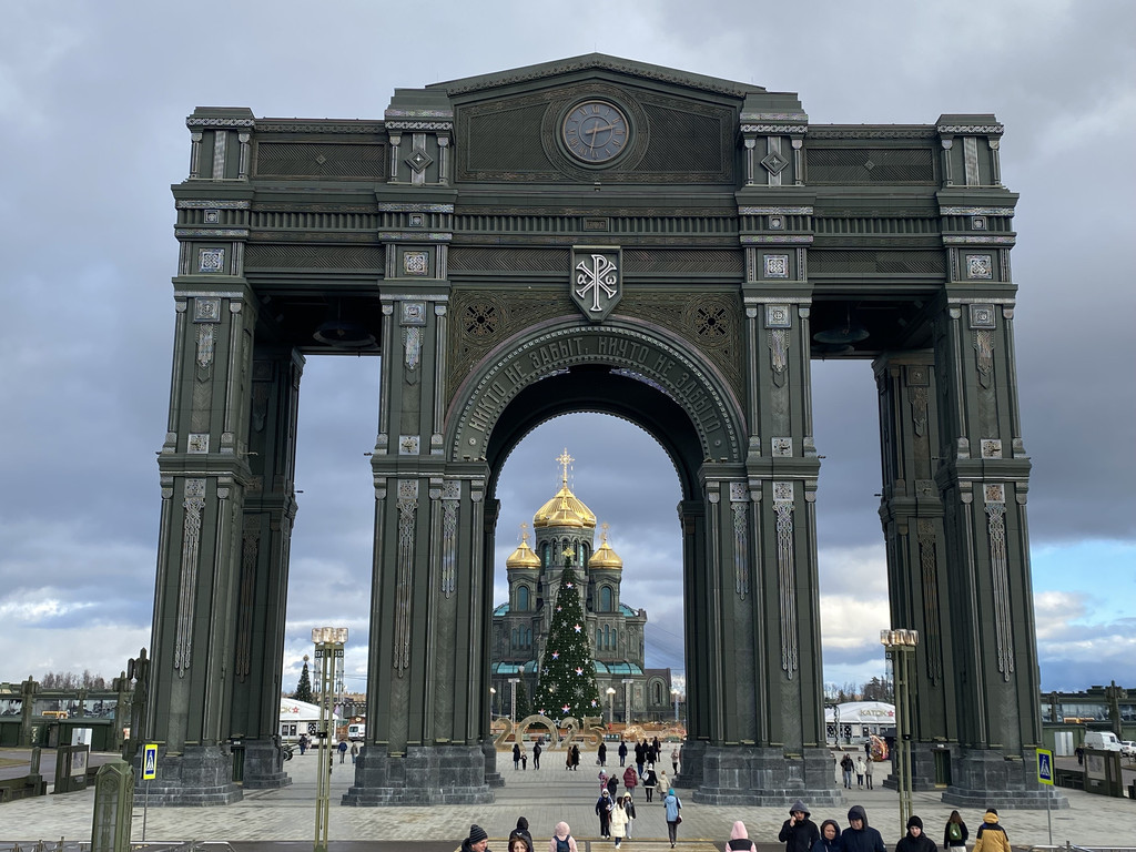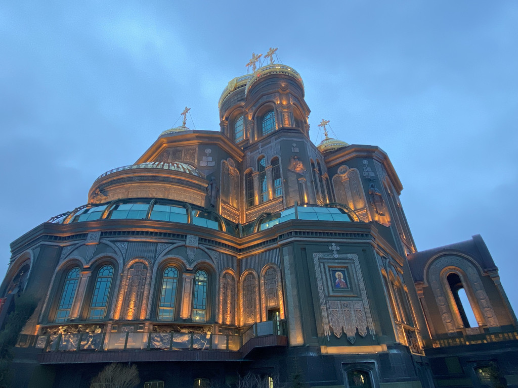 我们报了下午去武装力量大教堂参观的团,就在烈士墓所处的亚历山大花园背后的聚集点上车。武装力量大教堂位于莫斯科郊外,也被称为“基督复活教堂”,是世界上唯一一座以国家武装力量为核心的东正教教堂,为了纪念卫国战争胜利75周年而建,内部融合了二战场景和各种军事历史题材,于2020年6月正式对外开放。教堂的设计充满了象征意义。主穹顶的直径为19.45米,象征着1945年取得胜利。教堂的金属地板取材自当年缴获的德军坦克,金属战车被熔成大教堂的地板,供所有游人踩在脚下。教堂共有三层,一楼是一个洗礼池,暂时不开放;三楼是一个展览区,展示着一些画作;二楼则是主殿,最里面正中祭坛前供奉着“非人手所能创造的救世主”圣像画,四个侧祭坛分别供奉着俄罗斯武装力量的四位保护者。教堂内的穹顶、壁画、琉璃窗、吊灯等极尽奢华,金碧辉煌,色彩斑斓,展示着浓浓的俄罗斯美学风,号称上世界最漂亮的大教堂之一。大教堂的背面高耸着一尊名为“哭泣的母亲”雕像,外形是手捂着脸哭泣的女性,雕像内部掏空,摆放着长明的烛火台,可入内参观。