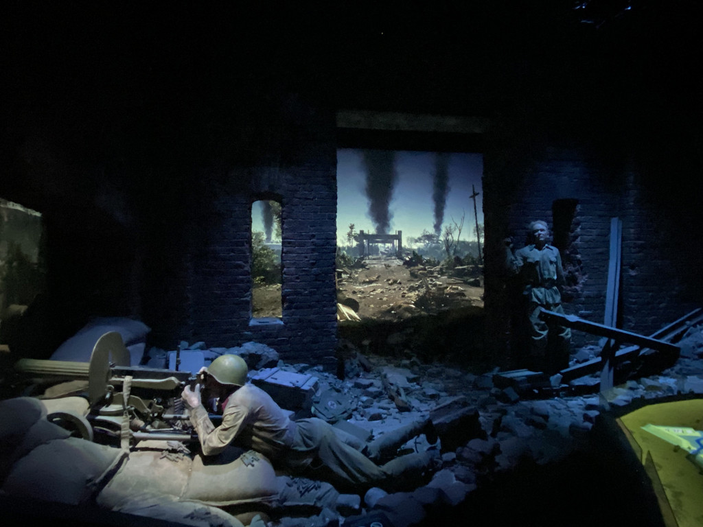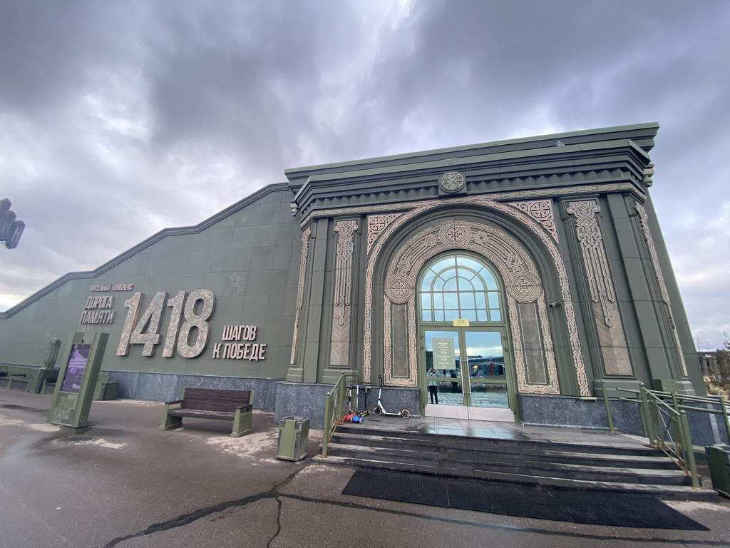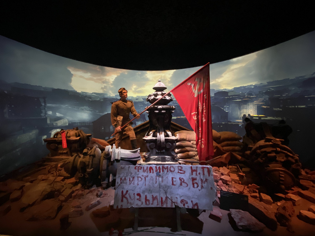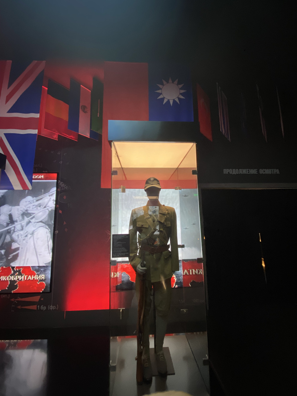 围绕大教堂,外围环状设立了一个纪念展馆,记录了苏联卫国战争完整历程的1418天,从阳光明媚的周末到炮火纷飞的战场,最后战争胜利重回和平。这个展馆以时间顺序展示了人民的生活和战争的细节,以时间分段分成许多个小主题馆,具体展示了与战争有关的人物照片、服装、武器、牺牲烈士的遗物、各种书信文书,并通过场景布置,如破损被毁的房子、战壕、坦克、散落的弹壳等,以及声光电,如炮火纷飞、空袭警报拉响等,还原了战争的片段,让人身临其境,沉浸式观展。在接近战争尾声阶段的馆内,发现了中华民国的国旗和军服,是作为世界反法西斯战争国的内容展示。展馆的路很漫长,展览的内容也很丰富,走完这1418天的历程几乎近2公里,终点处有一电子屏,从1跳动到1418结束。这个展馆类似俄罗斯的爱国主义教育基地,有许多家长带着孩子前来参观。今年正好是二战胜利80周年,所以下午的参观别具意义。
