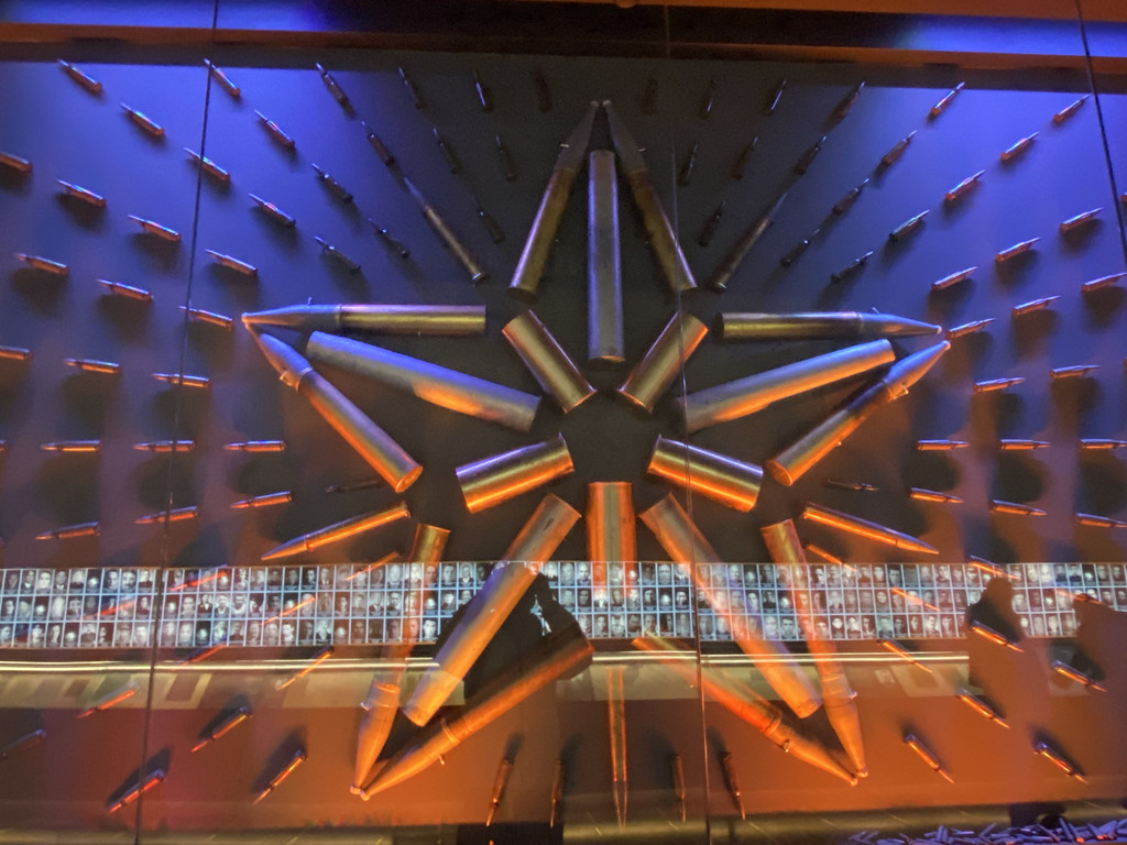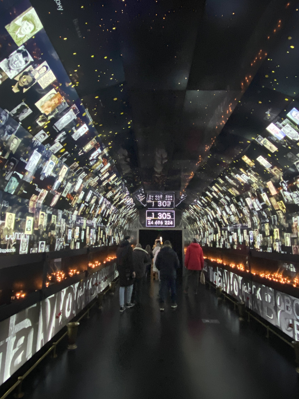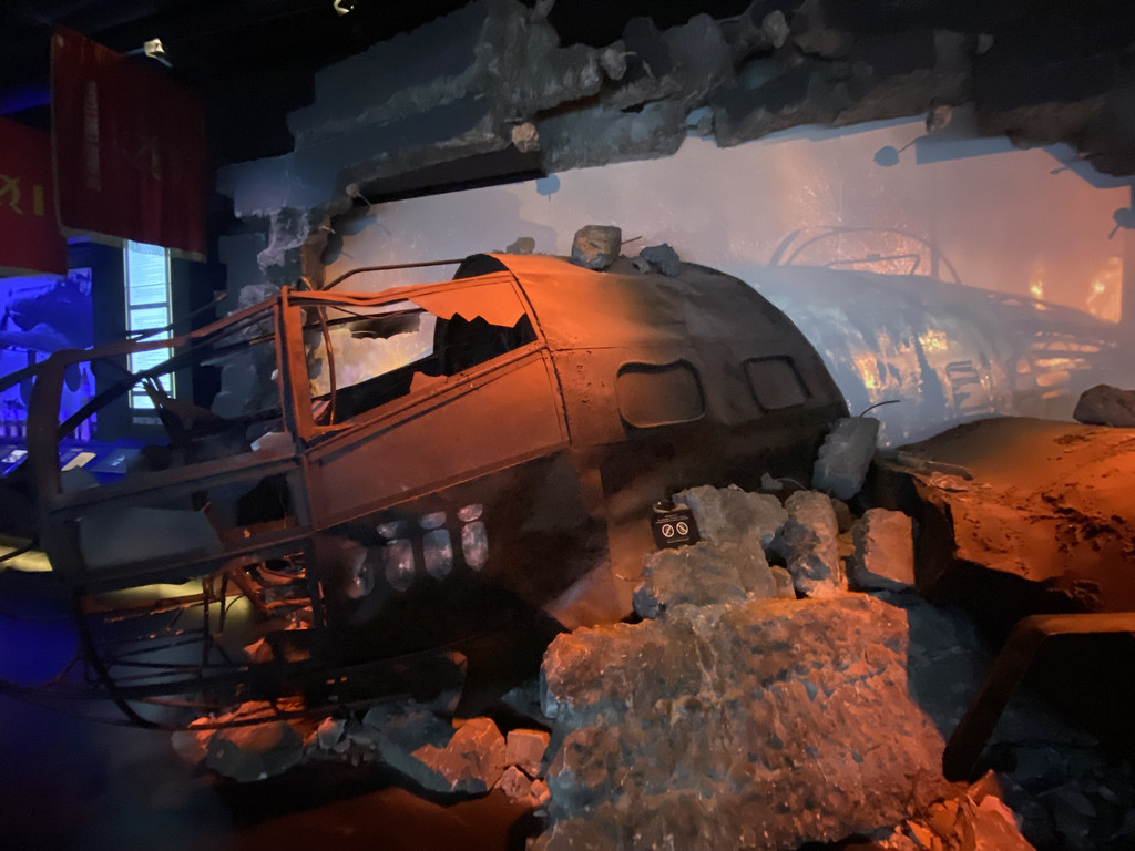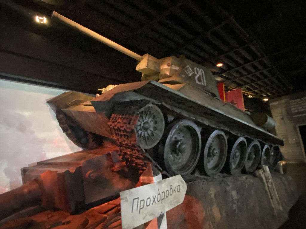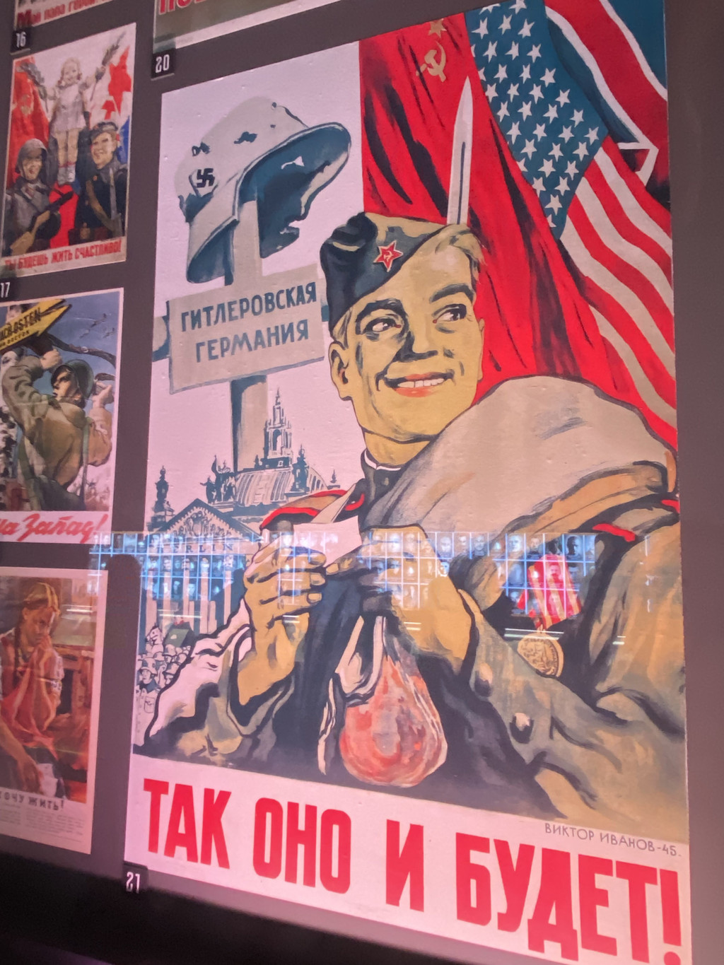 围绕大教堂,外围环状设立了一个纪念展馆,记录了苏联卫国战争完整历程的1418天,从阳光明媚的周末到炮火纷飞的战场,最后战争胜利重回和平。这个展馆以时间顺序展示了人民的生活和战争的细节,以时间分段分成许多个小主题馆,具体展示了与战争有关的人物照片、服装、武器、牺牲烈士的遗物、各种书信文书,并通过场景布置,如破损被毁的房子、战壕、坦克、散落的弹壳等,以及声光电,如炮火纷飞、空袭警报拉响等,还原了战争的片段,让人身临其境,沉浸式观展。在接近战争尾声阶段的馆内,发现了中华民国的国旗和军服,是作为世界反法西斯战争国的内容展示。展馆的路很漫长,展览的内容也很丰富,走完这1418天的历程几乎近2公里,终点处有一电子屏,从1跳动到1418结束。这个展馆类似俄罗斯的爱国主义教育基地,有许多家长带着孩子前来参观。今年正好是二战胜利80周年,所以下午的参观别具意义。