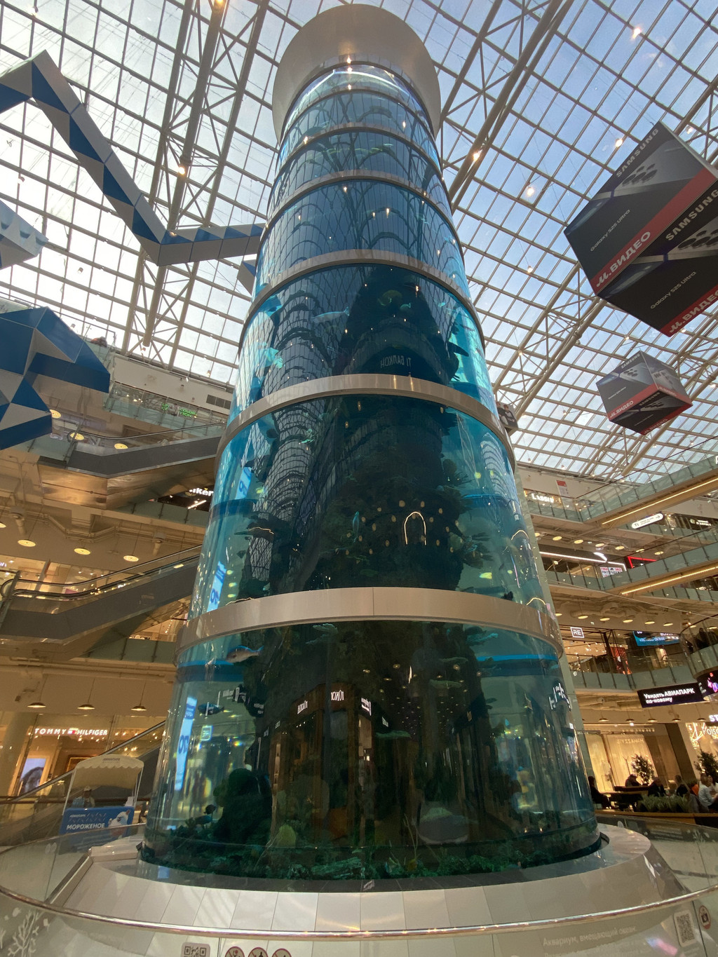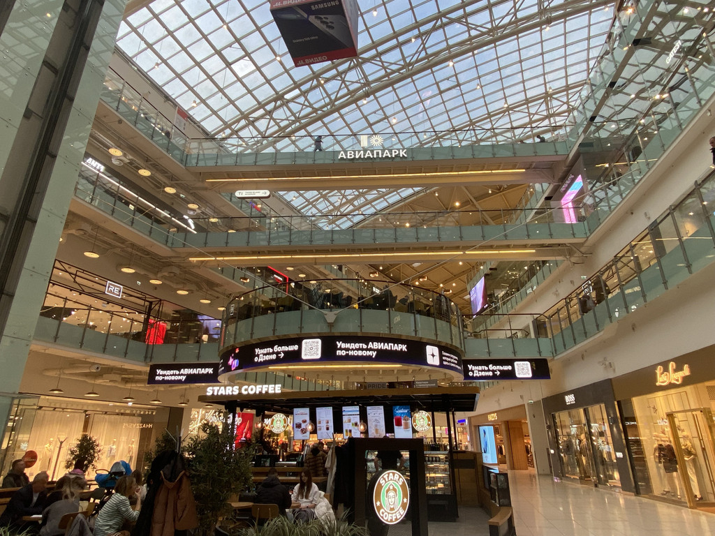 2/12在俄罗斯的最后一天,打算去买些当地特产商品,就去逛了全欧洲最大的购物中心之一——Авиапарк。购物中心位于地铁11号线Цска站出口,占地超级大,听说是一个废弃的机场改建的。从地下一层到地上四层,一共五层,购物中心首层有两条主要的干道,商店就布在干道的两侧,楼上分别有空中连廊贯通,商场的中央是一根高达5层楼的透明巨柱状水族馆,直达商场顶部,鱼缸里游曳着各式各样的海洋生物,很震撼,此处是该购物中心的标志打卡点。购物中心的一二楼主要卖化妆品、服装、鞋包、首饰礼品等,中间夹杂着些咖啡、简餐快餐店,在这里可以找到星巴克的俄罗斯版——STAR咖啡。一楼有一家SUNLIGHT — 俄罗斯珠宝连锁店,SUNLIGHT是俄罗斯最好的本土珠宝品牌,款式新颖时尚,价格亲民,设计元素与潘多拉相似,提供平价却大牌的购物体验。该品牌主营俄罗斯585紫金珠宝、925纯银饰品,以及琥珀饰品。紫金是俄罗斯的国金,与铂金和黄金并称为世界三大金,紫金的主要成分是金属铑,因其高硬度和强抗氧化性保持不褪色,非常适合制作珠宝。而琥珀是数千万年前的树脂被埋藏于地下,经过一定的化学变化后形成的一种树脂化石,是一种有机的似矿物。在俄罗斯的加里宁格勒州集中了世界琥珀藏量的70%以上,俄罗斯琥珀因其纯净的质地和鲜艳的色泽,加之藏量大而闻名。SUNLIGHT的琥珀饰品设计新颖时尚,价格平易近人,无论作为装饰还是收藏品,都是首选。不过,在SUNLIGHT店里选购,展示柜里标注的价格都是虚高的,需要找柜姐一一询价,而且用俄罗斯手机号注册一个会员号,还可以享受他们家的会员折扣价。最后选了两个项链吊坠,具体也不知道怎么算价格,一件4696卢布,一件3458卢布,换做人民币也就是两三百元。三楼是一些潮牌店和运动品牌店,还有溜冰场、儿童乐园等娱乐业态,四楼主要是餐饮,有一个类似大食代的美食广场,其中一家兰州拉面很出名,老板和店员都能说中文,师傅在现场拉面,卖480卢布一标准碗。购物中心的地下一层和部分一层开有一家欧尚超市,规模很大,里面商品种类繁多,我们在里面补货,咖啡、蜂蜜、巧克力、肉肠等俄罗斯土特产一站购齐。