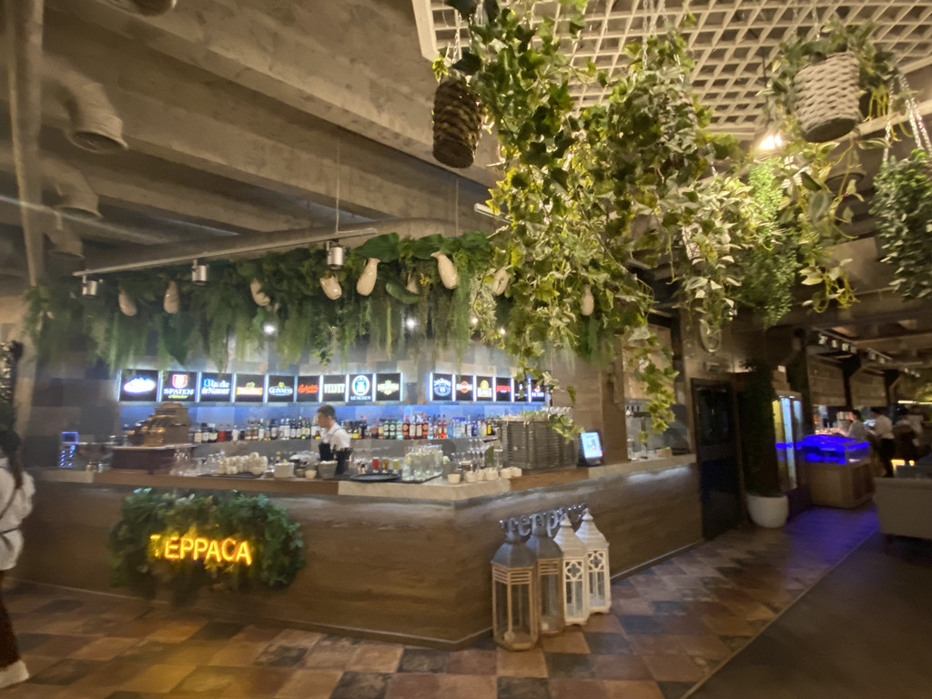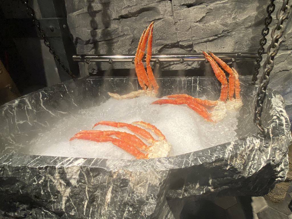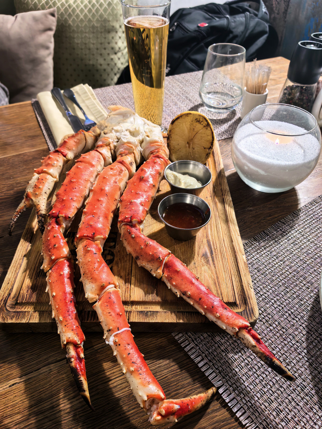 晚餐是在网红餐厅——苔原餐厅用的,奔的就是去品尝帝王蟹,苔原餐厅就在最北麦当劳旁的商场四楼,餐厅装修丛林风格,有许多绿植点缀。这里的帝王蟹790卢布/100克,一般一公斤起售。我们三个人点了一公斤差一些,7031卢布。俄罗斯帝王蟹生活在北冰洋的海底,非常巨大,蟹脚有小孩子的手臂那么长。蟹肉主要就是在四只蟹脚里,一般烹饪做法是水煮,可以保持着原有的咸鲜,也可以蘸着调料吃,不过一定要用剪刀剪开蟹脚的壳,否则根本无法下嘴,另点了青口贝、海鲜饭、啤酒等,一共12000卢布不到,这也是此行吃的最贵的一餐了。