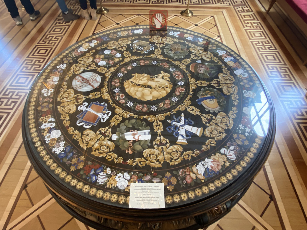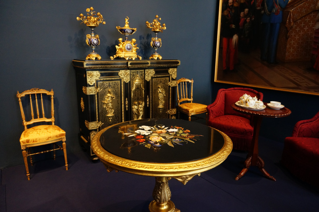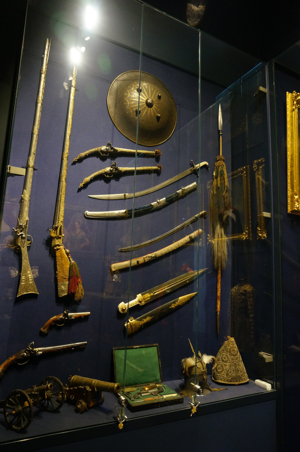 从宫殿群出来,朝出口处方向走,沿着外墙,隐藏着一座军械库,它曾是制造和存放兵器的重地。而今,军械库不仅是俄罗斯陈列珍贵文物的博物馆,更是世界著名的藏宝库。军械库分为8个展厅,两个展厅在一楼,主要展陈王室的服装、配饰、各类马车,比如有叶卡捷琳娜的加冕服,王子的儿童马车,二楼的5个展厅则展览这历代沙皇的奇珍异宝,包括外国使节馈赠的国礼等也一一陈列其中,每一件都价值连城,令人叹为观止。只有一个厅展览的是火枪、剑弩等军械兵器。参观时要租一台讲解器,输入展厅的编号和展柜的编号,会有详细的中文解说。军械库内不能摄像摄影,一些展厅都有工作人员监督。如果边听解说边参观,大概需要2—3小时。