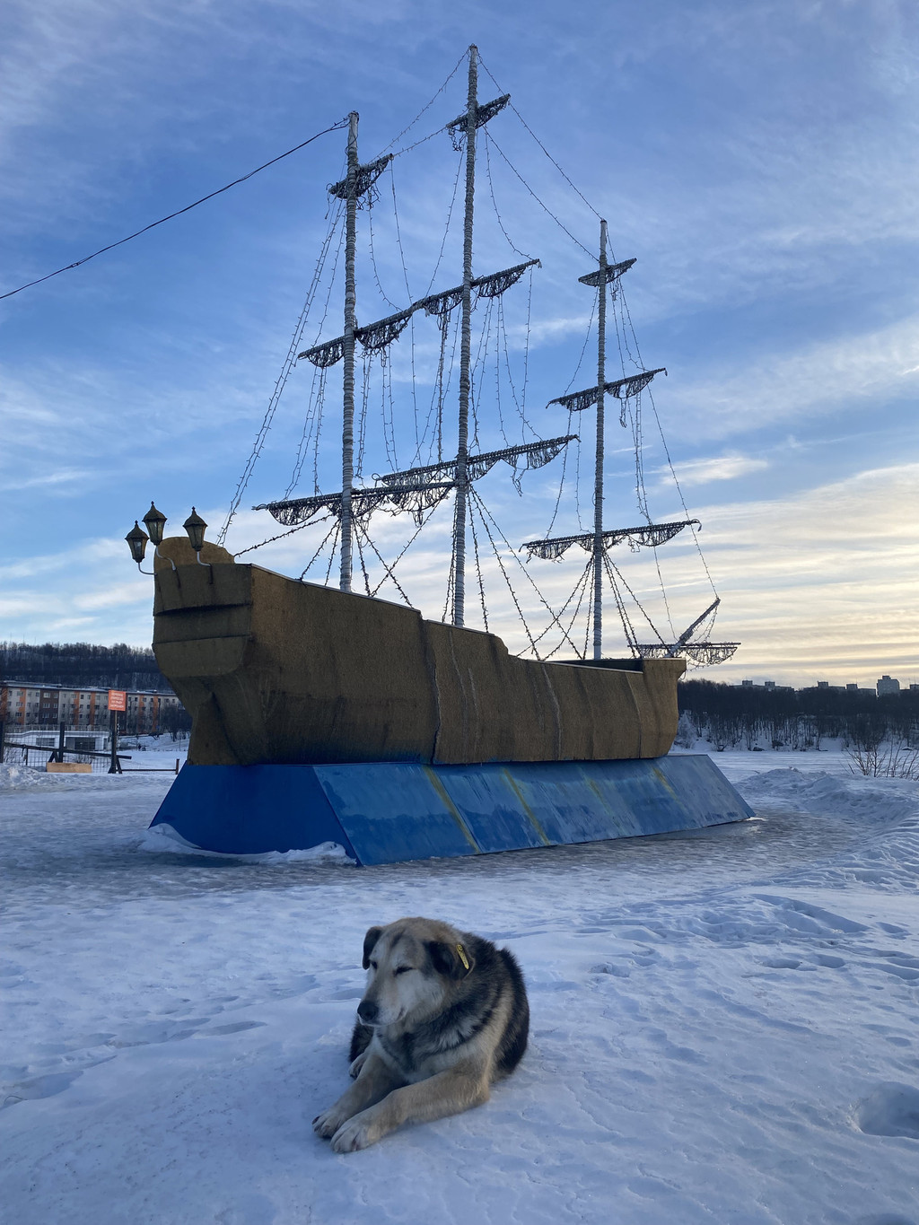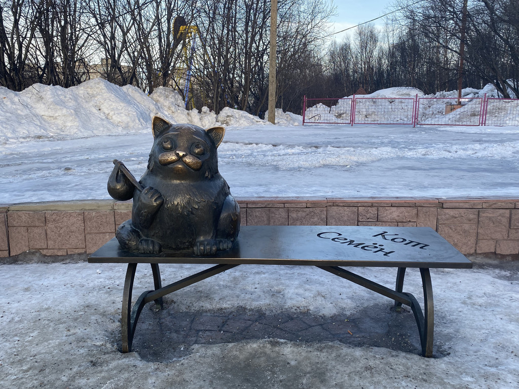 下山去往谢苗猫纪念碑的路上,我们在当地一家面包店吃了早中饭,披萨、三明治、卷饼、烤三文鱼等一大堆,才1800卢布不到。从阿廖沙到谢苗猫距离约1公里左右,但是不大好找,因为纪念碑太小了,而且安放在一个公园的长椅上,很容易错过。铜雕是一只背着行囊的小猫形象,这只猫的名字叫Семен(谢苗),它的故事是这个城市的一个传奇。据说1987年,谢苗的主人西尼辛一家去克里米亚度假,返程途中在莫斯科迷了路,猫不见了。六年半后,1994年,邻居突然按响了西尼心家的门铃,她怀里抱着一只脏兮兮的猫,眼睛严重溃烂,手爪都冻伤了,指甲也没有了。一开门,它立马跳下来,自信满满地走向它平时吃饭的位置,竟然是谢苗!从莫斯科到摩尔曼斯克坐飞机需要三个小时,相距2000公里。谢苗是如何历经六年从莫斯科回到摩尔曼斯克的?这简直是一个奇迹。为了纪念这只忠诚勇敢的猫咪,人们建了一座纪念碑——谢苗猫。雕塑谢苗朝上白着眼,嘟哝着嘴,似乎很委屈的样子,也难怪,六年光阴吃了多少苦,只有它自己知道。公园内有不少游乐设施,还有一大片雪场,有人滑雪,也有开雪地摩托,坐雪地香蕉船的,旁边还开有一家谢苗猫咖啡馆。