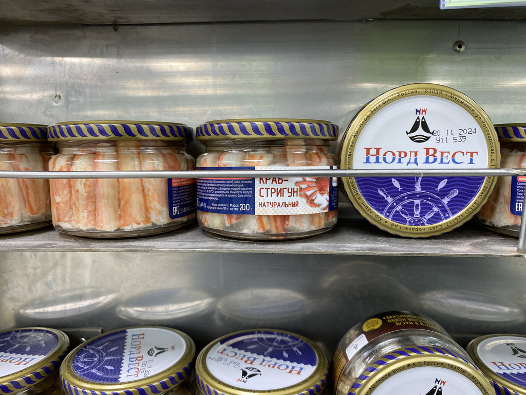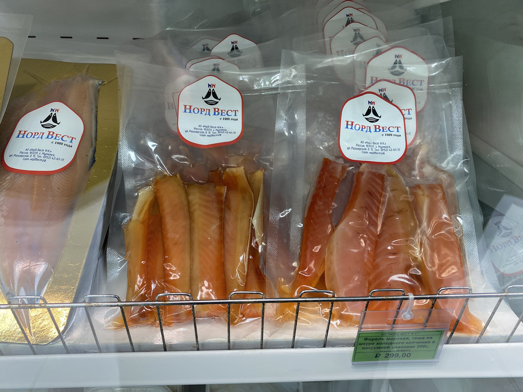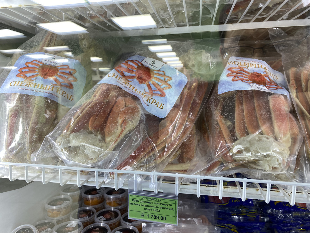 2/10摩尔曼斯克的景点这几天基本都跑完了,昨天专程前往的州立博物馆因为修缮关闭了,扑了个空。因此,今天的安排就没有特定的景点目的地,于是想体验下当地人的日常生活。上午逛了当地一家小型的海鲜超市,里面卖各色海产品,有冷冻包装的,也有新鲜的,帝王蟹是这里的特色,还包括一些罐头制品,如蟹腿、鱼子酱等,以及腌制加工的鱼干等,店内充斥着鱼腥味。
