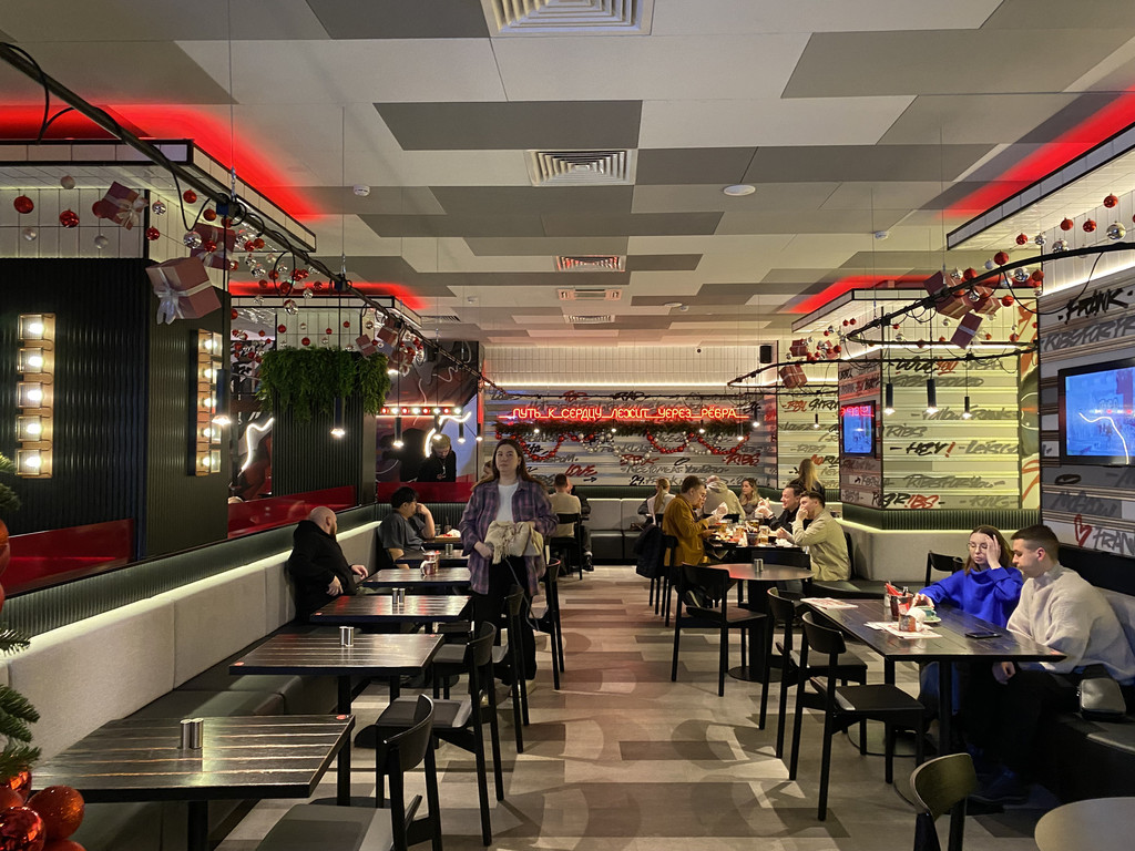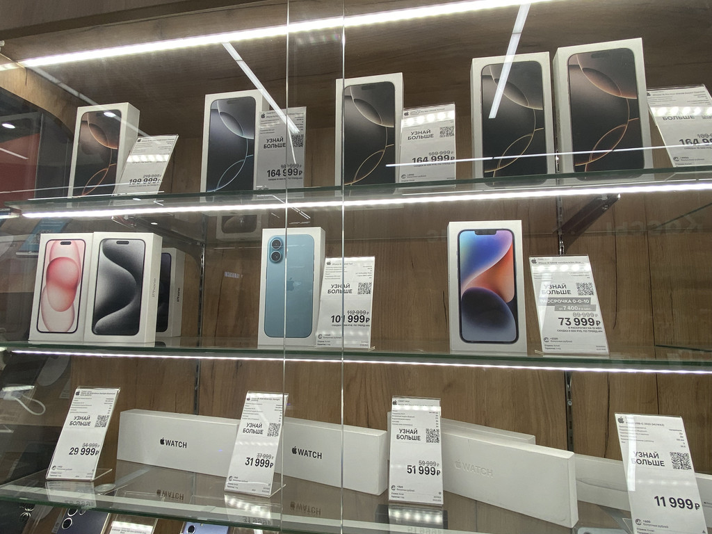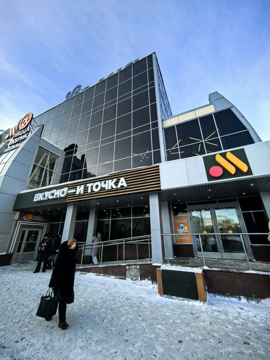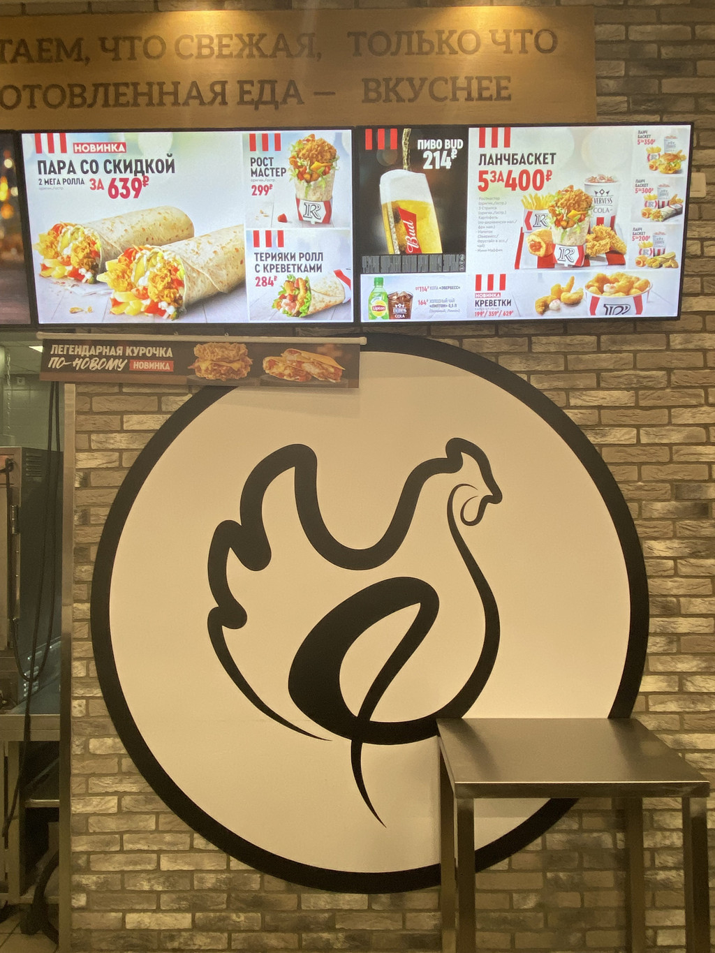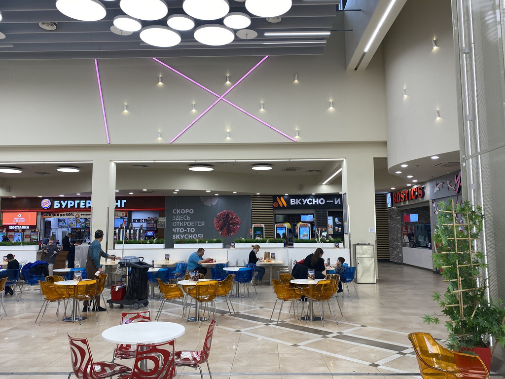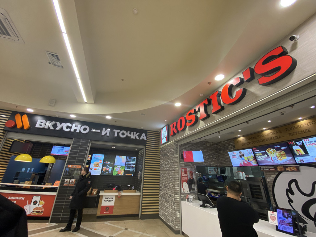 海鲜超市旁紧邻着一家大型仓储式卖场——向日葵超市,里面各类食品饮料、生活用品、家用电器等一应俱全,是当地人日常生活购物场所。走马观花后我们去了海鲜超市另一侧的一个购物商场,类似国内的Shopping mall,商场内有各种业态、各类品牌的专卖店,俄罗斯的“迪卡侬”——Спортмастер在二楼,里面一些欧美的运动品牌还在售。电器店里许多都是中国品牌,例如华为、小米、美的等,苹果产品也在售,不过,也许是工作日的关系,商场里面的顾客并不多。三楼是类似大时代的美食广场,集中了各种快餐店,俄版的肯德基Rostic’s、俄版的麦当劳、汉堡王紧邻,Rostic’s的菜单和口味与原来的肯德基没有差异。在肯德基用了下午茶后就在商场休息和闲逛。外边还有一个洗车行,洗车都是自助的。