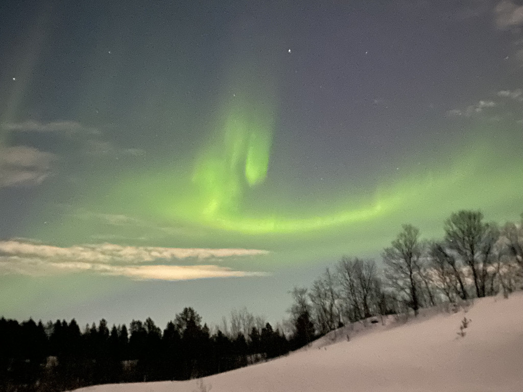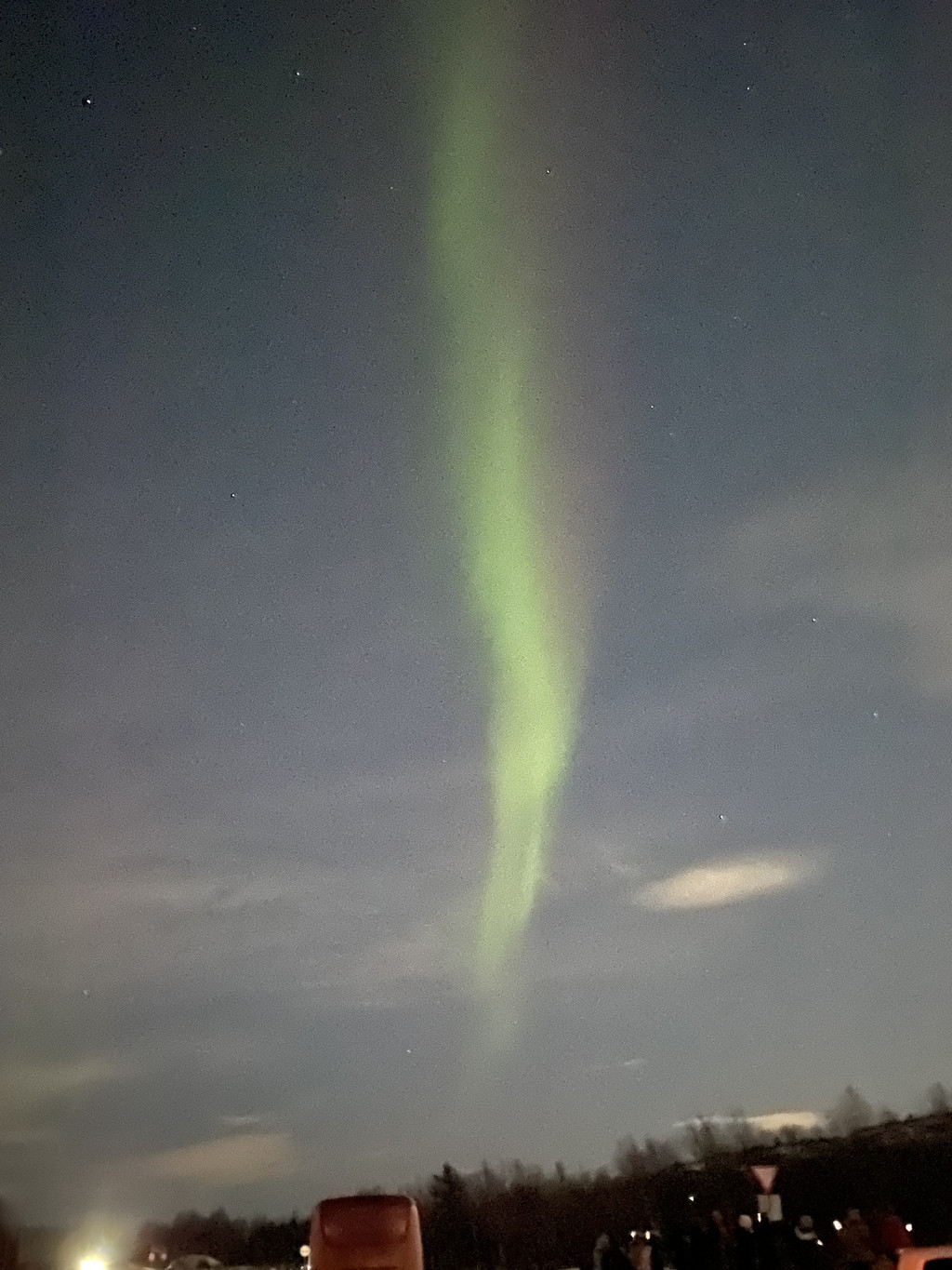 回到市区,我们在一名为Samarkand的中东餐厅用了晚餐,点了烤包子、大肉串、炒饭,味道很正宗,吃撑才1600卢布不到。由于前天晚上没有追到极光,我们尝试今晚再次追光。联系了那天同行小伙伴推荐的极光猎人,依旧是8000卢布一辆车,7点半左右我们包车从酒店出发。行进路线的大方向和前天晚上大致相同,跨过海湾驶往西北方向没有灯光污染的地方。在第一个观测点停车,看到已经有不少人在守候了。因为快到元宵节,当晚的月亮又大又圆,而且天空云层也比较厚,据说月光、星光和云层都会干扰极光的观测,我们觉得今晚能追到的概率不大。正心灰意冷时,忽然听到有人尖叫“哇塞”,顺着那个人的声音和手指的方向看过去,天空中有些朦胧光,没什么色彩,视觉效果微弱,举起手机看,则出现一条浅浅细细的绿带,不一会儿,旁边又出现一条,颜色似乎深了些,肉眼可以依稀分辨到绿色。在接下去的一段时间内,极光此起彼伏出现,有时候是带状,有时候是弧状,有深有浅,有长有短、有粗有细,让人目不暇接,忙不迭自己举高手机和照相机拍,或者凹着造型让伙伴拍。有些极光一开始较微弱,逐渐加强,持续一两分钟又暗淡下去,而有些光出现时就很强,持续时间也更久些,还有些泛着紫色。极光现象是由太阳风引起,当太阳风到达地球时,其中的高能带电粒子流在地球磁场作用下,进入大气层,会沿着磁力线的方向到达两极,并与高层大气(热层)中的原子碰撞造成的发光现象,地磁纬度在60°~90°的范围称为极光区。随着极光应接不暇的出现,来追光的车辆越来越多,车的大灯远光对极光观测产生了干扰,因此,我们的猎人建议换个地方继续追。到了第二个点,游客少了许多,而且,极光爆发更集中、更绚烂,站在一个小土丘上居高远眺,极光都是肉眼清晰可见,莹莹的绿光似翡翠般通透,色彩更深更浓,持续时间更长,过程中有些光还在飘动、扭转、变形,犹如精灵般变换莫测。耳边似乎传来《欧若拉》的歌声:爱是一道光 如此美妙 照亮我们 勇气的未来 魔力北极光 传说的预言 原来就是恋人的眼光......今晚可以说是极光大爆发,尤其在预报KP值只有3,月光亮、云层厚的条件下。在场的所有人都在欢呼,手机相机快门声不断,虽然天寒地冻,拍照的手都被冻得麻木了,但是大家的激动和兴奋溢于言表。直到接近零点,意犹未尽的我们才返程酒店。
