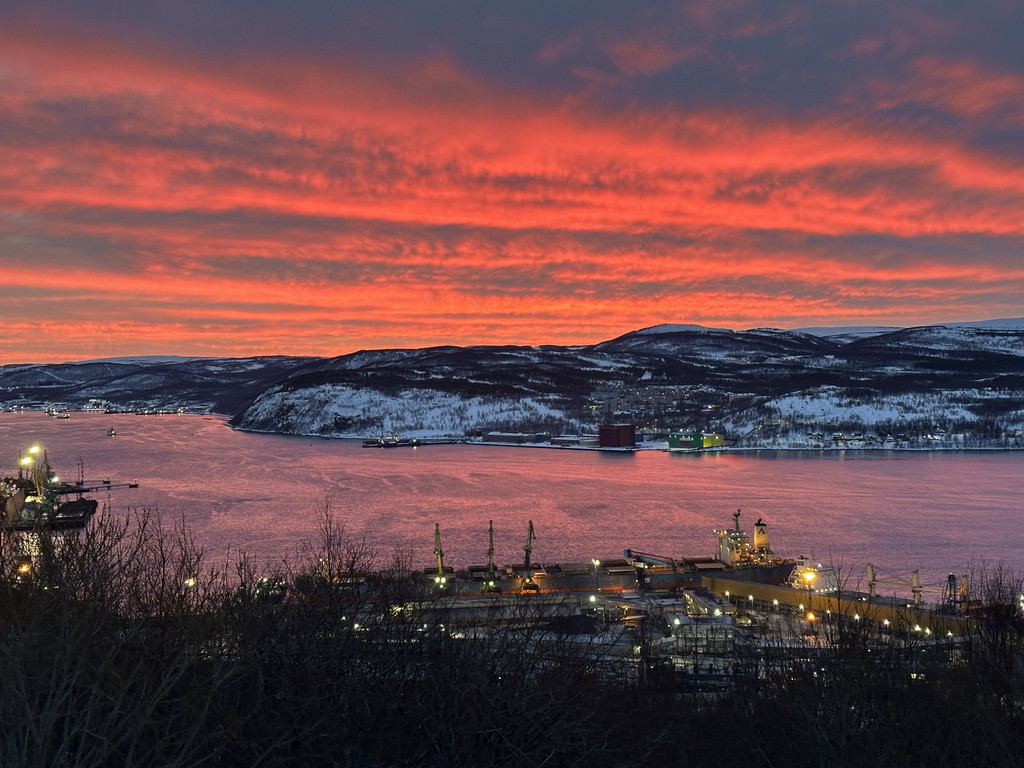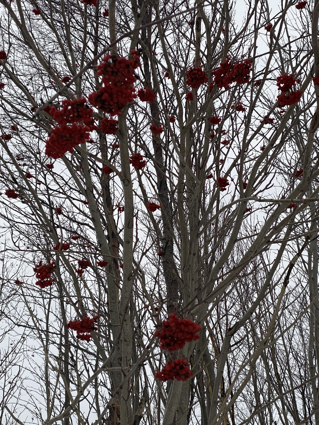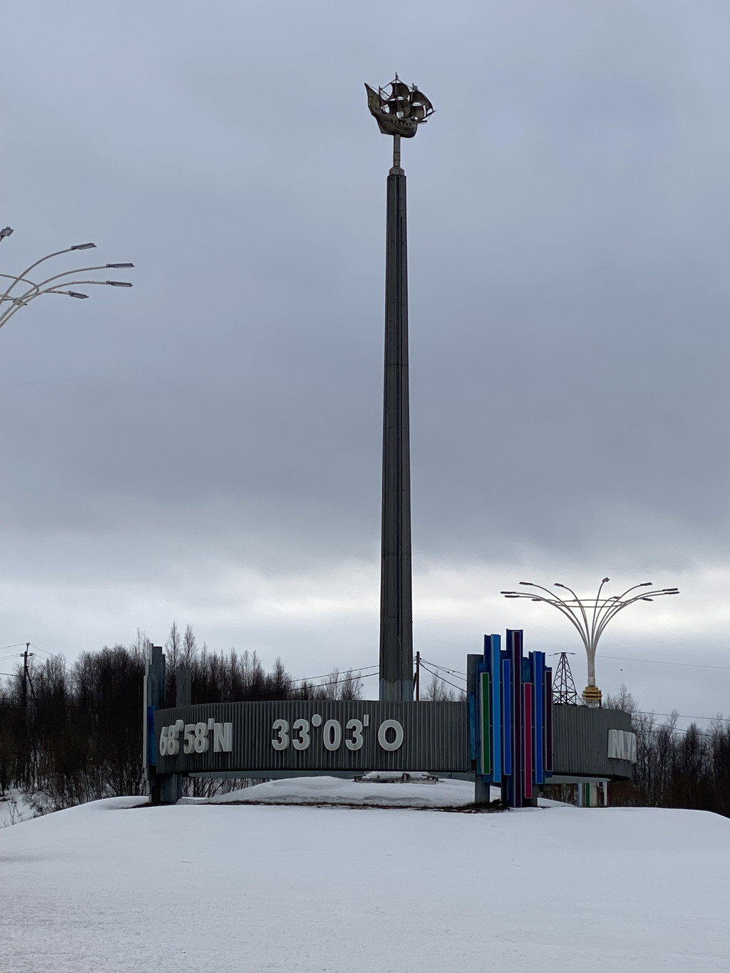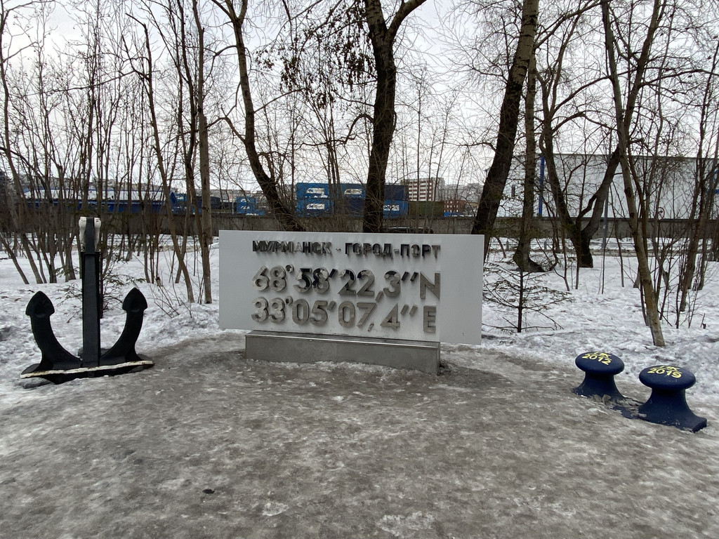 穿过这个天桥没走多久,居然就是列宁号破冰船所在地,而且破冰船外的广场就是摩尔曼斯克城市地标的打卡地,一块立牌上标示着摩尔曼斯克的地理坐标:北纬68.58度,东经33.05度。摩尔曼斯克地标还有一处打卡点位于106路公交车往返机场和市区的线路上,因此,我们乘坐106路回到这个地方打卡,看见在路中央竖立着一块更大的标牌,标示着摩尔曼斯克这座城市的地理坐标,附近还有几块牌子,上面写着“摩尔曼斯克——造世主之城、英雄之城、士兵之城”等标语,配上苏联共产党党徽和列宁头像等,带有上世纪苏共时期的时代烙印,展现了这座城市的战略地位和军事贡献。路旁的许多行道树的枯枝上结着一粒粒红色的小果实,在极寒的冰天雪地中,居然能够结出成片鲜红色的果实,不禁让人感叹大自然的神奇和生命力的顽强。经查,这种果实叫“云莓”,它只生长在北半球高纬度寒地原野,大多分布在靠近北极圈未受污染的沼泽湿地中,可以食用,也可以酿酒。