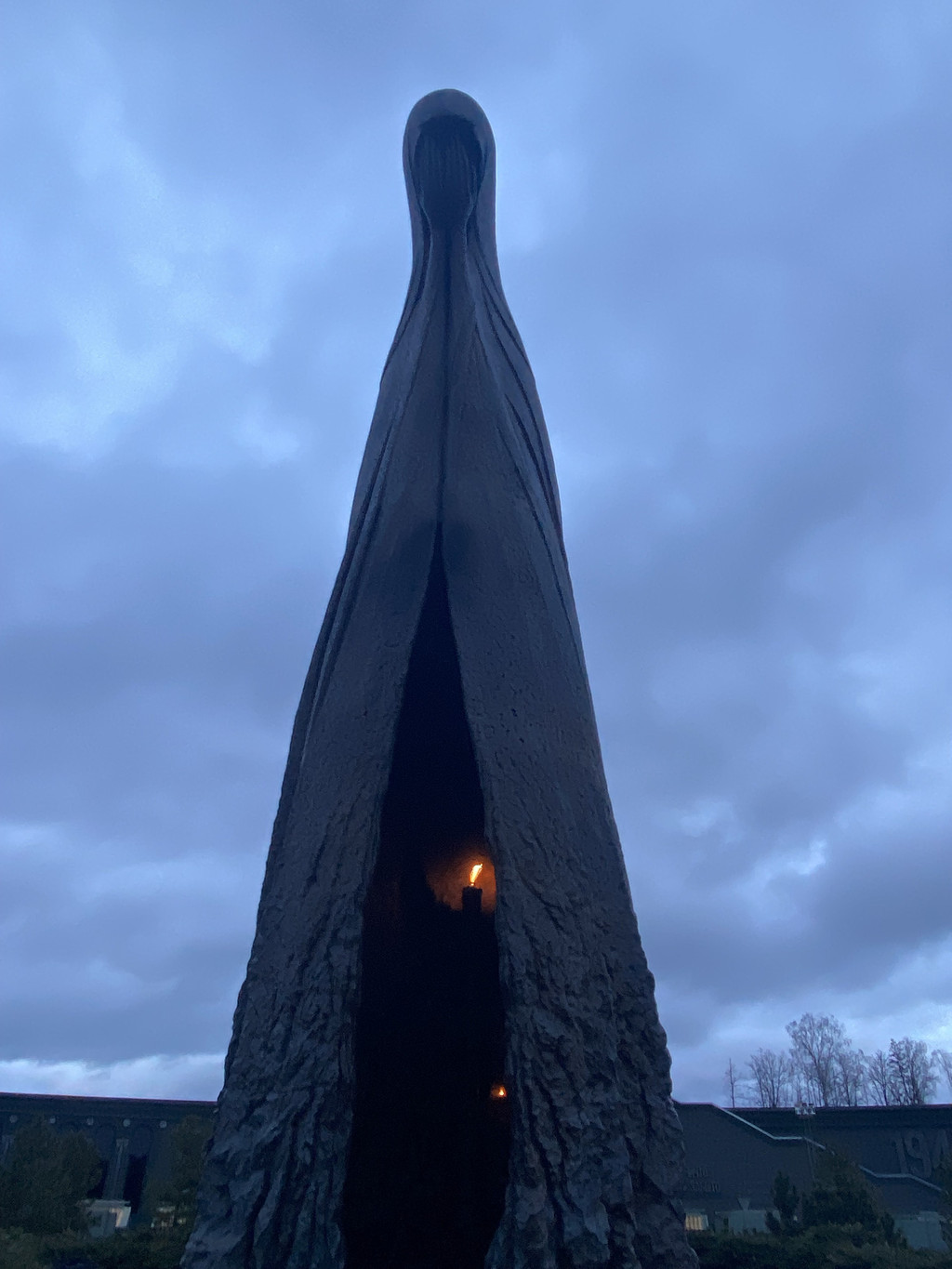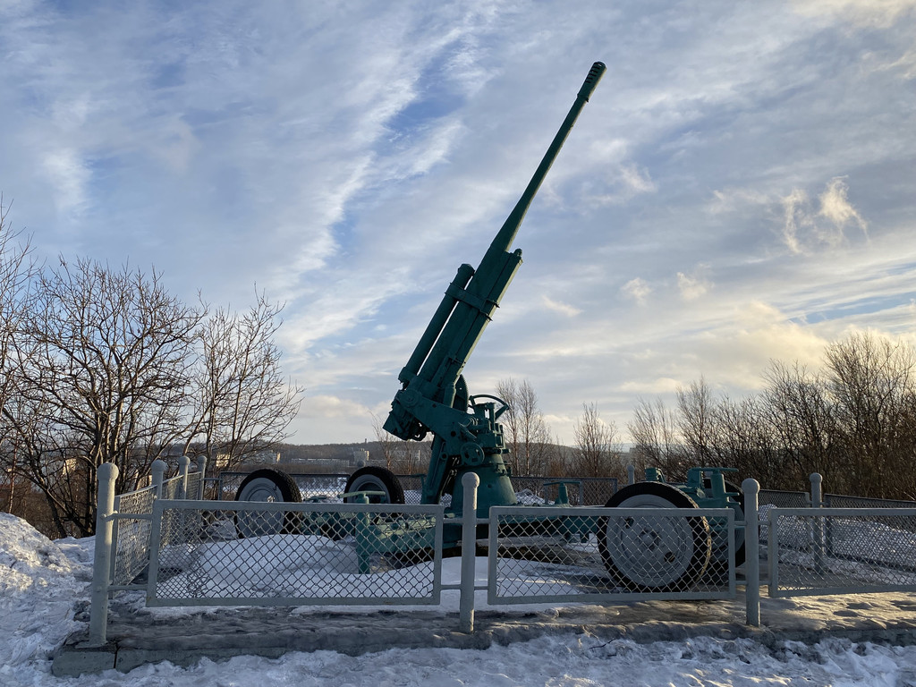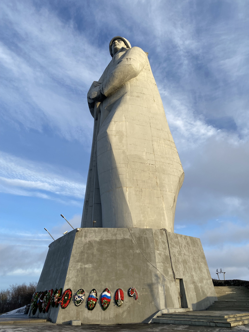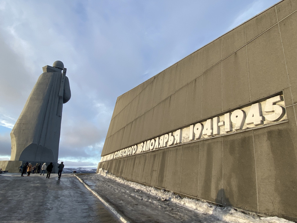 2/8一早前往阿廖沙纪念碑,又称为极地卫士纪念碑,坐落于面向摩尔曼斯克港口的一山头上,可以俯瞰着整个摩尔曼斯克市和科拉湾。此纪念碑是摩尔曼斯克为纪念二战打败德国军队30周年树立的。纪念碑高达32米,重5000吨,形象为一头戴钢盔,背着枪,仰望远方的士兵。阿廖沙是高尔基小说《童年》中的人物,也是高尔基的乳名,因为小说中的他具有坚定的,不屈不挠的意志和顽强的精神,所以人们习惯把这个纪念碑称作“阿廖沙”。摩尔曼斯克在二战期间是战略要地,作为北方舰队的基地和盟军援助苏联的重要通道,因此,石碑上刻有铭文:北极的捍卫者,北方舰队第14、19荣膺红旗勋章团,第7空军团.....石碑基座前燃烧着常年不熄的火焰,周边摆放着花圈,表达了人们对战争英雄的无限敬意和怀念。纪念碑的四周是一个开阔的纪念广场,这里经常举行各类纪念活动。每年的5月9日,摩尔曼斯克市民和游客都会聚集于此,庆祝卫国战争胜利日。一缕阳光照过来,似乎给纪念碑披上了一层金色的外衣。因为纪念碑地处山头,又面向巴伦支海无遮挡,山上的风非常大且刺骨,地面结满了冰,非常容易滑到。