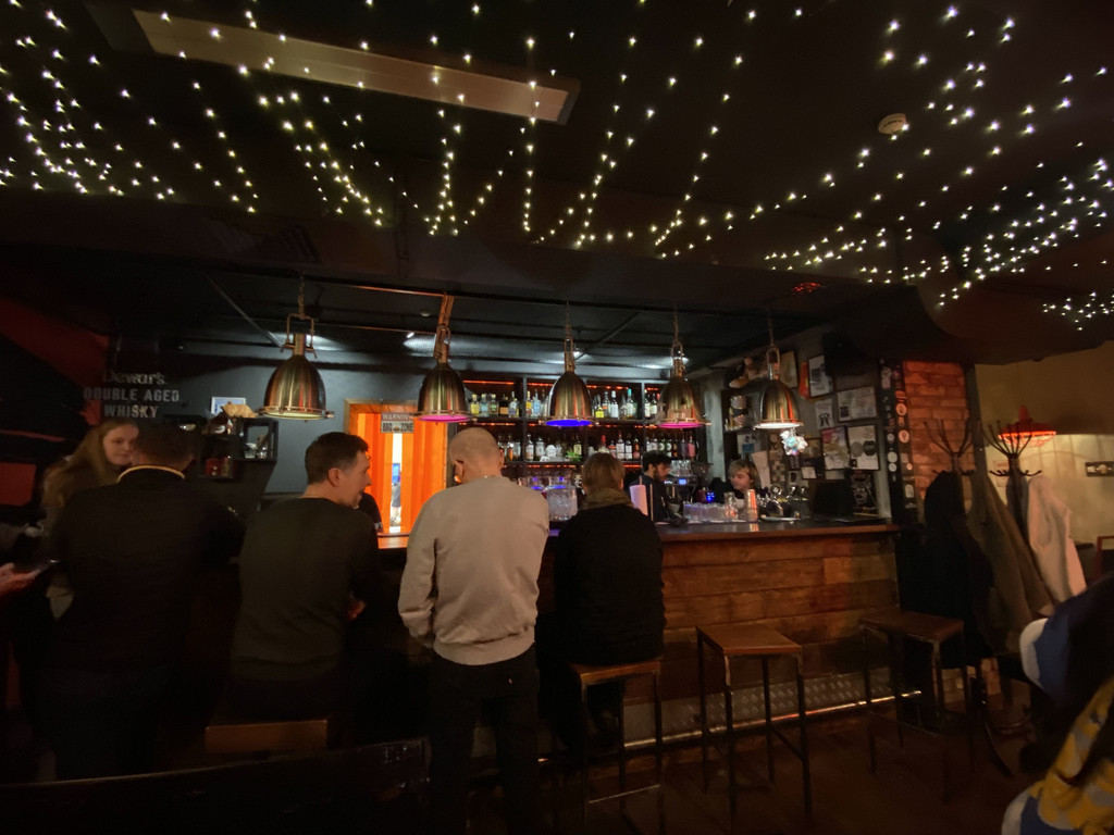 到了市区用餐,我们选择的是当地小有名气的Top Blade酒吧,位置不好找,在一栋不起眼的楼的半地下层,俄罗斯生意好的餐馆一般都要提前预约,好在我们在5点多到的,不是饭点,还有空位,只不过服务员提醒我们用餐时间不能超过2小时,这个要求似乎在后面取的不少网红餐厅都是同类口径。这家酒吧以烧烤出名,点了烤排骨、薯条、奶酪汤等,分量很足,一顿下来5000卢布。今晚预约了追极光,餐后就去出发点集合。追极光是此次摩尔曼斯克之行的重要任务,我们同样是在小某书上找的旅伴,1等3拼车,追光包车价格8000卢布。晚上7点,追光猎人(司机)驱车出发了,后来了解到,这些猎人有许多预测极光和追极光的软件工具,有几个较为固定的观测点,有经验的猎人还善于观天象,猎人之间实时联系沟通,一旦有人在某个点追到了光,就会把定位通知同伴。我们的车一路朝西北方向开,跨过了海湾,光污染也越来越小,开了将近一个多小时,在第一个观测点等待,天较为晴朗,可以清晰地看见月亮和北斗七星。等的过程中,陆陆续续有其他车开来,都是追极光的游客,且基本都是中国人。室外天气很冷,风又大,时不时地要回车里坐会儿取暖,这样等了接近二小时,没等到极光,司机就提出换个地方追,又开车半个多小时,来到第二个观测点继续等待,随着风加大,云逐渐多起来了,室外冻得实在不行,后来就一直猫在车里,等人通知。这样又是一个小时左右,接近半夜12点,还是没有动静,司机说今天追到极光的可能性不大了,加之困得不行,我们只好遗憾地打道回府休息了。