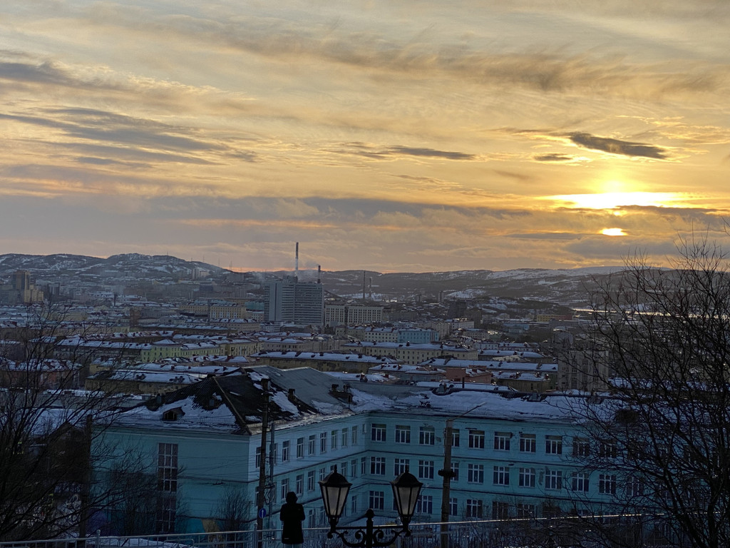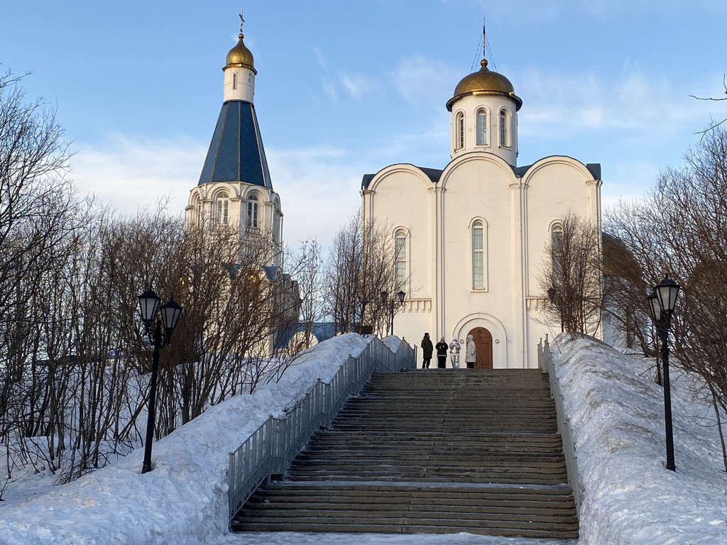 水上救世主教堂也是摩尔曼斯克的一个地标,建在一个山坡上,是为了纪念2000年俄罗斯的库尔斯克号核潜艇鱼雷舱爆炸事故中逝去的188位英勇士兵,他们的遗骸被安葬在教堂之下,这使得这座教堂的氛围显得格外庄严肃穆。每一位从教堂走出来的俄罗斯人,都会在门口虔诚地祷告,以表达对逝去英雄的深深怀念。从教堂拾级往下走,有一水手纪念碑,纪念碑的主体是一个高达17.5米的六角型灯塔,灯塔第一层是一个展厅,5面墙壁上是不同舰队的纪念碑,并有纪念这些牺牲水手的书籍展出。这个灯塔象征着摩尔曼斯克人们对出海海员的永恒期待,希望他们平安归来。从灯塔在往下走的巨大的船锚的铸铁雕塑,象征着对出海未再归来的人的纪念。船锚处也是一打卡点,面向城市和海湾,在夕阳的余晖下,港口和街道显得神圣而温暖。