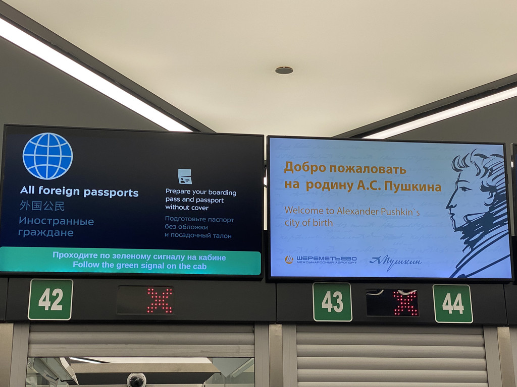 购物的时间总是短暂的,回到酒店已是下午近四点,打包行李再叫出租车去机场赶晚上7:20的航班,打来一辆车,司机看我们行李太多居然扬长而去,好在紧接着又打到一辆,此时一看导航,路上有好几段拥堵,我们通过翻译软件告知司机着急赶飞机,虽说是个女司机,但她一路加快车速,尤其在几个拥堵路段还抄了最右侧的车道(应该是应急车道),总算在一个小时左右如期抵达机场。进机场也是一路排队安检,最终有惊无险地办理了值机。东航的航班还是很准时的,晚上7点半左右起飞,一路睡了七个多小时后抵达了沈阳桃仙机场,已是国内时间的早上七点左右,取好行李再重新办理值机飞往上海,结束了这次难忘的俄罗斯之旅。