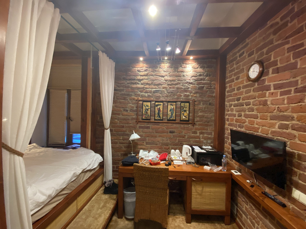 晚上的航班飞圣彼得堡,虽说晚点起飞,但提前到达,快抵达前,机舱广播里叽咕说了一通,猜想是机长说一路加速即将安全抵达,乘客们又是一片掌声,果然是战斗民族的航班。抵达圣彼得堡机场,用yandax叫了车,因为我们有三个大行李箱硬塞到后盖箱里,一路上司机嘟囔着,通过翻译软件大概了解他的意思是说平台要他取消订单,让我们叫货车,当然,这肯定是想加价的托辞,我们是肯定装不懂喽。就这样到了预订的酒店——亚历山大之家。这是一家具有艺术气息的旅馆,有许多类似图书馆、画展的共享空间,并且每间客房都有主题风格,我定的是和式主题,浓浓的日式风格,房间虽小小的,但是很有艺术范。