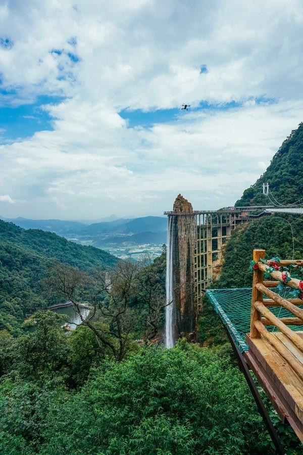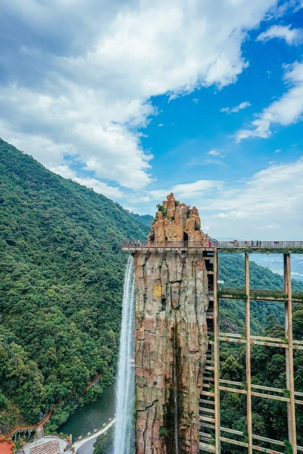 韶关云门山·云上飞瀑,挑战多项世界纪录电梯观景瀑布,大瀑布出水口宽8米,其落差高达168米,相当于五十层楼的高度,飞流直下三千尺,疑似银河落九天~