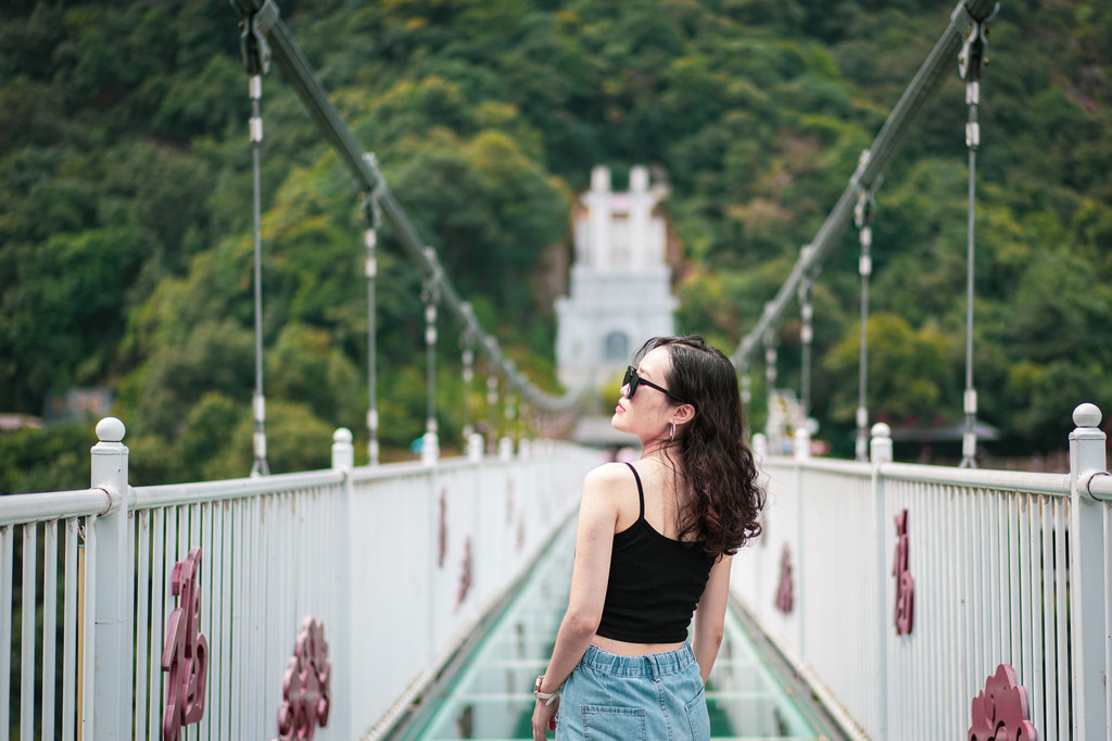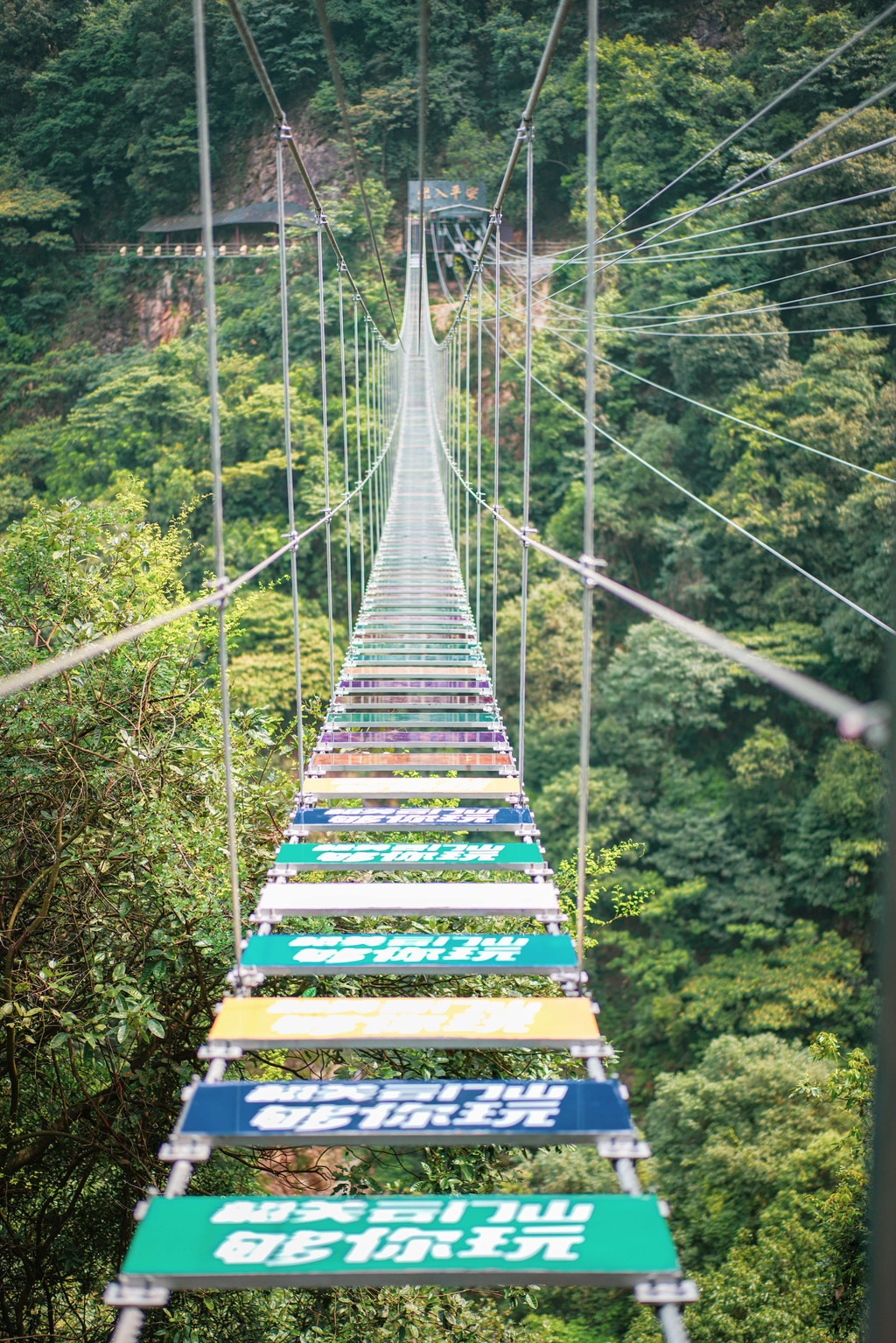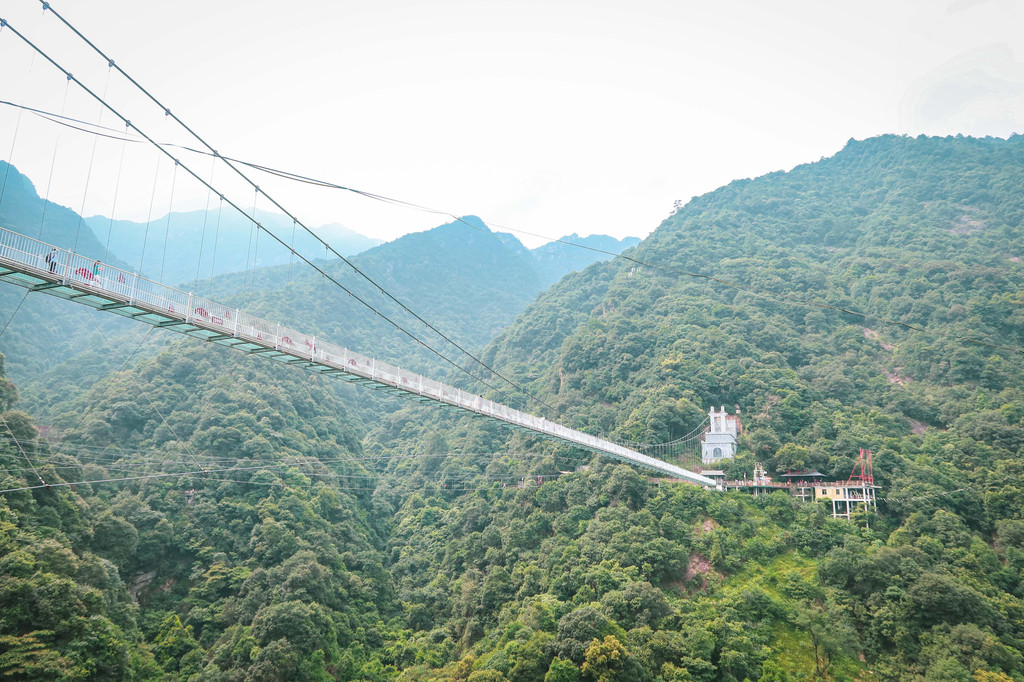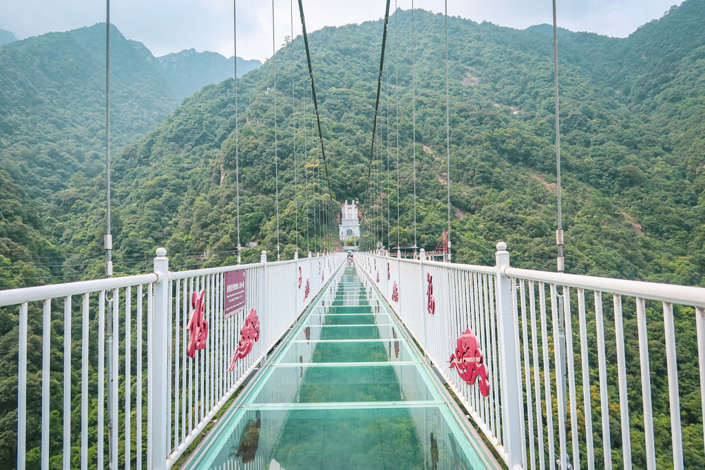 玻璃桥悬于望君台旁,直通对面山峰,两峰地势非常险峻,玻璃桥的下方就是峡谷,整个玻璃桥横跨于峡谷之上。走在玻璃桥上,如同漫步在云端,目之所及都是云门山的秀丽风光,体积感非常好。