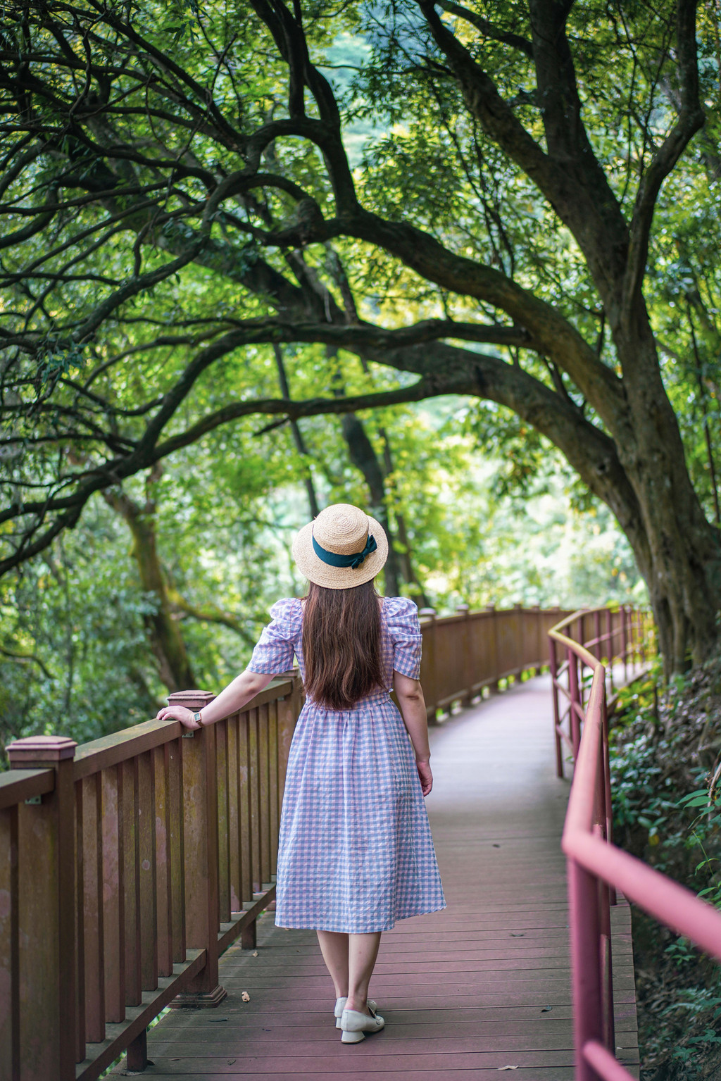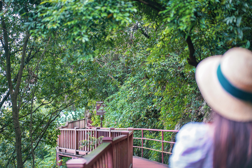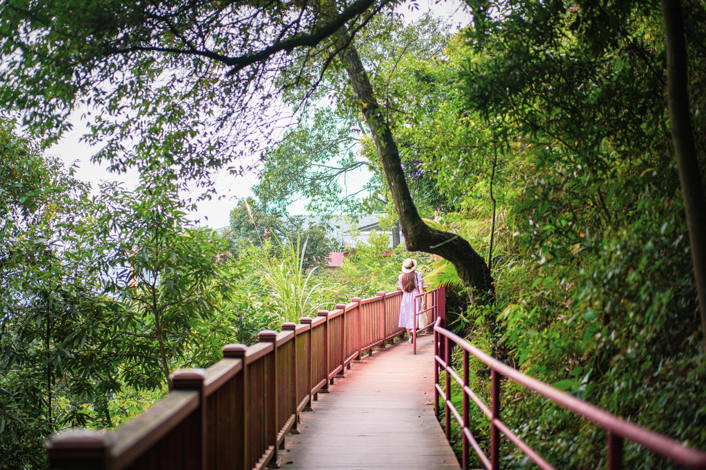 走在木栈道上,两旁大树林立,树荫葱郁,有一种穿梭在古木苍翠中间的感觉,阳光透过树叶洒下光斑,微风送来草木的清新香味,还有蝉鸣鸟叫声,身处这样的环境中,远离了城市的喧嚣和烦闷,整个人的身心得到治愈和放松。