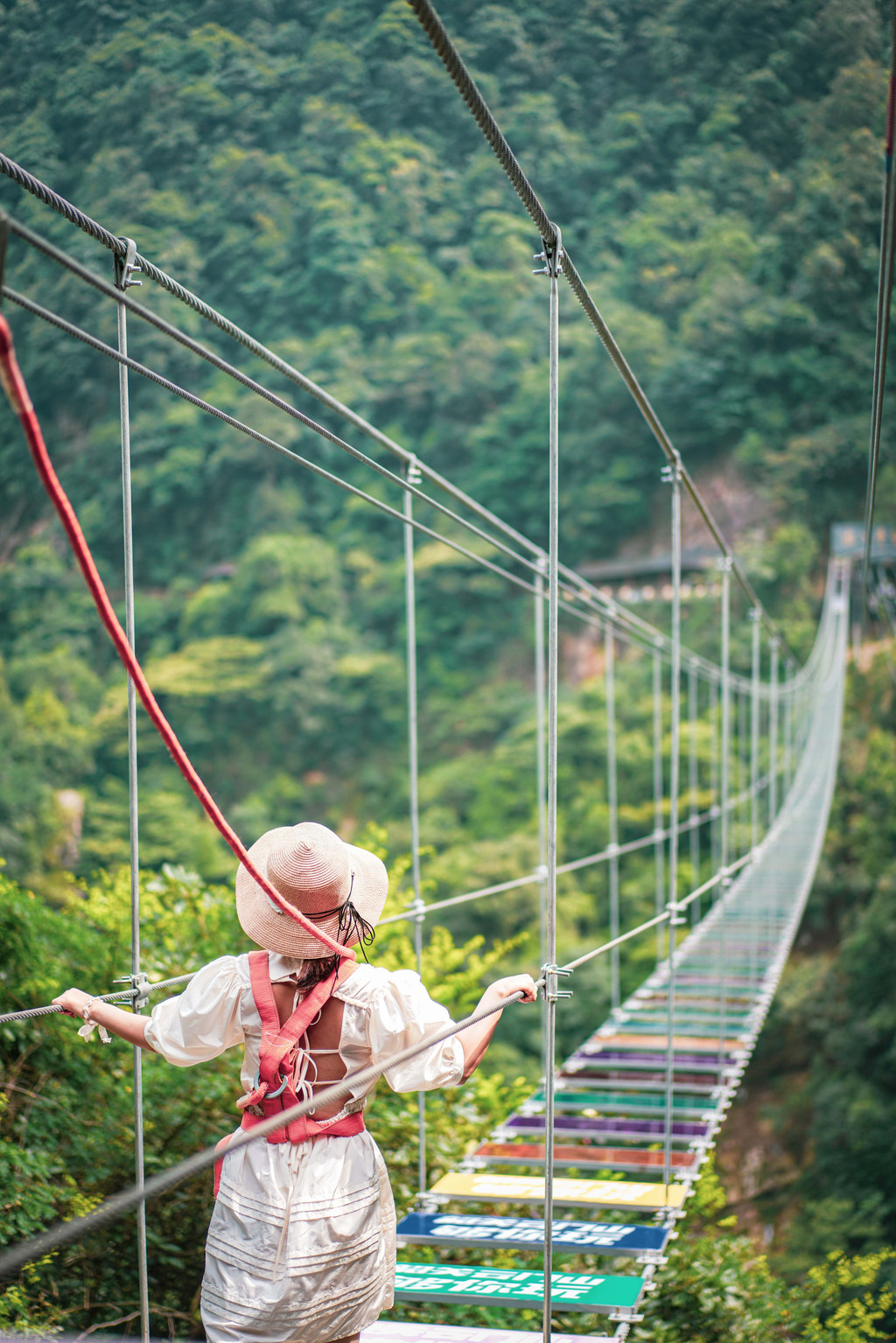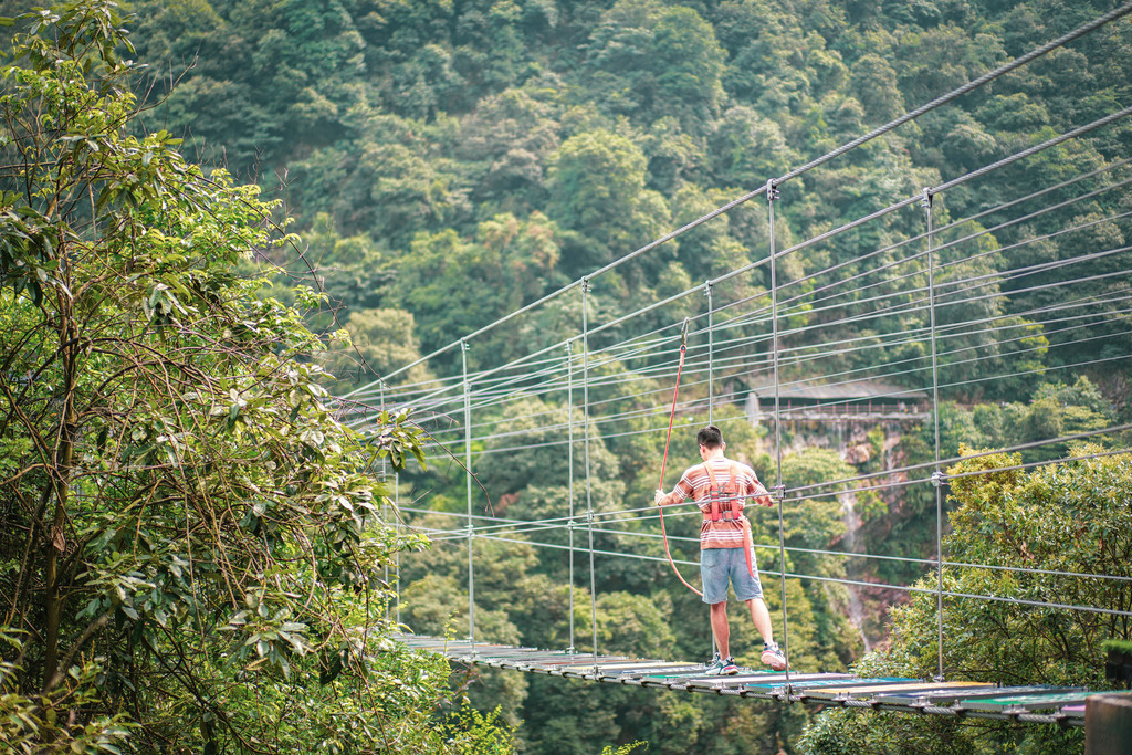 接下来便到了第七项高空挑战——步步惊心,一条悬空的栈道横跨在山的两边,中间是峡谷,看着挑战难度没那么大,但是,当你走到栈道中间时候,整个悬空的栈道会随着你的动作而摇摇晃晃,也是十分惊险的。特别是有风吹过的时候,那刺激,更过瘾了!非常推荐大家体验,有一种“人在空中走,景在脚下游”的快感。