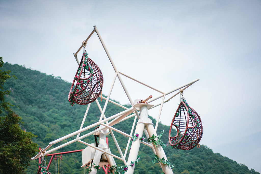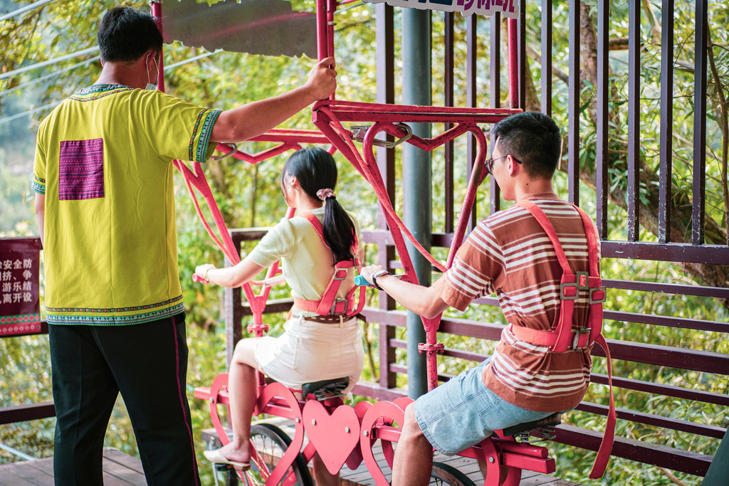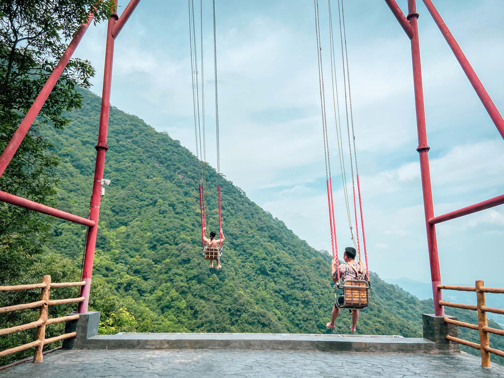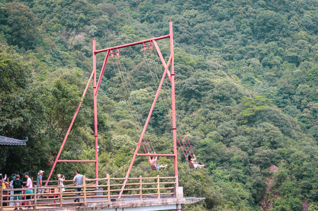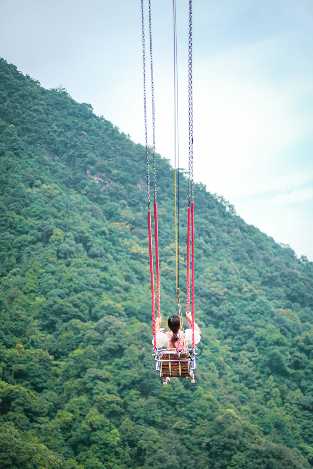 玻璃桥的另一端就是非常刺激惊险的高空挑战项目-悬崖秋千,整个秋千伫立在悬崖边上,一荡就会荡出悬崖外,整个人和座位都悬空在外,脚下就是悬崖和山林,真的是超级刺激,一定要来体验一下!