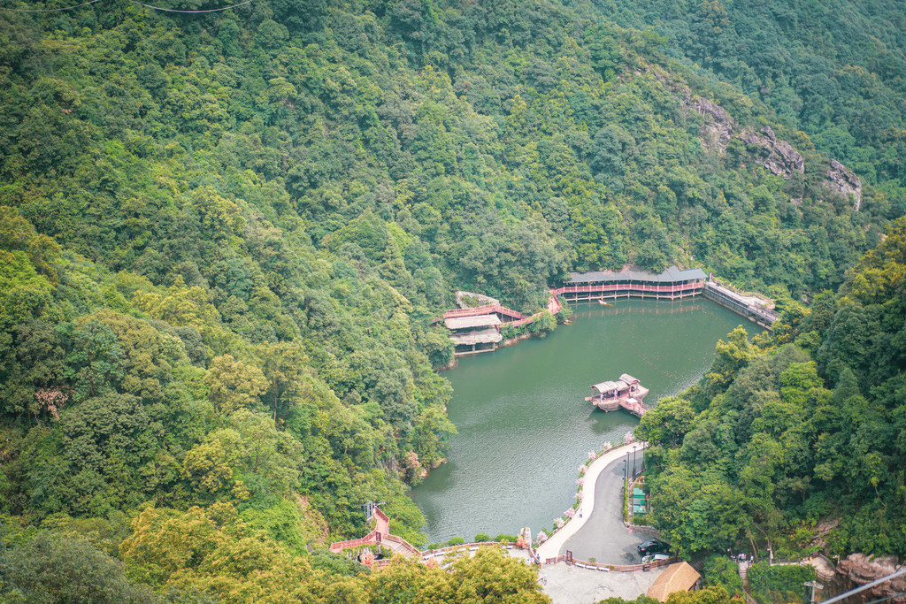 乘坐糖果缆车一路向山顶进发,糖果色的缆车穿行于葱翠的山林间,缆车外面一片郁郁葱葱的景色,迎面吹来的带着草木清香的微风带有了暑气,非常舒服。随着缆车越升越高,我们可以将云门山景区无限风光尽收眼底。