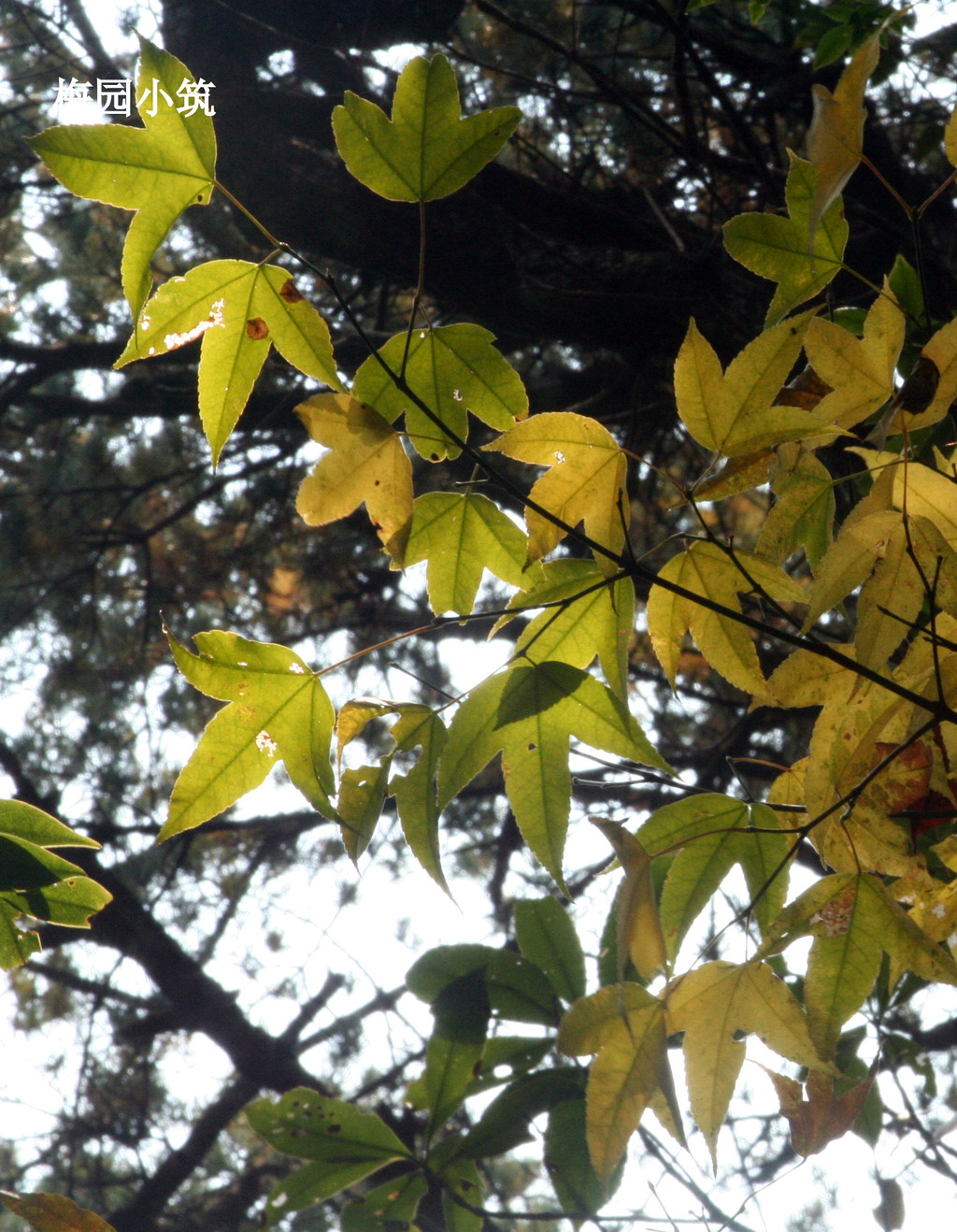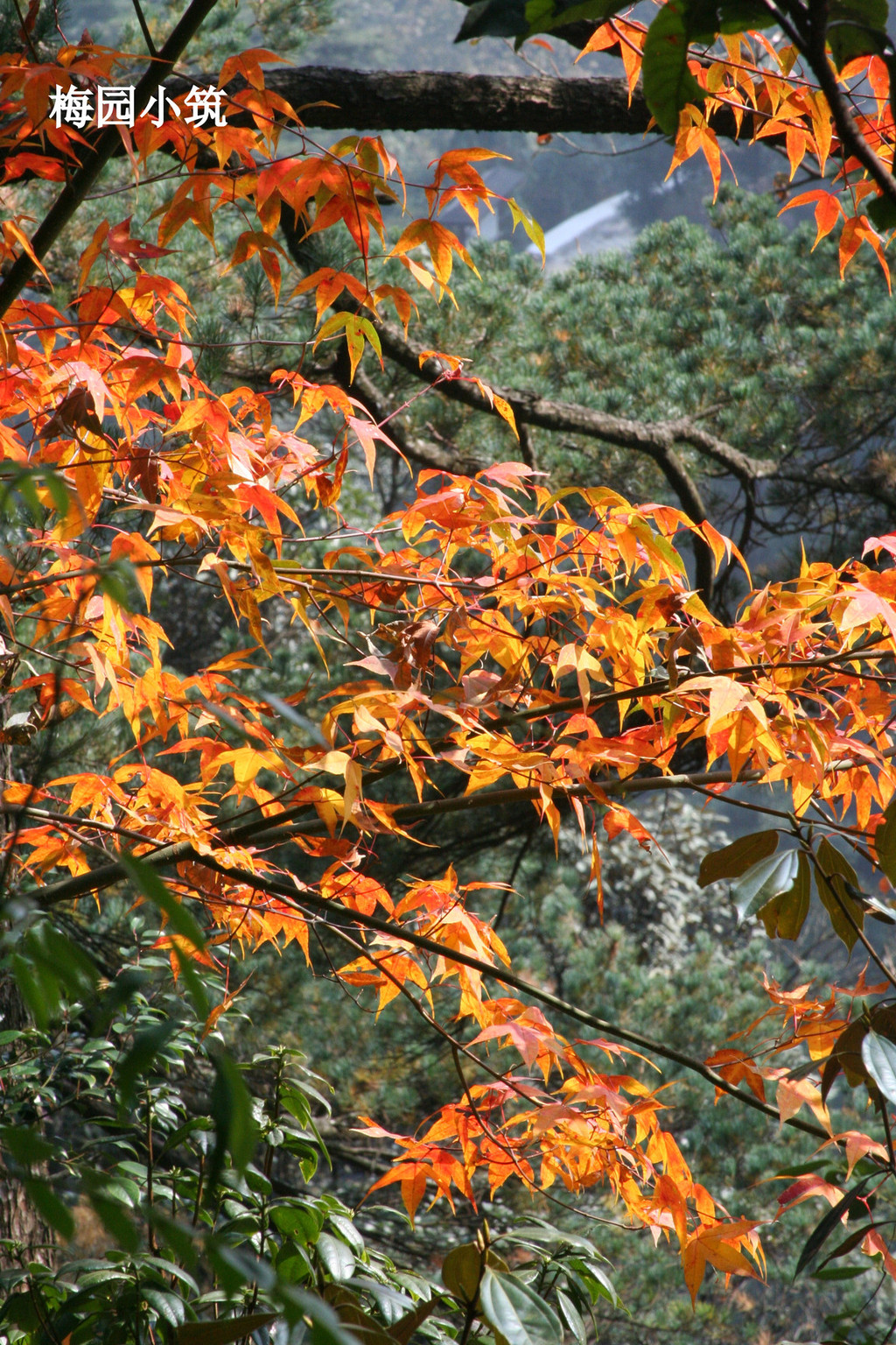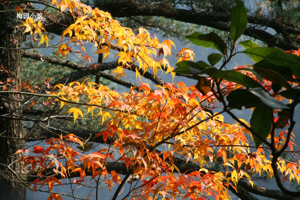 拾级而上,九曲盘旋。随意走过一处树丛,便会被这秋天渲染出的彩色画面吸引,从黄到金,到浅红,到深红的一层层的叶片在温暖和煦的阳光下纠缠着视线。于是停住脚步,久久不忍离开。