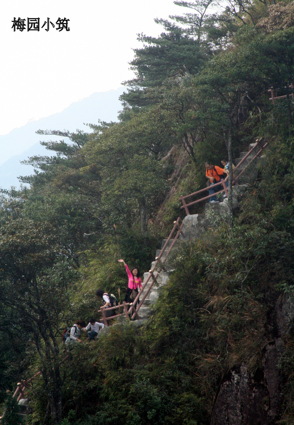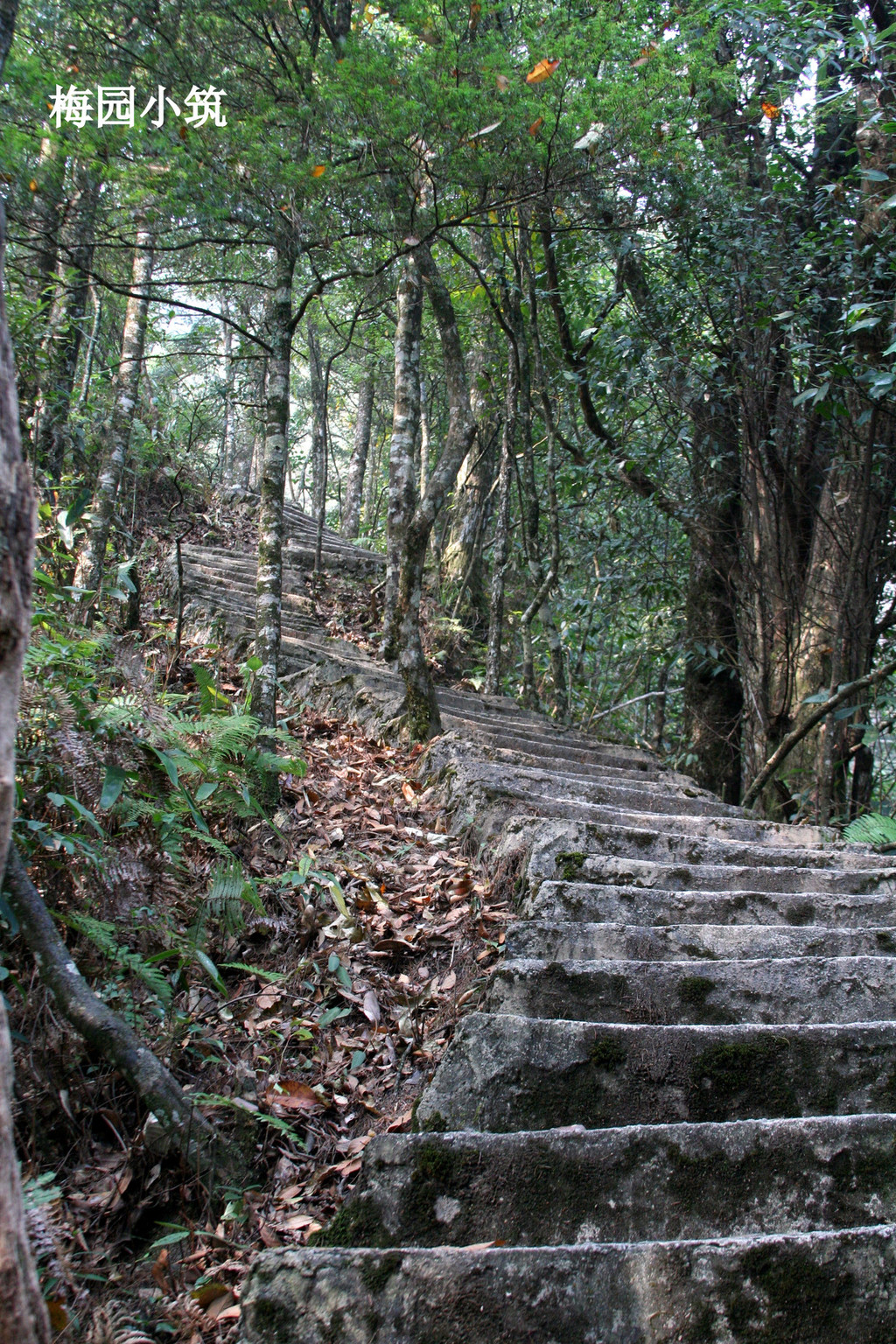 小黄山是南岭森林公园里三十多个千米以上的高峰之一。沿山脚而上,常绿阔叶林、针阔混交林、高山矮林随高度变化,不愧其“天然盆景林”的美称。上山的路,是已经铺好的青石板路。一条蜿蜒的山道向上延伸直到隐约在丛林之中。开始爬山的时候,已经是中午十二点,其实我们并不知道这上山的路就要一千多级台阶,否则也不会再没有准备任何粮草的情况下就冒冒然登山了。