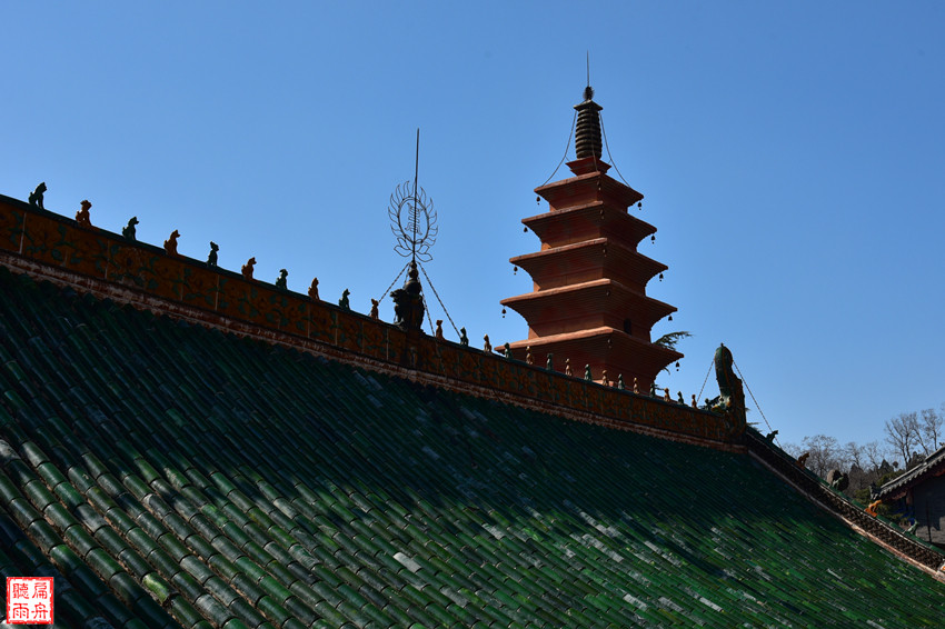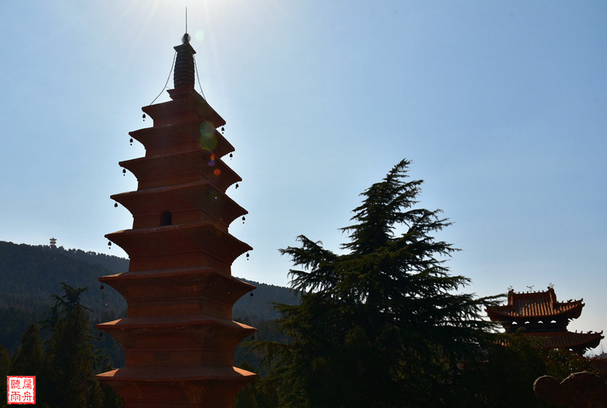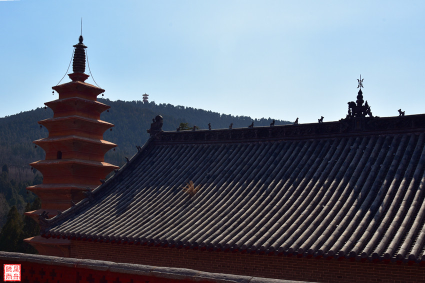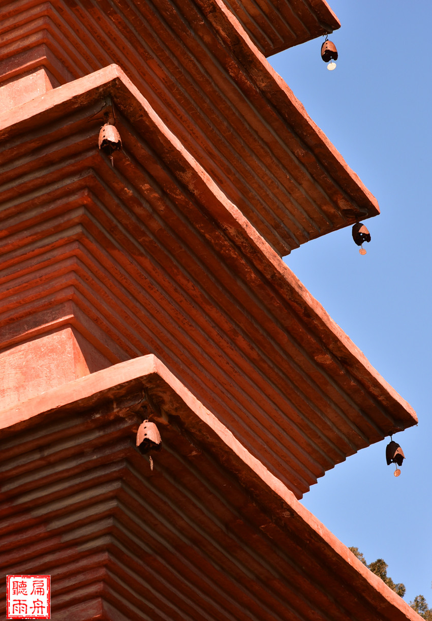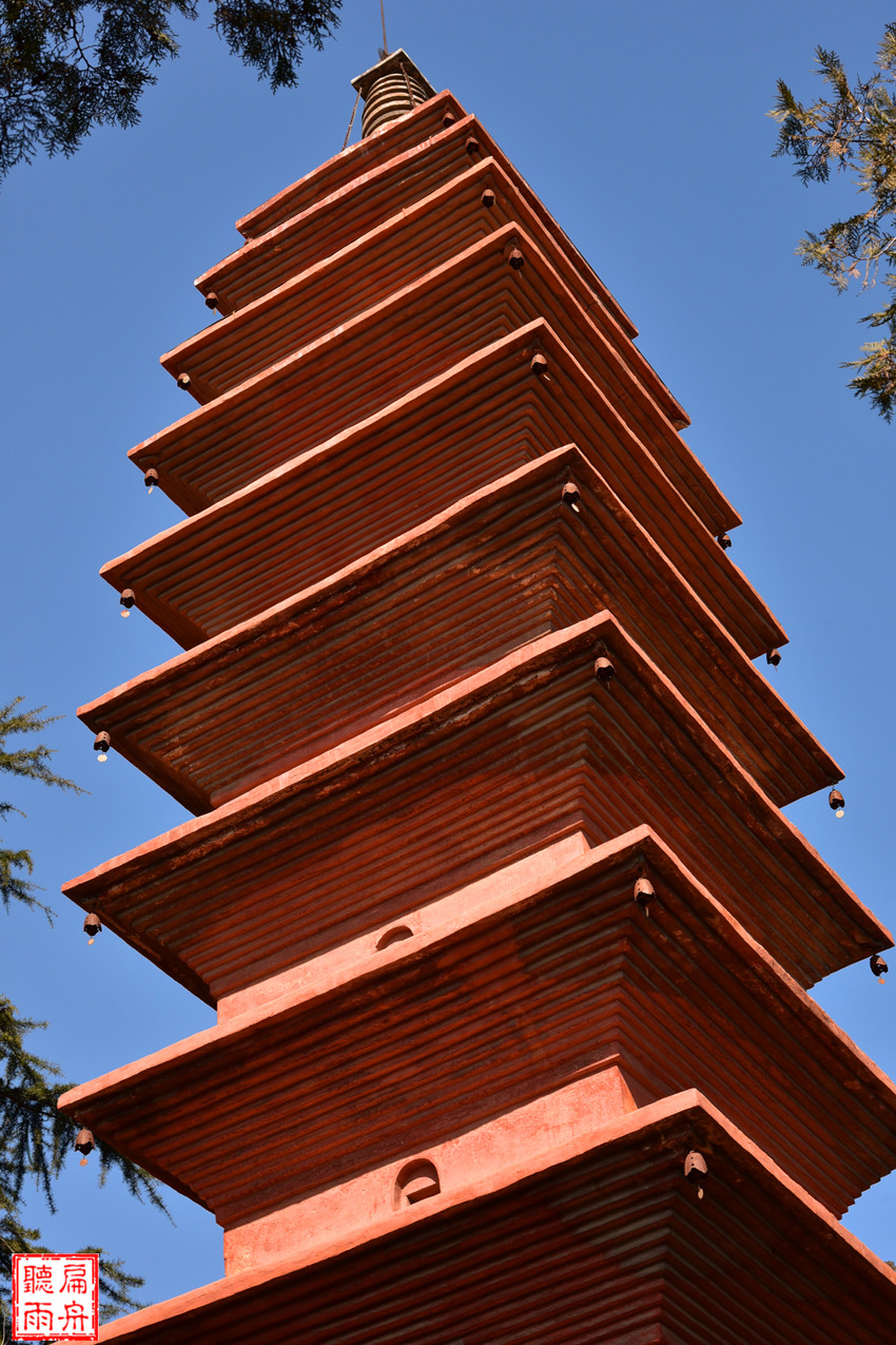 若论寺庙的规模、型置以及建筑风格的多样性,风穴寺更是出类拔萃,出其右者鲜见。风穴山口,两山夹道,万木葱茏,流水潺潺。迤俪北行3华里,方能发现寺院,确有“深山藏古寺”“曲境通幽处”的诗情画意。寺内现存最古老的建筑是唐开元二十六年(738年)建造的七祖塔,由唐玄宗赐名,供奉佛教禅宗七祖贞禅师的舍利。塔高22米,为九层方形密檐式砖塔,外廓呈梭形曲线,每层均悬挂风铎。塔刹由覆钵、相轮、宝盖和火焰组成。整个塔造型优美,比例匀称,是中国现仅存的7座唐塔之一。