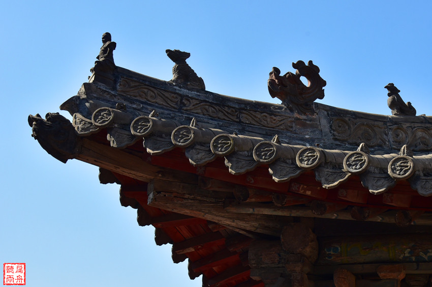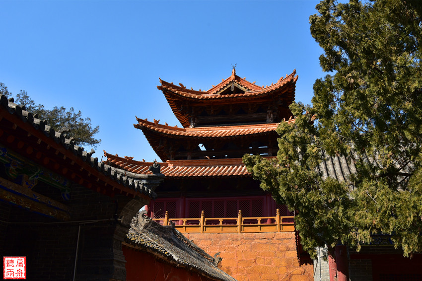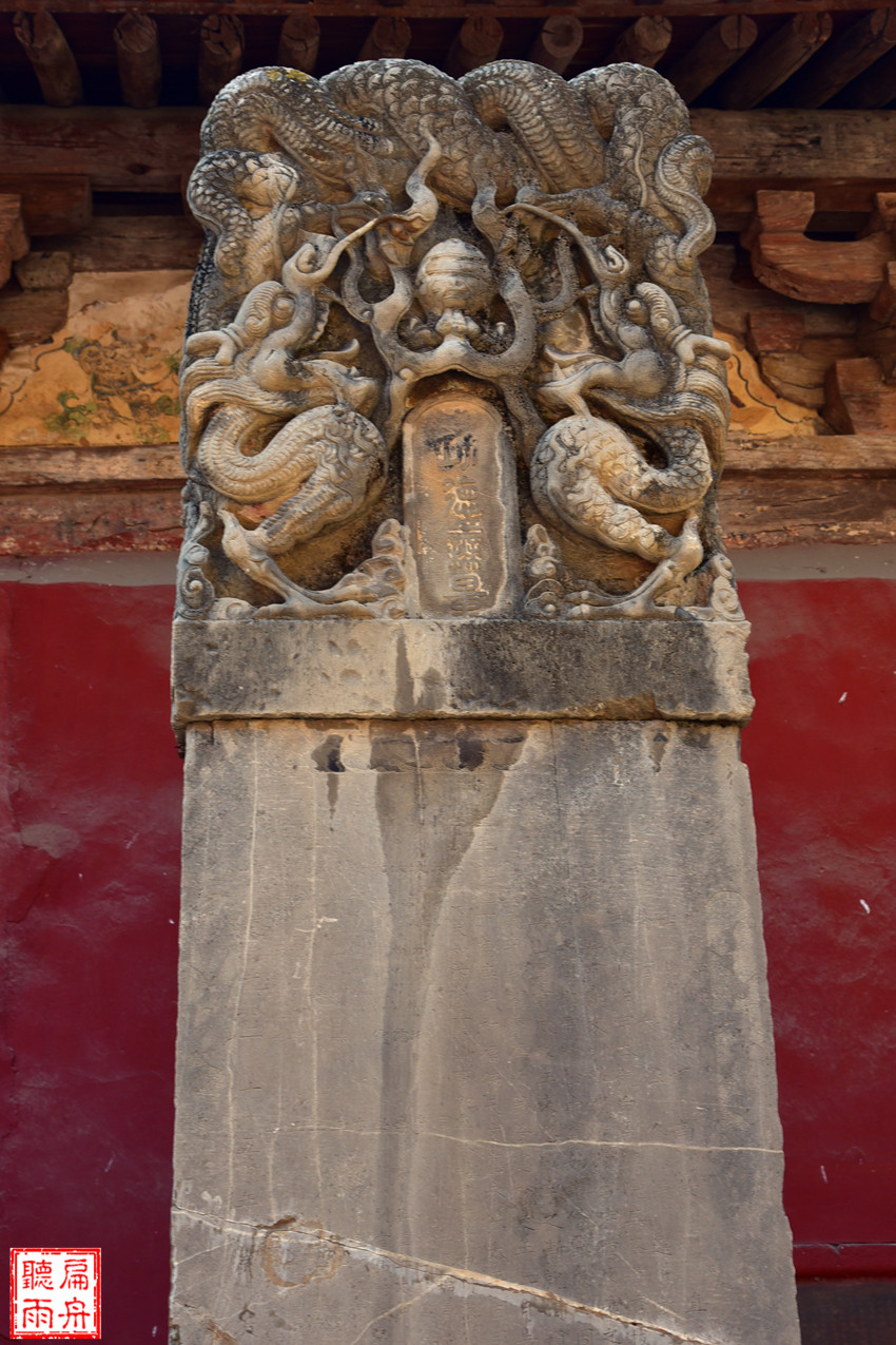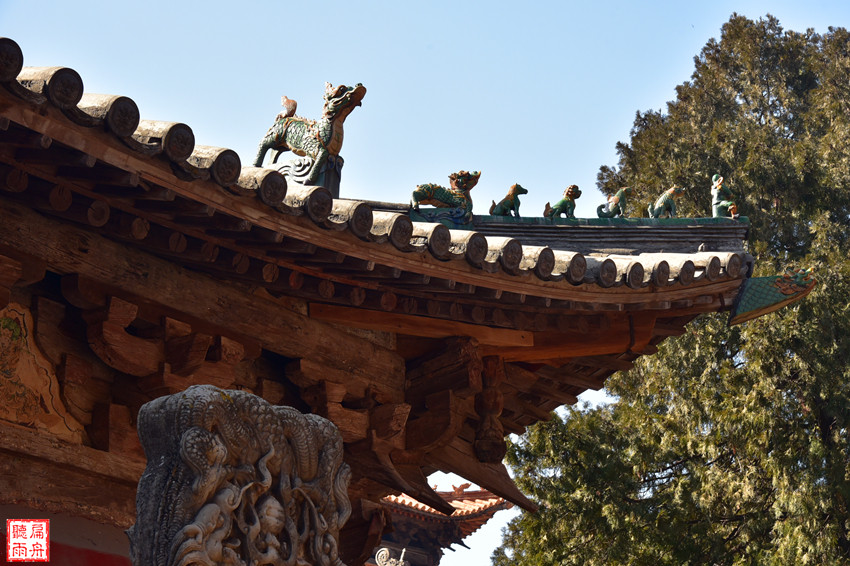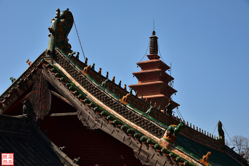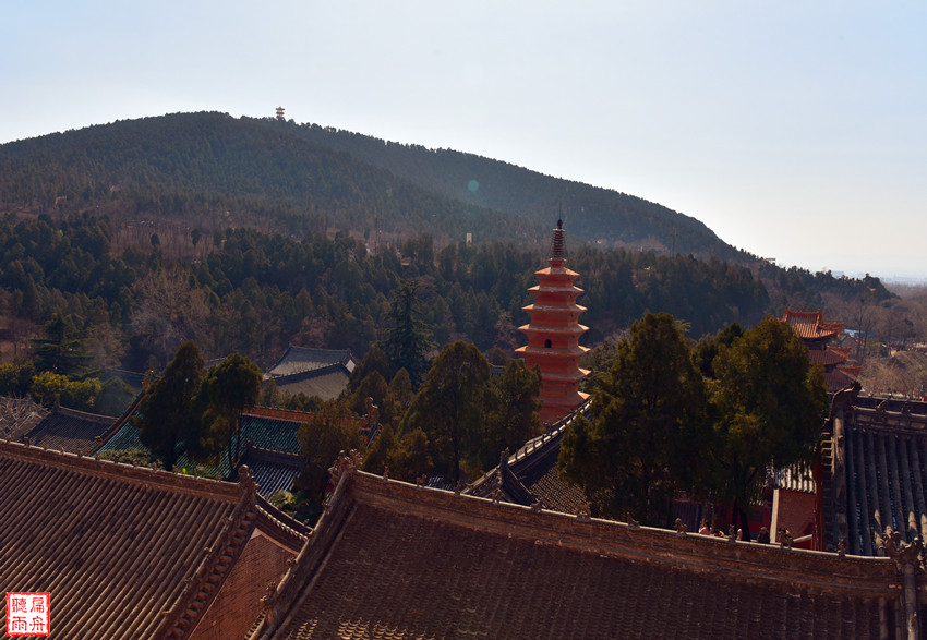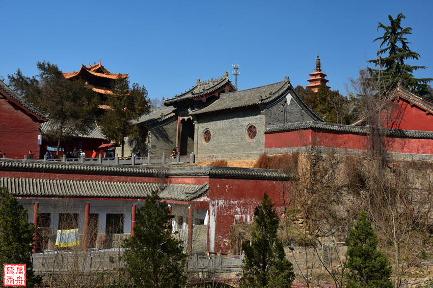 若论寺庙的规模、型置以及建筑风格的多样性,风穴寺更是出类拔萃,出其右者鲜见。风穴山口,两山夹道,万木葱茏,流水潺潺。迤俪北行3华里,方能发现寺院,确有“深山藏古寺”“曲境通幽处”的诗情画意。寺内现存最古老的建筑是唐开元二十六年(738年)建造的七祖塔,由唐玄宗赐名,供奉佛教禅宗七祖贞禅师的舍利。塔高22米,为九层方形密檐式砖塔,外廓呈梭形曲线,每层均悬挂风铎。塔刹由覆钵、相轮、宝盖和火焰组成。整个塔造型优美,比例匀称,是中国现仅存的7座唐塔之一。