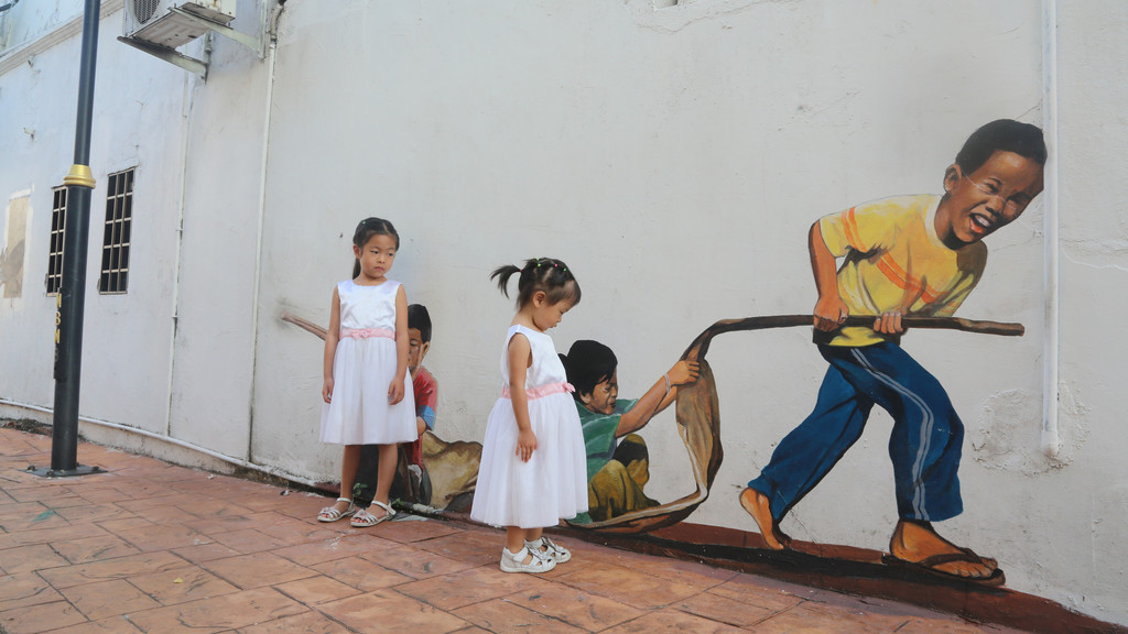 晚上和老公外出暴走1公里,看了马六甲沿河夜景,还真是不错,它和槟城同时申请的世界遗产,老房子上有很多壁画,挺特别的。回到酒店的时候,俩娃都睡着了,省心。