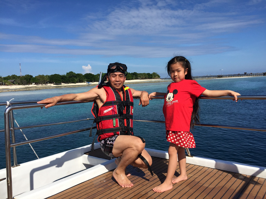 在网上报的一日游的跳岛,因为考虑到老人孩子,选择了略贵一点的小游艇旅游团,天域马达号,是11人的小团。其实最想参加的是lan猫家的高级游艇(500多一人,但是他们很严格,60岁以上都不收。