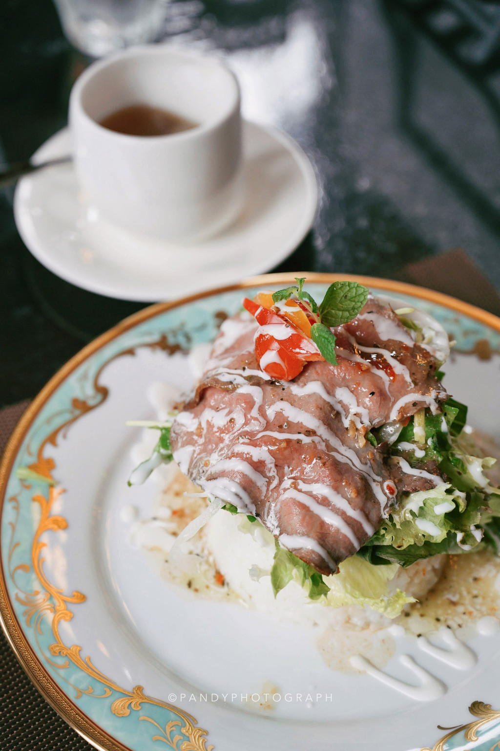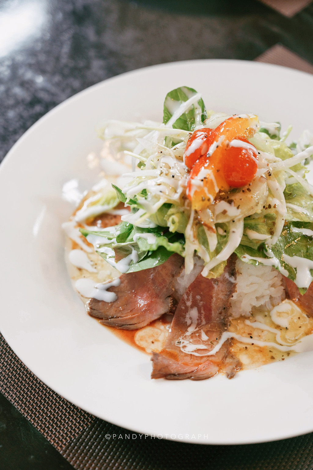 餐厅以日式西餐与甜点为主,其中一定要品尝的就是只有午餐时间才能点单的招牌饭:「西西里饭」。在米饭上包着佐贺牛烤肉,满满的蔬菜放在饭上,最后再淋上美乃滋与特制酱料,吃上一口,鲜嫩的牛肉口感十足。再加上解腻的蔬菜让烤肉油而不腻。