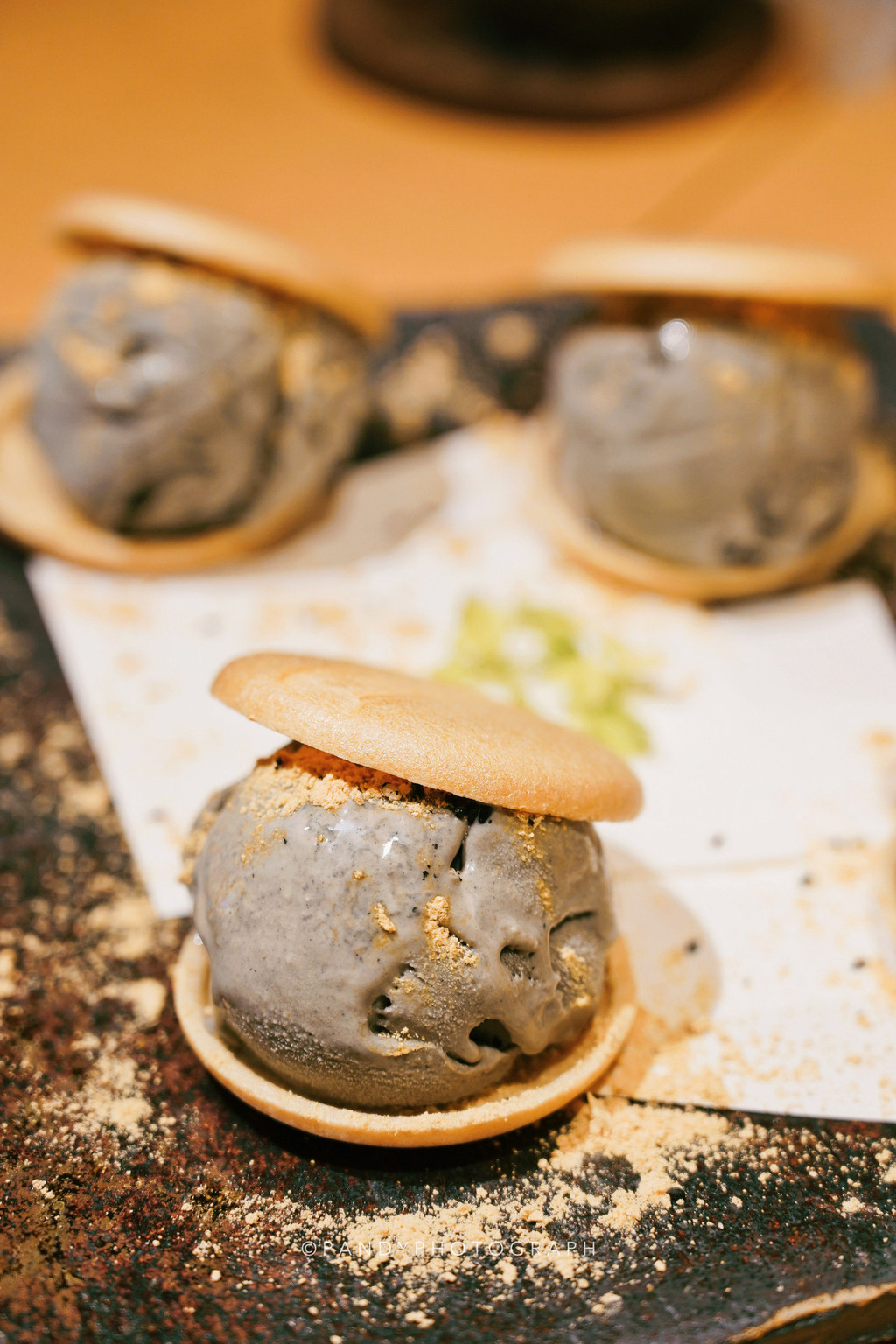而撒上了7种不同香料的有烤鸡肉串,“有田鸡”软嫩的肉质与层次分明的7种味觉,让Pandy品尝到了另一种鸡肉的美味。另外比较难忘的是炸天妇罗、黑芝麻冰激凌还有日本酒味的布丁。