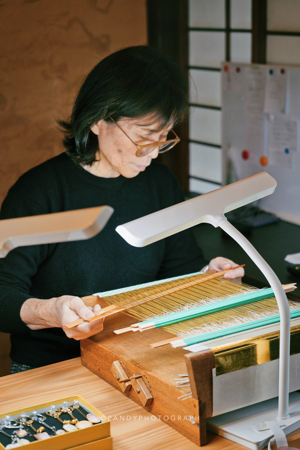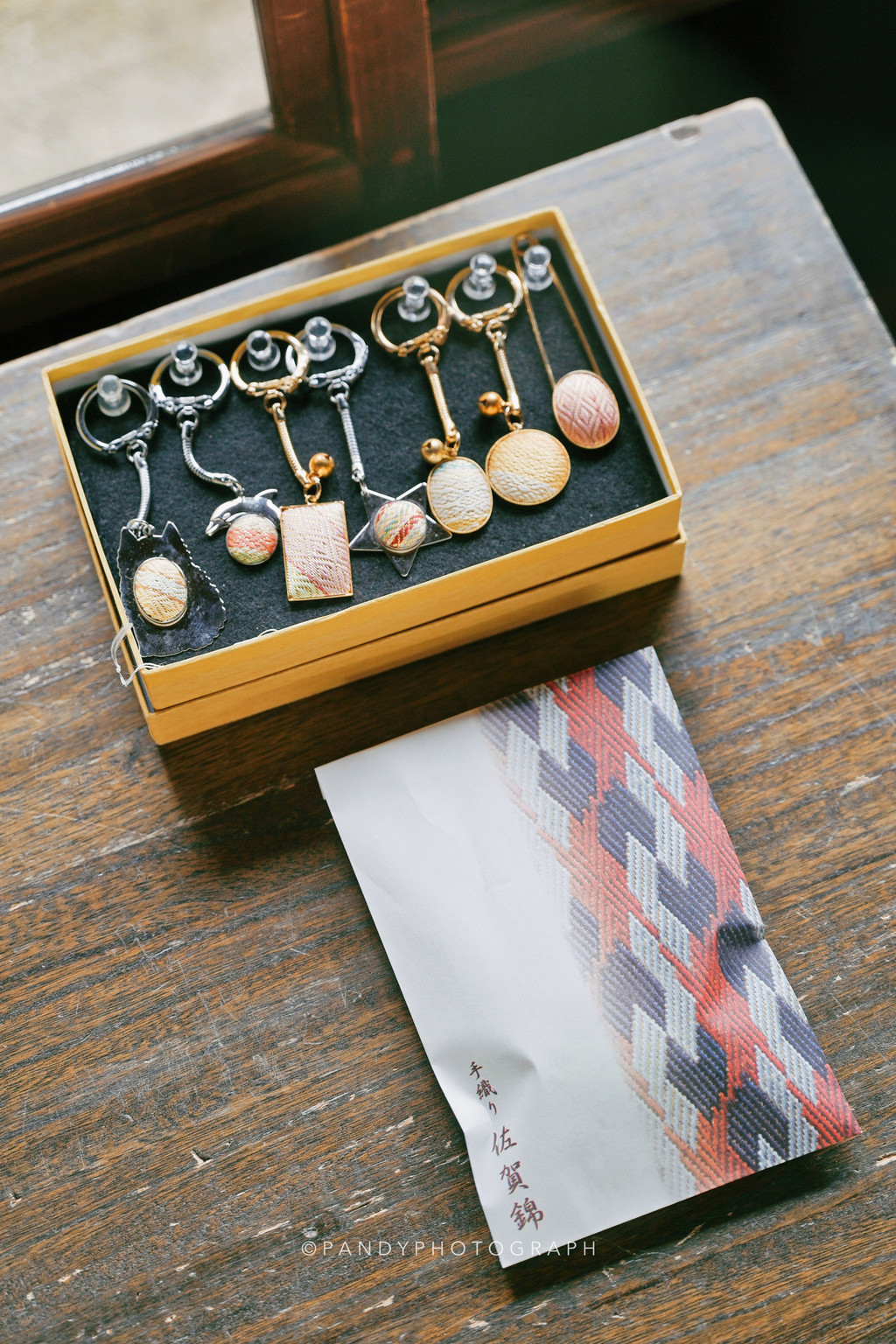 在旧福田家里就可以看到专业的工作人员正在编织,也可以自己体验一次「佐贺锦」的手工工艺哦。因为非常细致,对专注度要求很高,我体验了十几分钟,也就编了2排而已,真是很佩服日本的匠人精神。编织完的「佐贺锦」可以做成钥匙扣、胸针、首饰等,也会做成日本娃娃的衣服,非常精美哦。