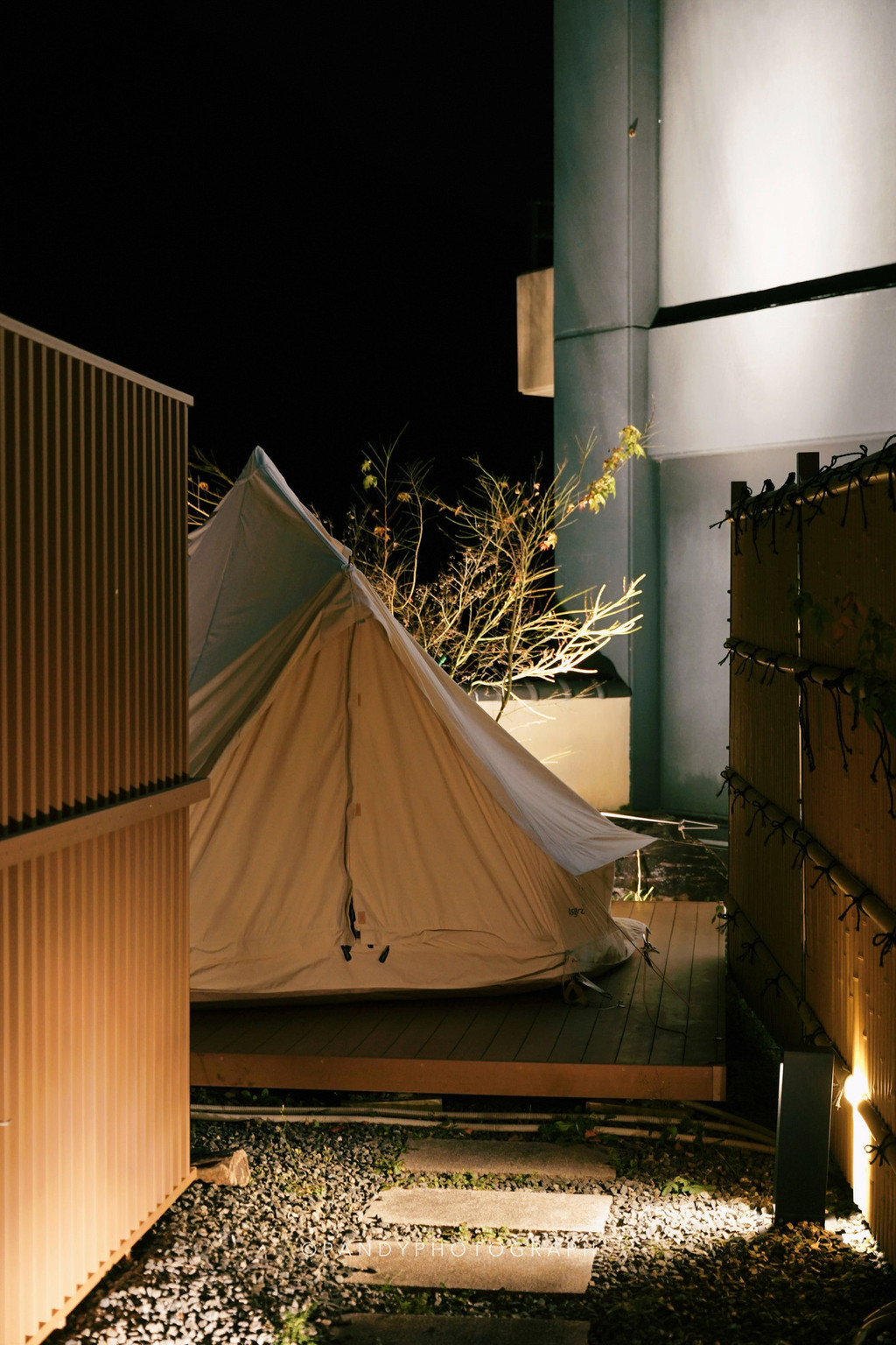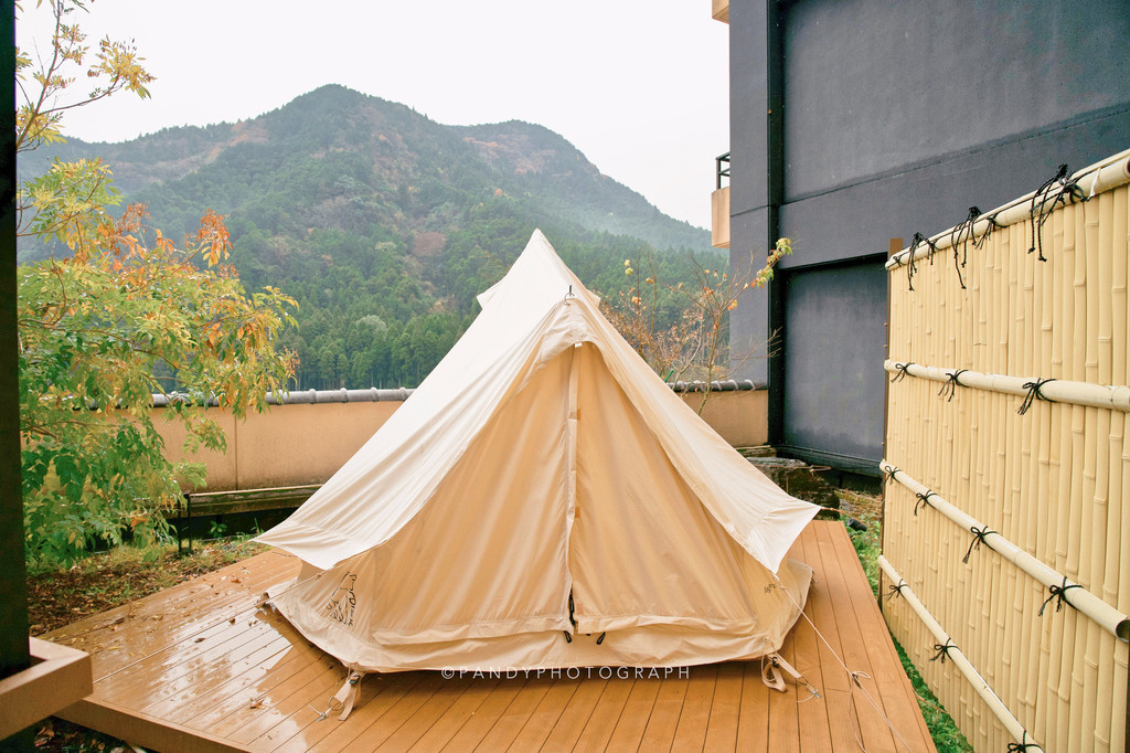 酒店的客房除了日式客房外,还有住在帐篷如同野营般的露台房,就是我这次居住的洋式客房。打 开阳 台的房门穿过日式庭院步道,就有搭好的帐篷和露营设备,而帐篷的背后是山林美景,让人不用辛苦地背着器材也能体验到野营的乐趣。