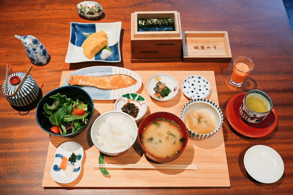 酒店的餐点也很值得一尝。餐厅里传统的家具有序的陈列着,落地窗外是庭院里营造的四季美景。以佐贺当地食材为主,根据四季不同而变换的菜谱。佐贺牛、有明海鱼、佐贺蔬菜,搭配佐贺在地知名的「有田烧」餐具好食材、好手艺与好餐具一应俱全。