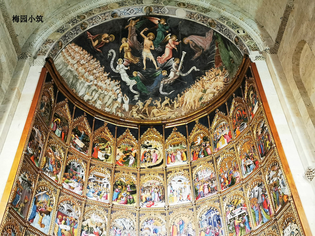 新的大教堂风格多样,哥特式、文艺复兴式、巴洛克式相继出现。旧的大教堂是罗马式的古建筑,倍受人宠爱与尊敬,人们都尽可能地保护它,使它更华美。处于旧大教堂深处的寂静中,不禁有想要与上帝对话的渴望,并希望归属于此。想着那举行盛大典礼,富丽堂皇的新大教堂,突然意识到了人类的渺小,世界的复杂。教堂内15世纪的祭坛画尤为醒目,由53块木版画拼组而成,讲述了基督与圣母玛利亚的故事。壁画的上方挂了《最后审判》