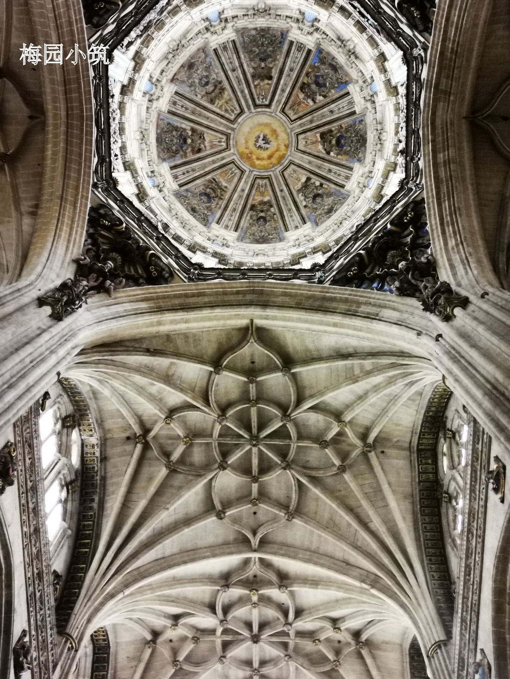 两个教堂是连在一起的,萨拉曼卡新大教堂的建筑艺术风格是以晚期歌德混合巴洛克为主,结合西班牙本土自有的仿银器装饰风格,很独特,真可以称得上是人造的华丽天堂,只要一进门,马上被如此高耸深邃的教堂震撼了;西班牙的教堂都是高大而雄伟的,查过西班牙教堂排名,如此壮丽的教堂竟然排不进去前三,足见西班牙教堂文化的厚重了